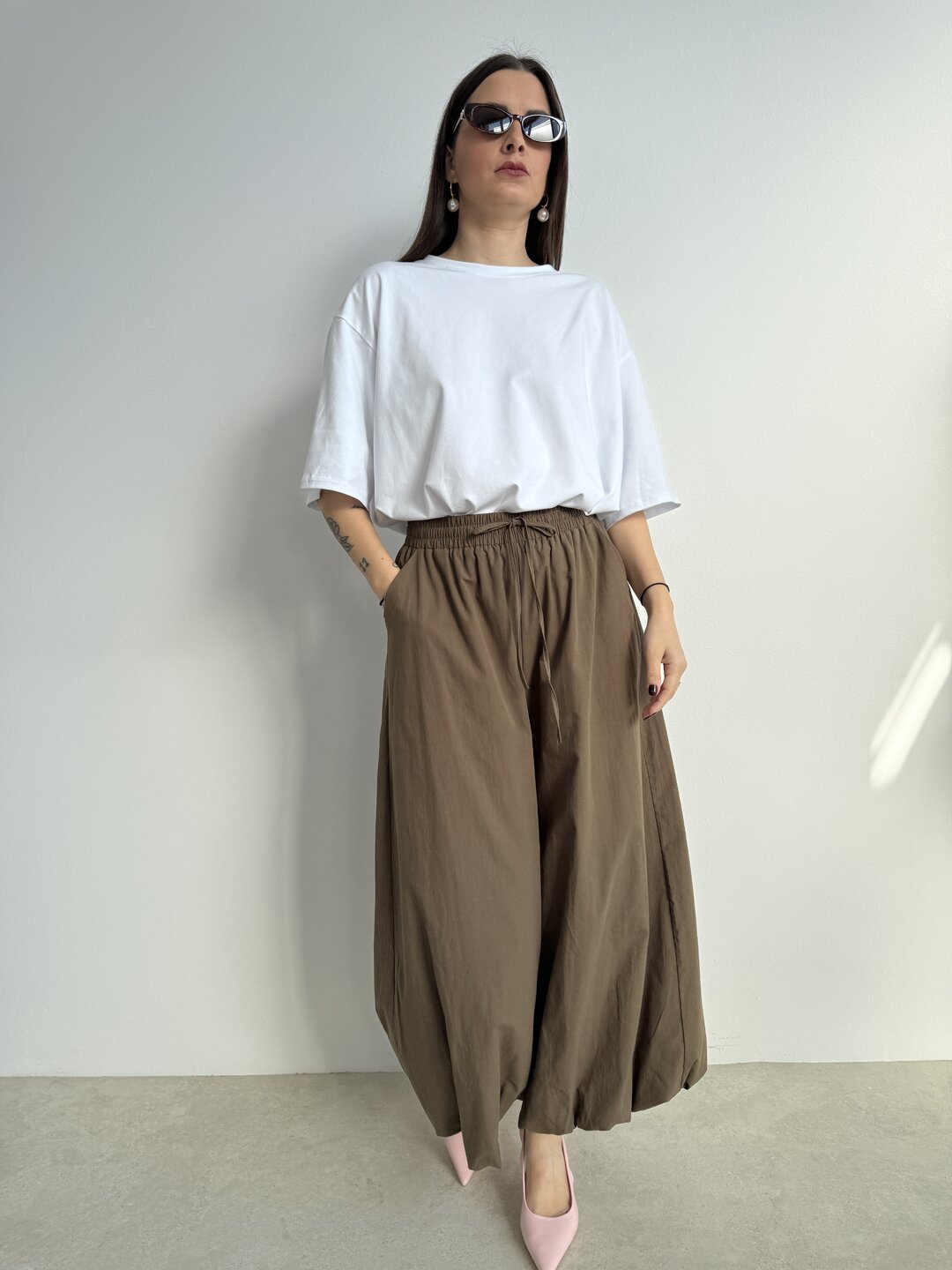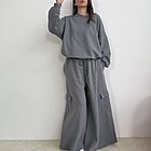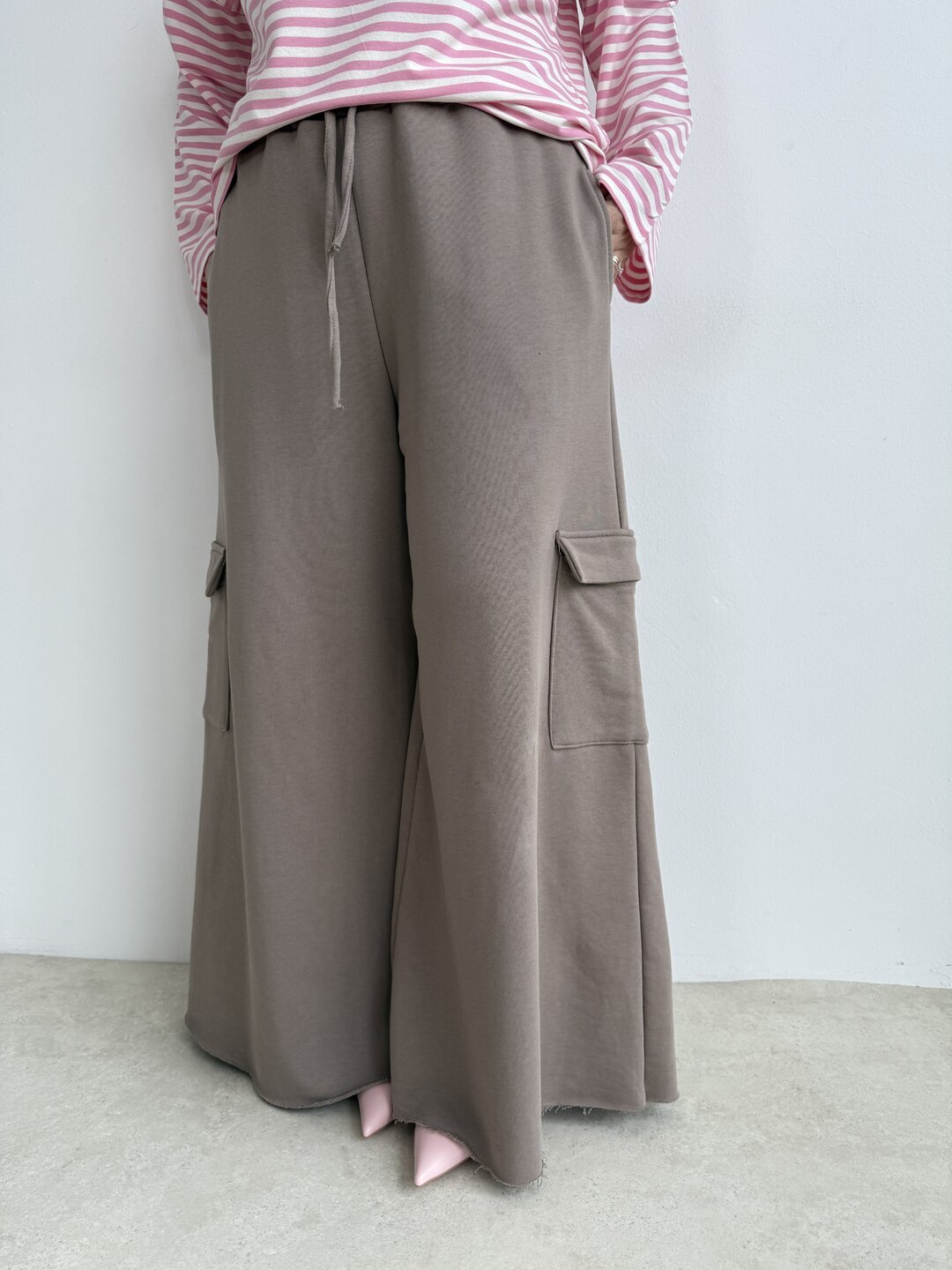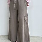 Modello a palazzo con gamba svasata e coulisse in vita. Non rifinito sul fondo. Tascone laterale cargo.