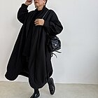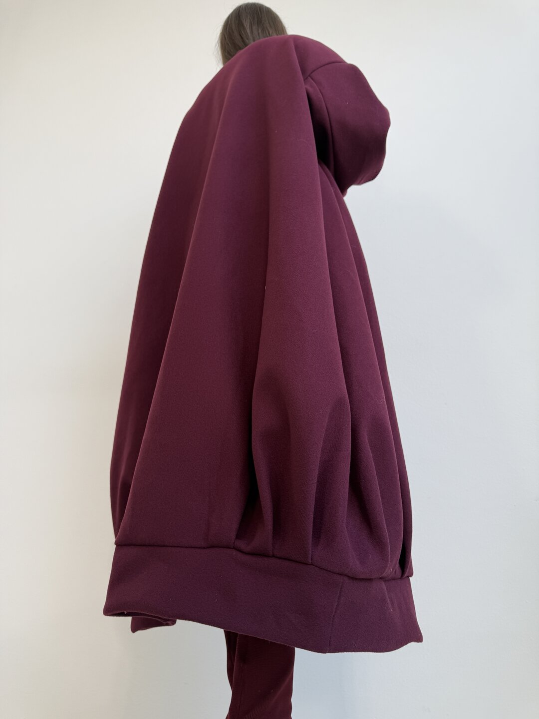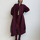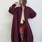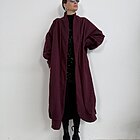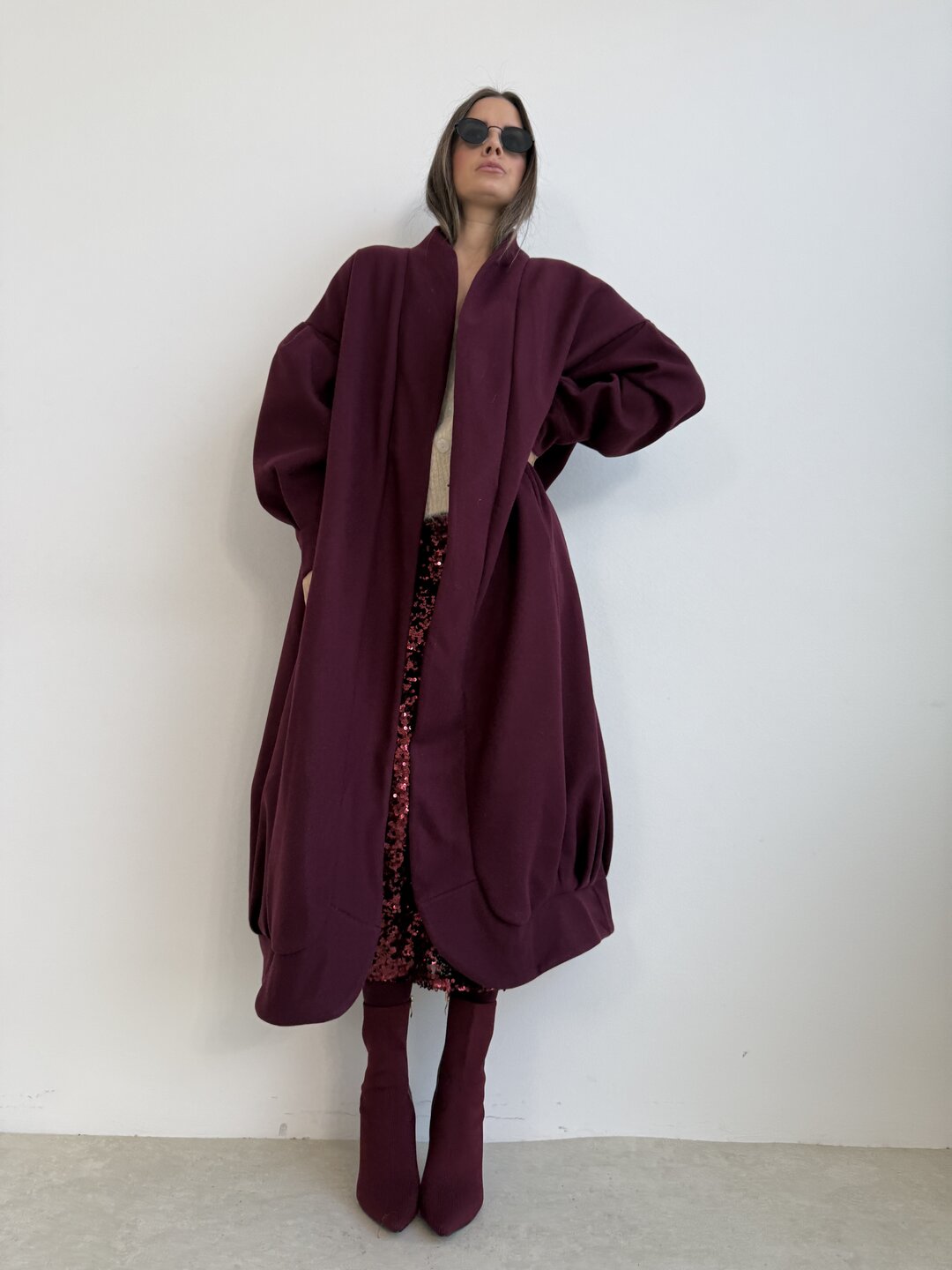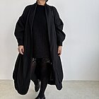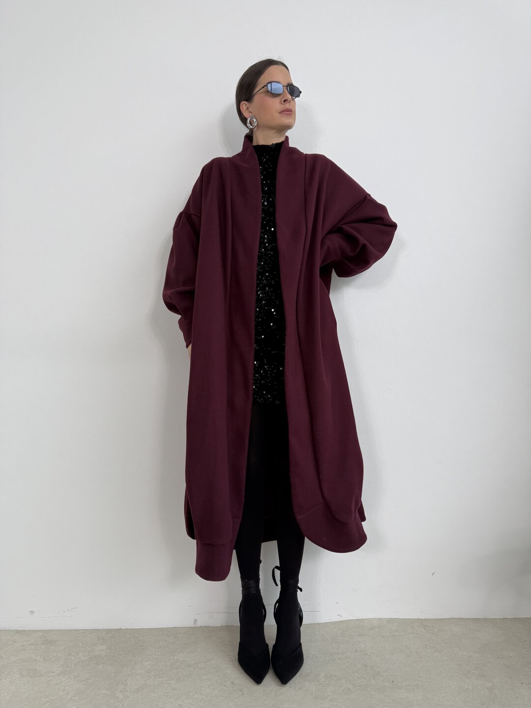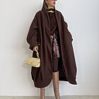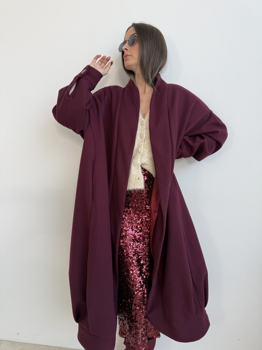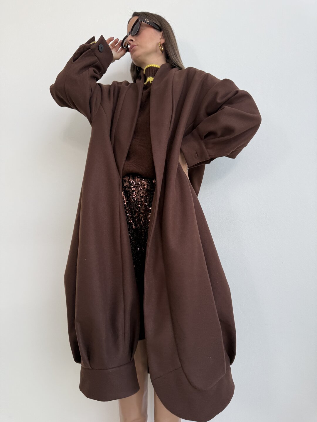 Modello cappotto ovetto long senza allacciatura, foderato con spalla scesa e manica a sbuffo.