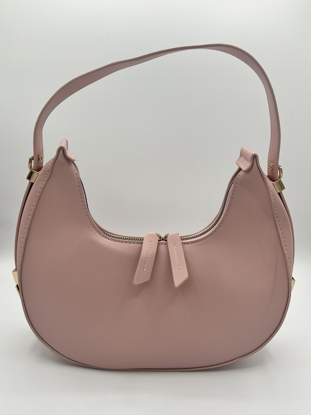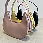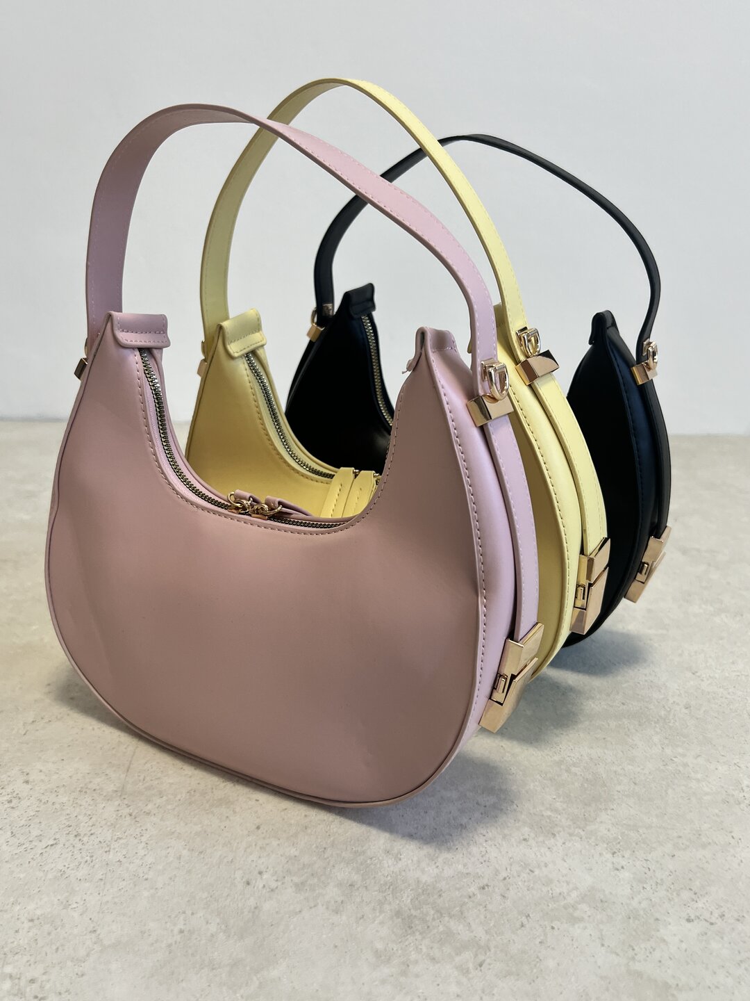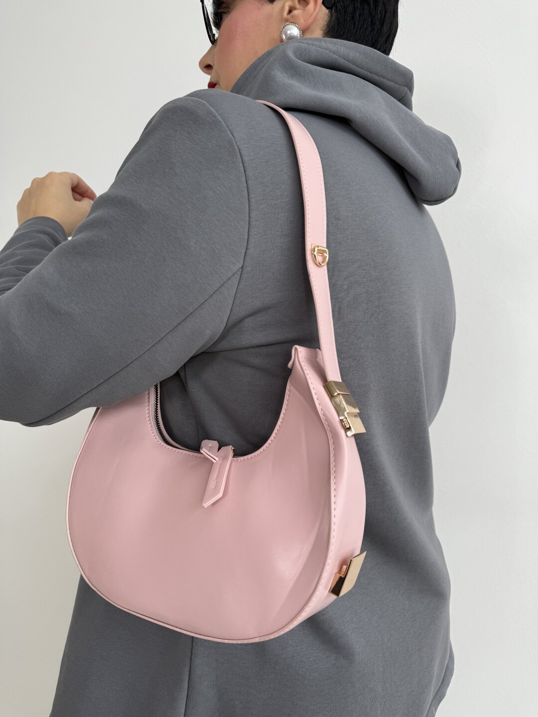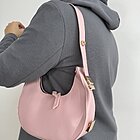 modello mezza luna rigido con manico regolabile e tracolla rimovibile. chiusura con zip.