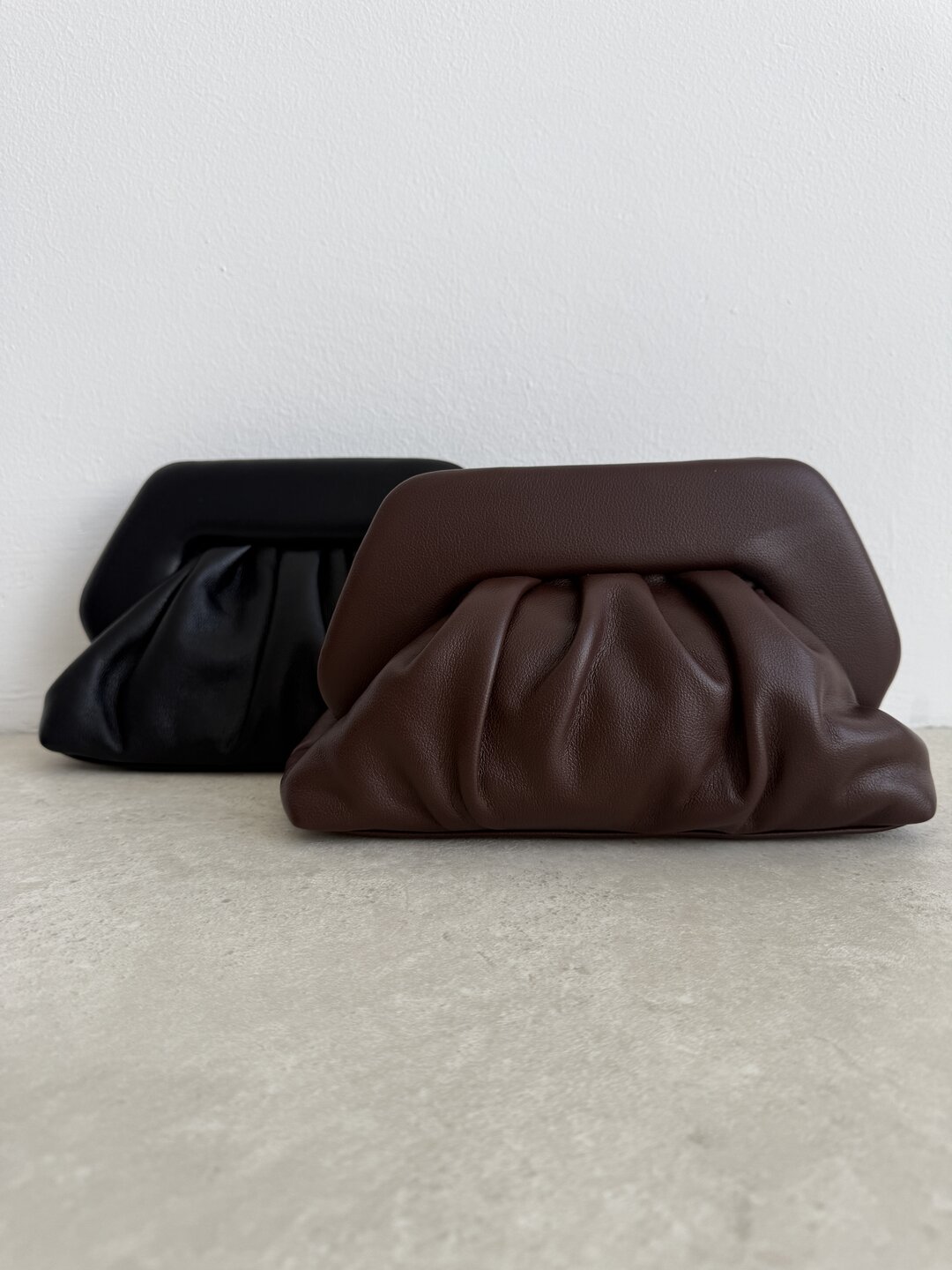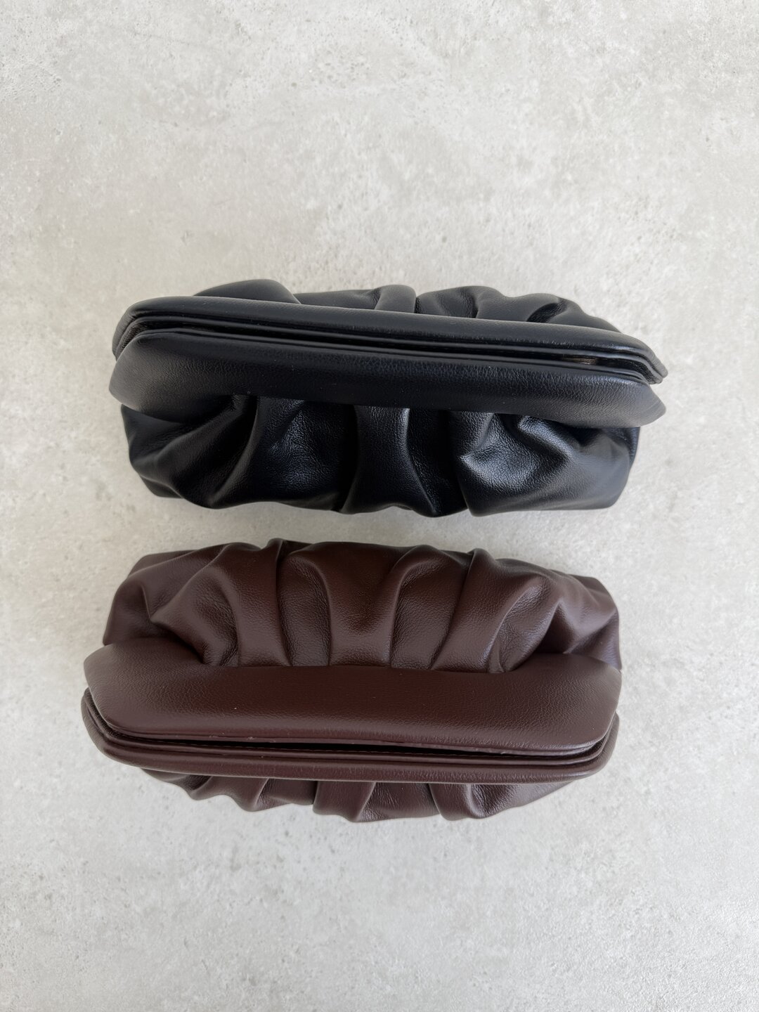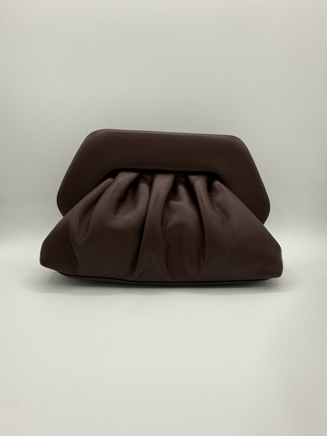 modello clutch effetto nuvola con pinces. Tracolla removibile. Chiusura con bottoni magnetici a scatto.