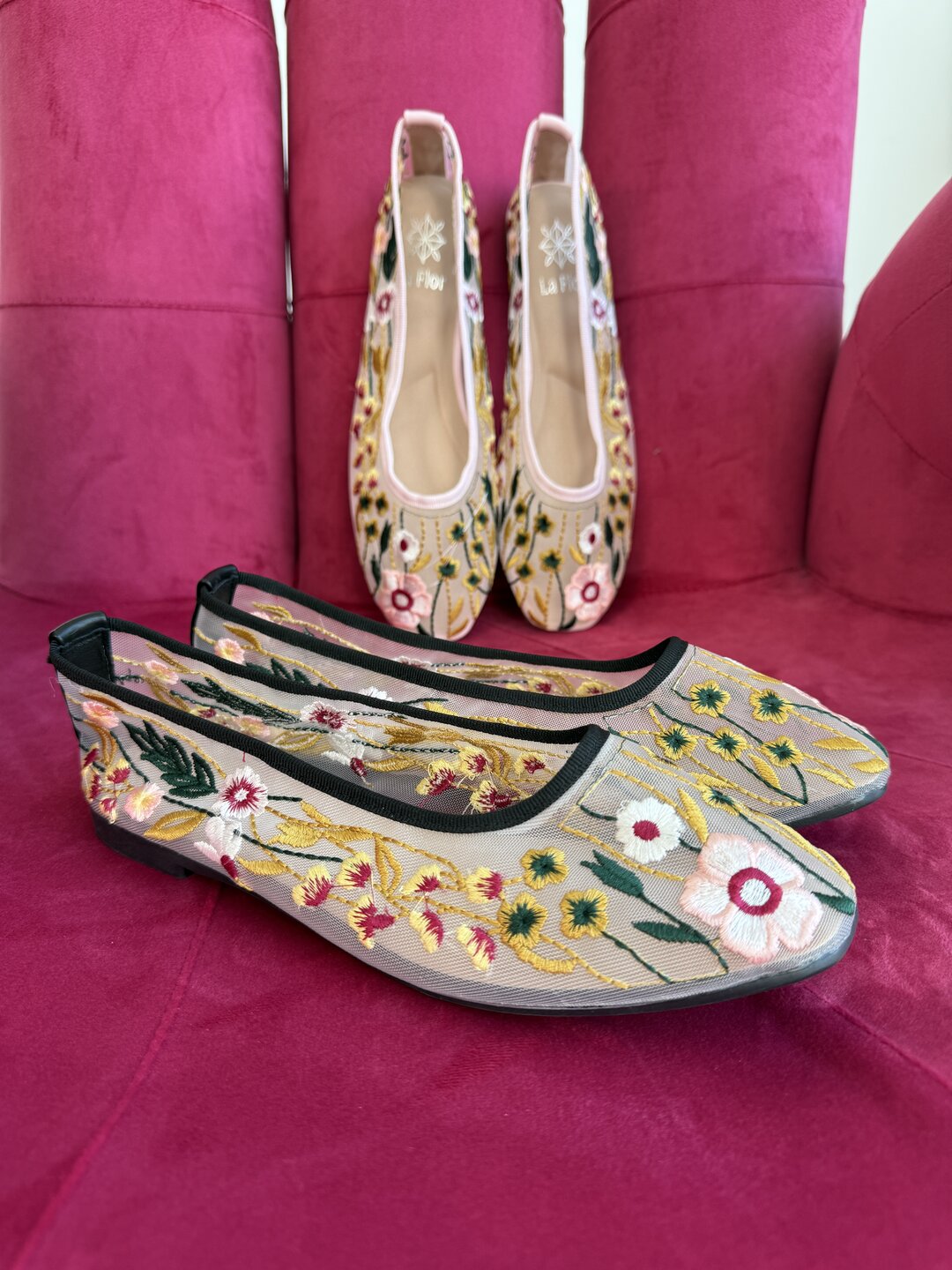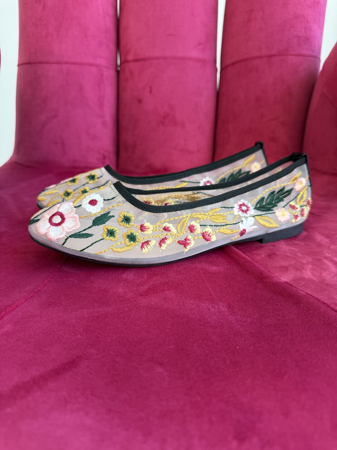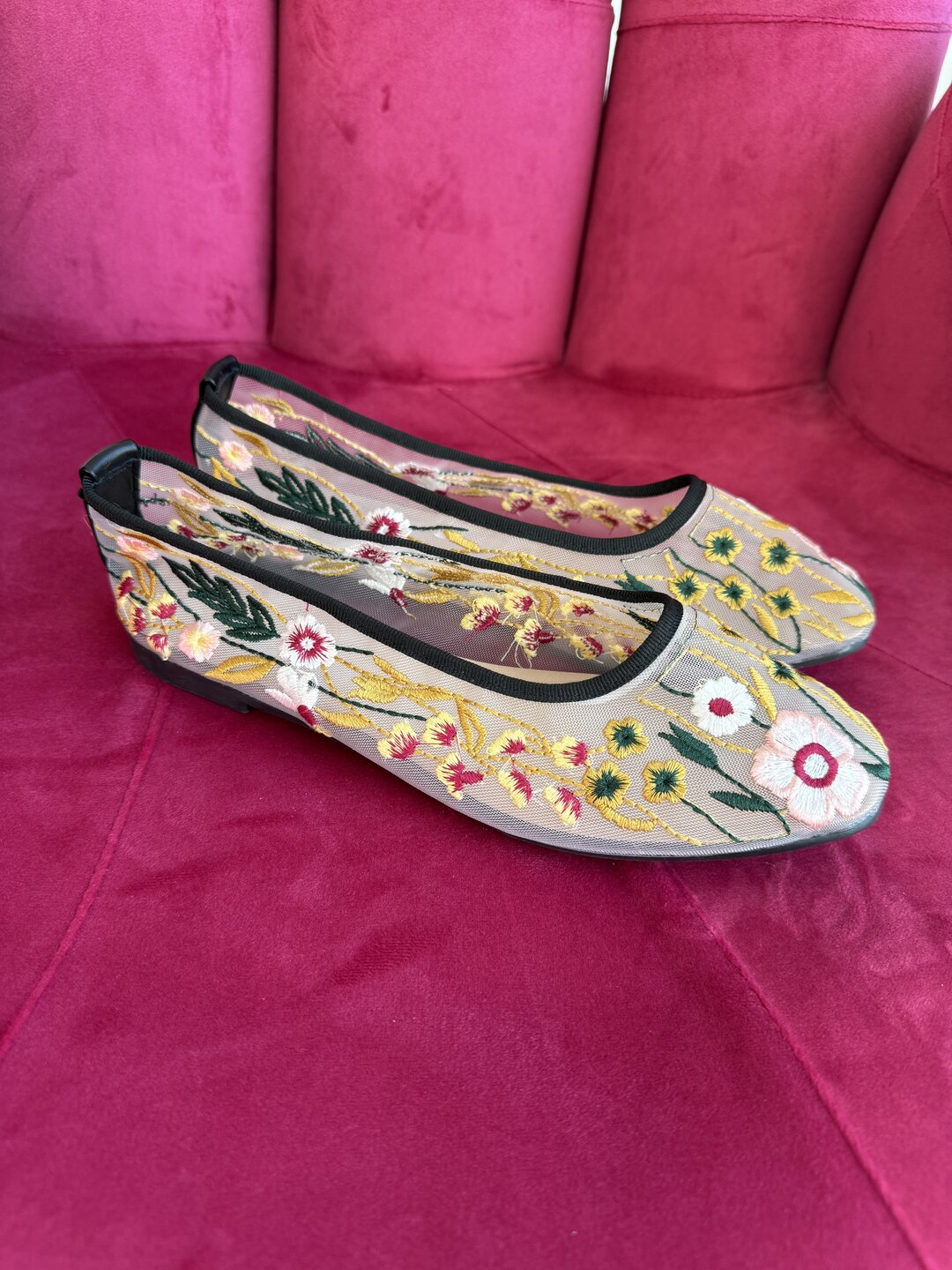 Modello in tule traforato e ricamo colorato, con suola gommata altezza 0.5cm