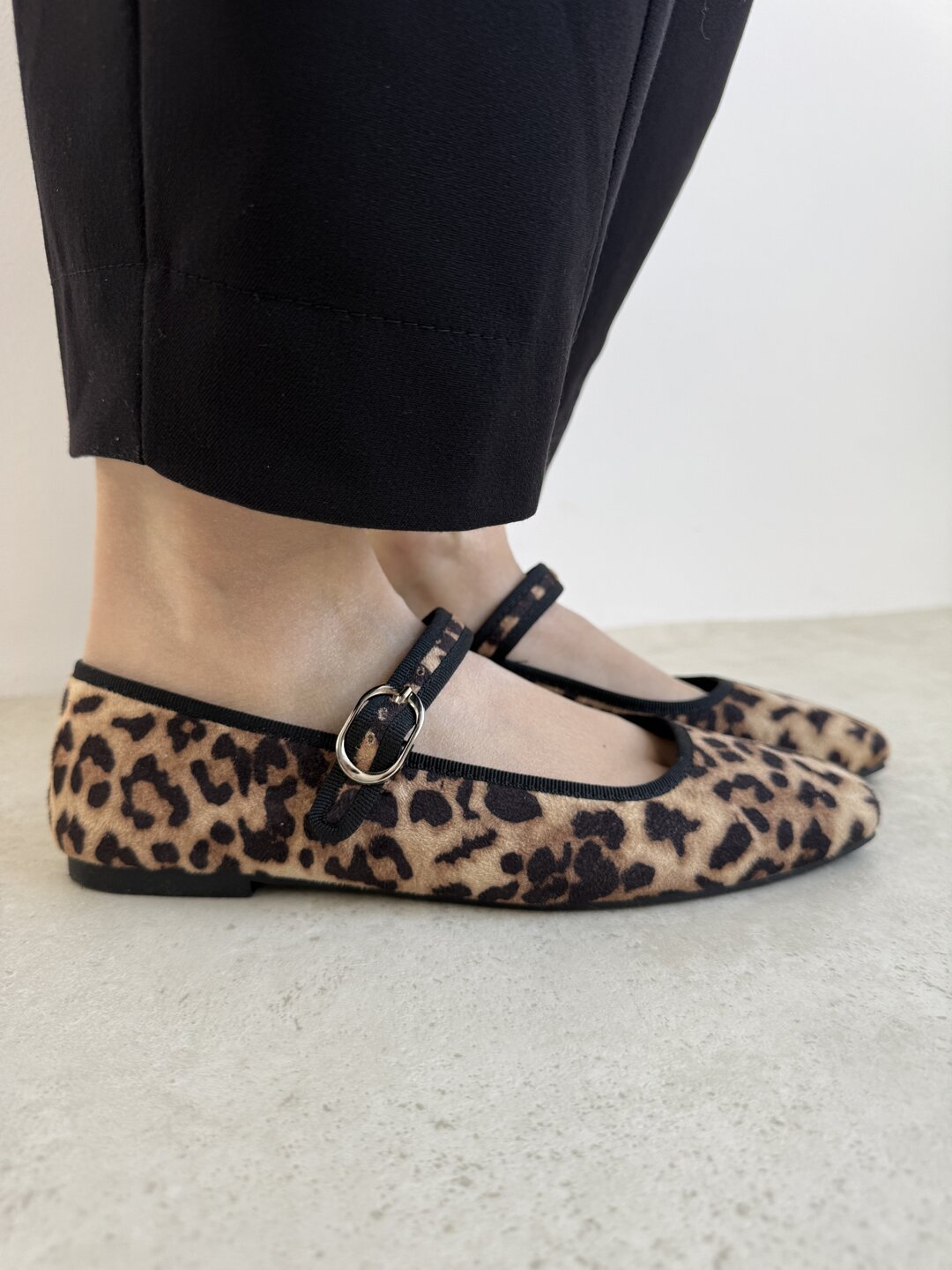 Ballerina modello punta quadrata, cinturino regolabile sul collo. Colore fantasia maculato. numerata disponibile fino al 41 – se si oscilla tra due numeri si consiglia il superiore materiale/composizione sintetico