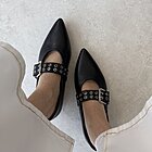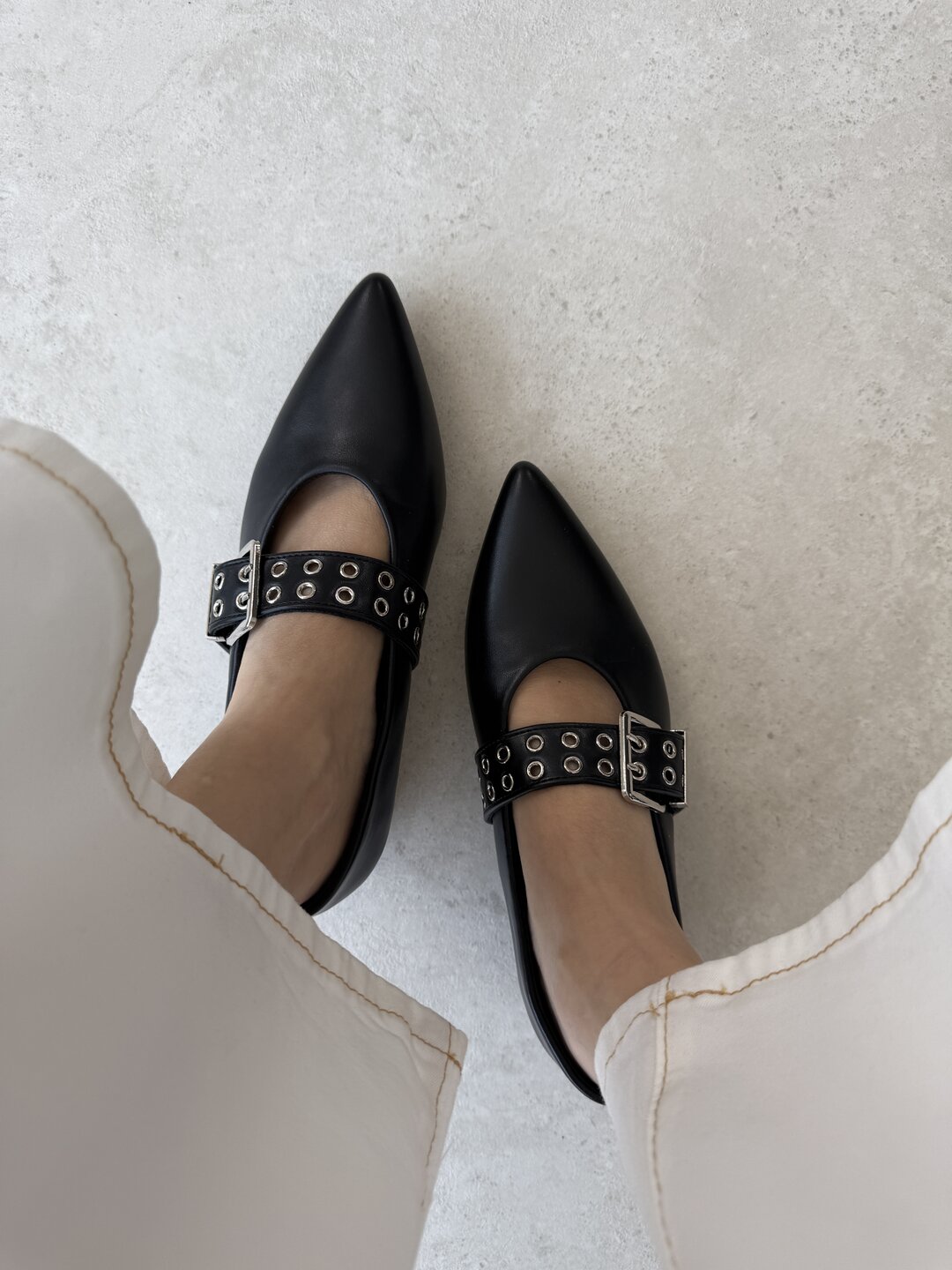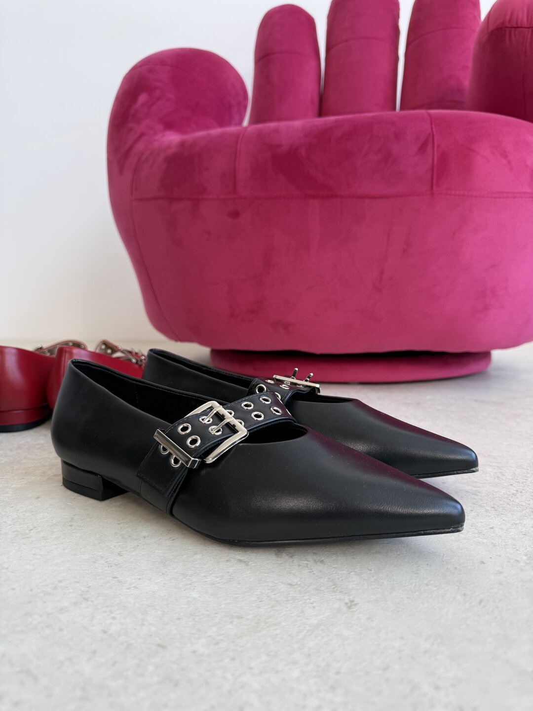Modello a punta e chiusura con cinturino, con suola gommata e tacco rivestito altezza 1.5cm
