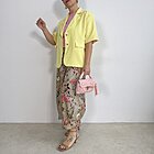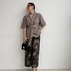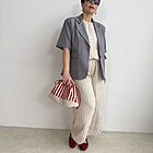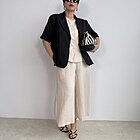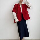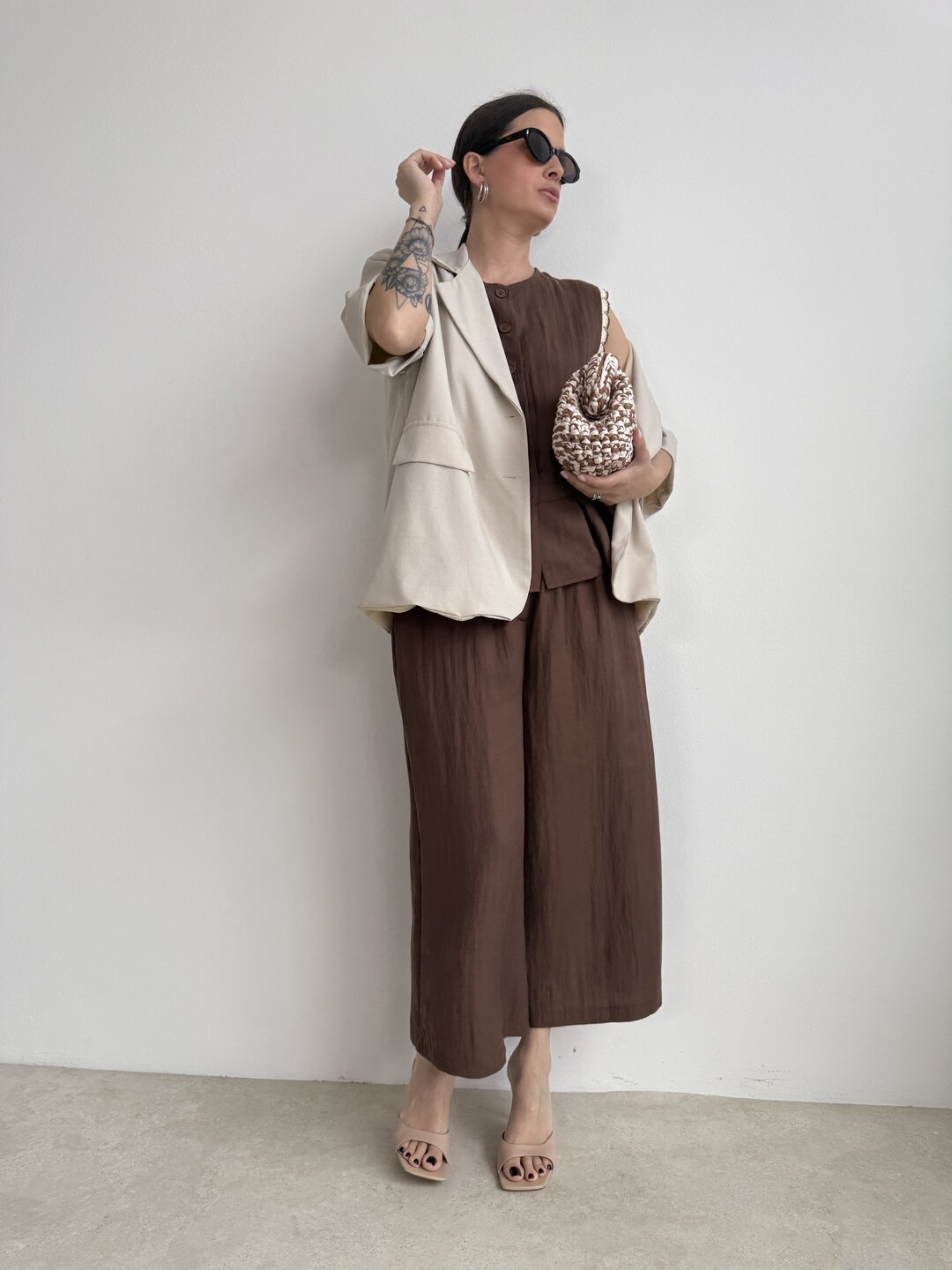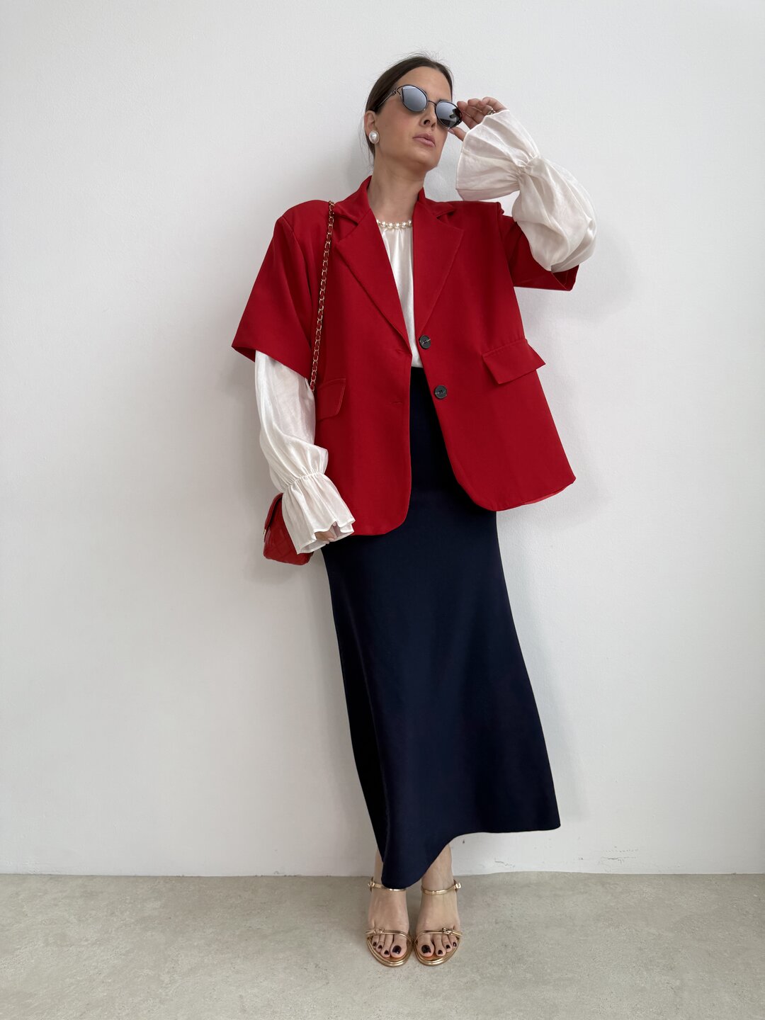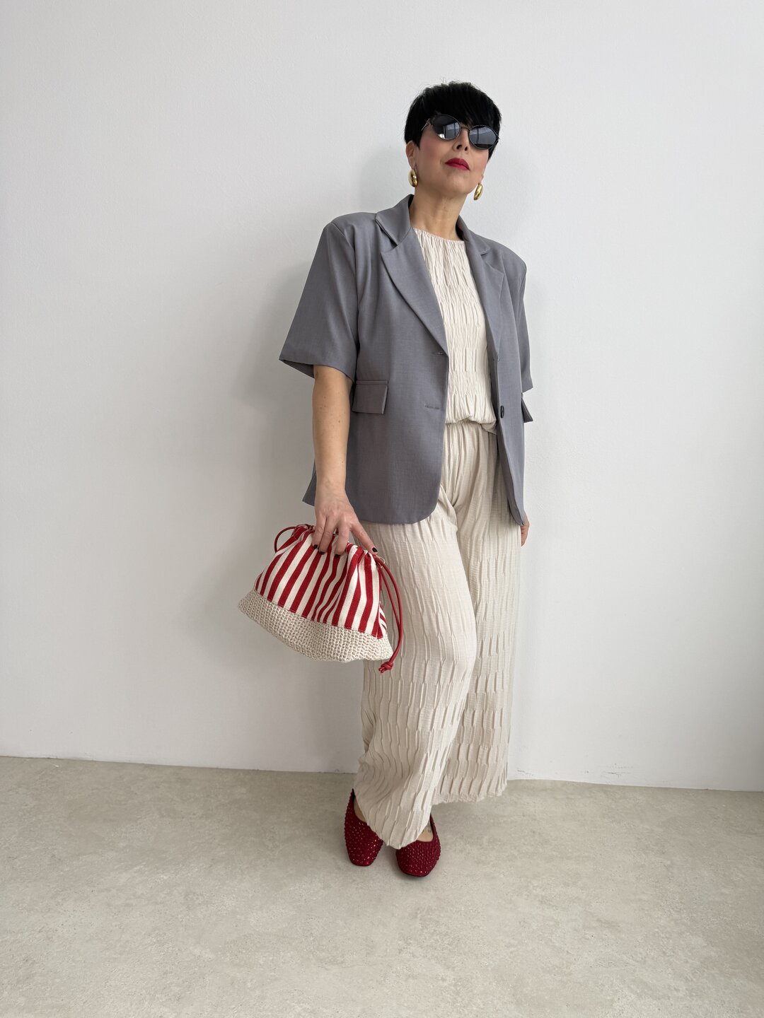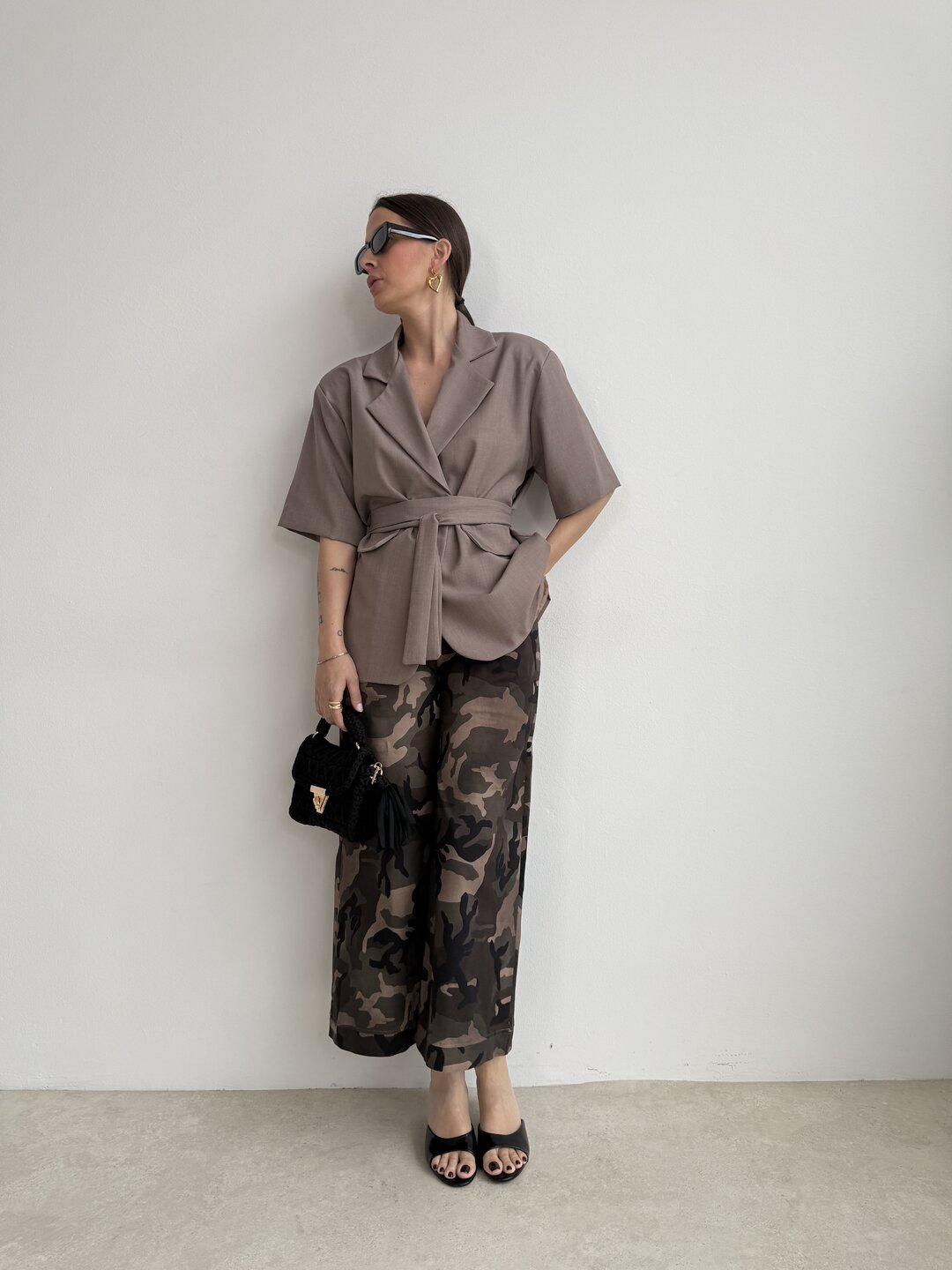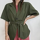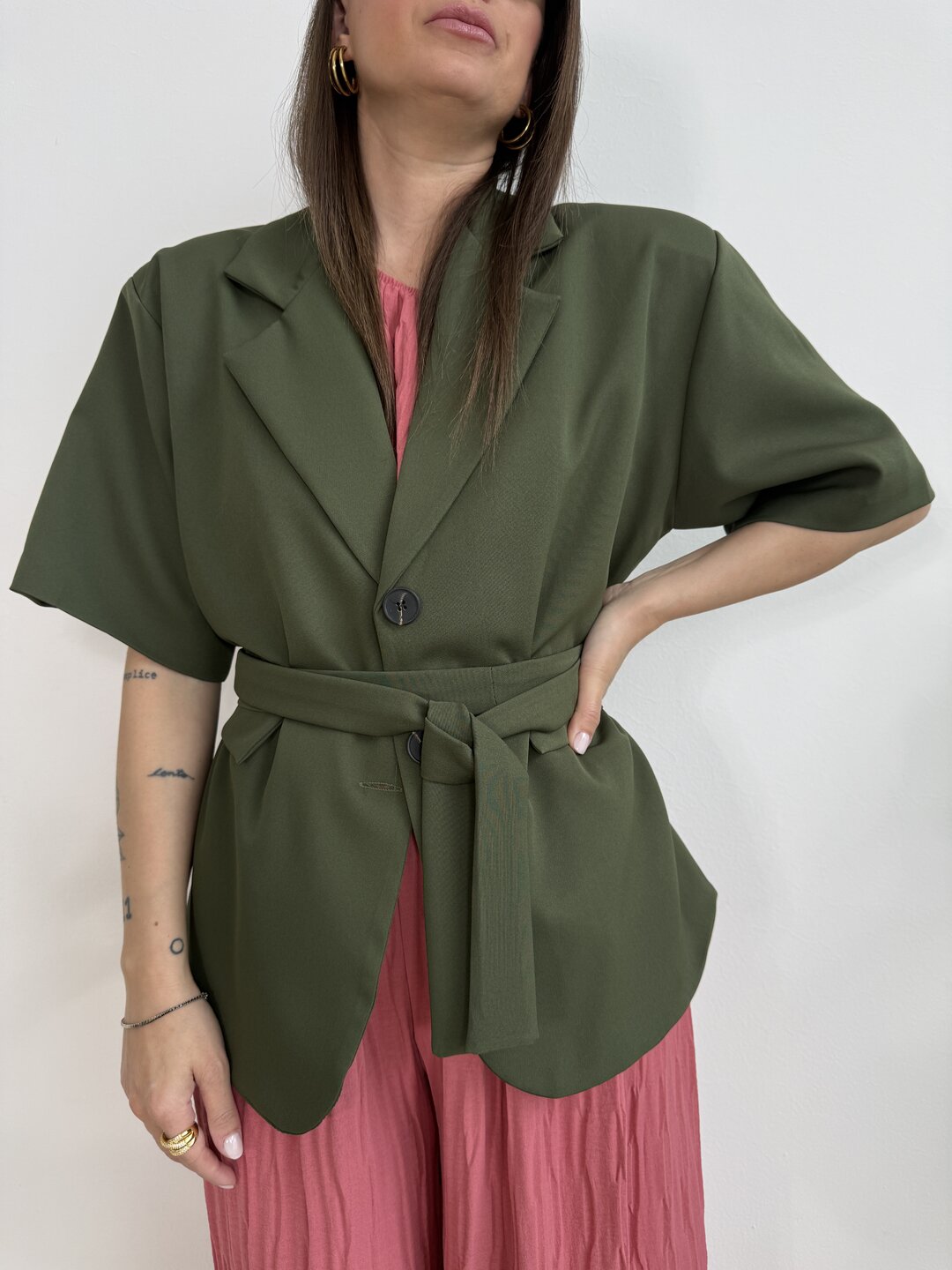 Modello a scatola con manica corta  finta tasca a pattina sul davanti. Spallina applicata e fodera. Dotata di fusciacca gestibile come cinta o altro. No passanti fissi.