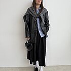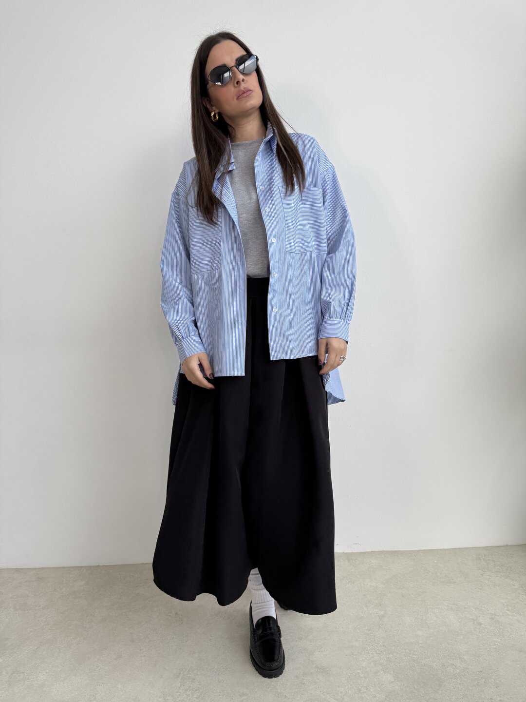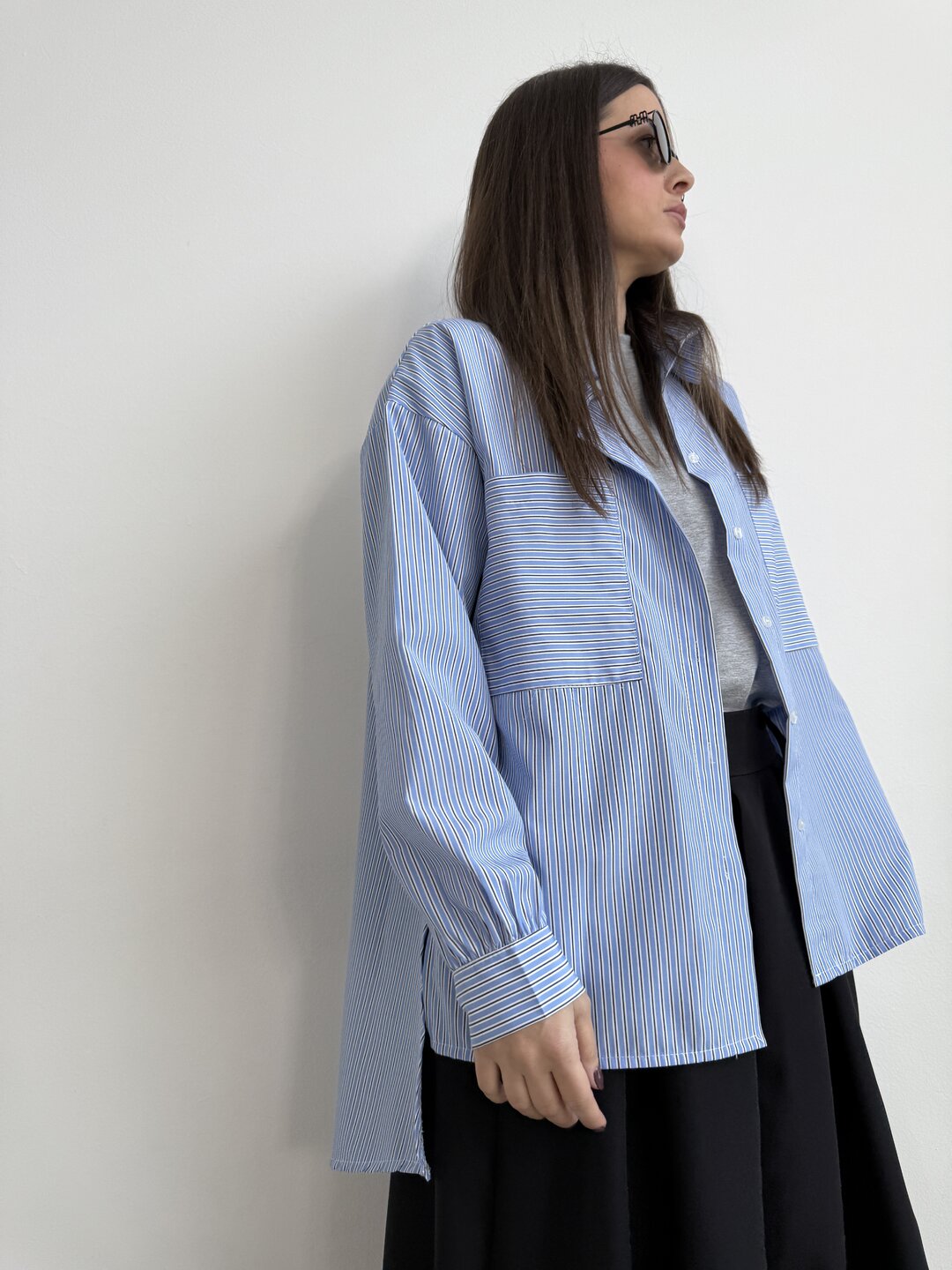 modello camicia over con colletto e tascone sul davanti. Chiusura classica con bottoncini centrali. Pences sul dietro.