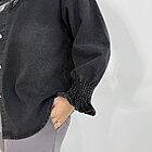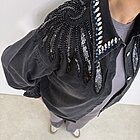 Modello regular over con taglio della spalla sceso. Fondo manica con ripresa elastico e rouches. Dettaglio gemme, perline paillettes su collo e spalla. Bottone a strass design fiore. Stondata sul retro.