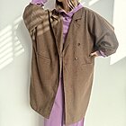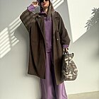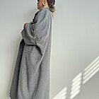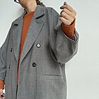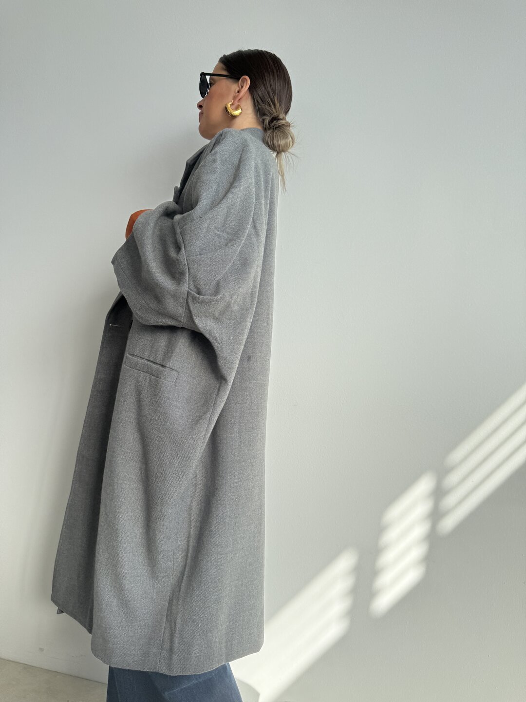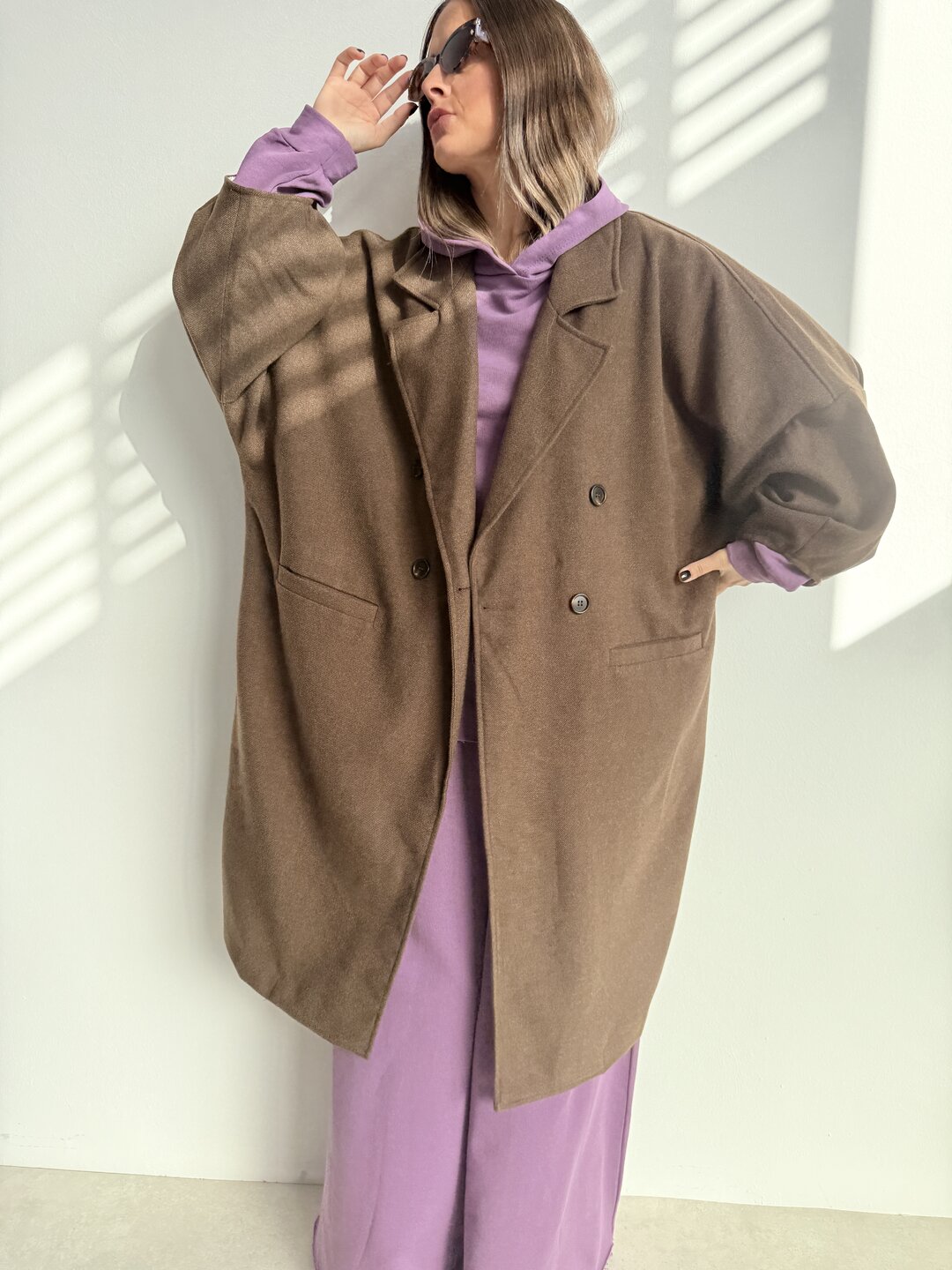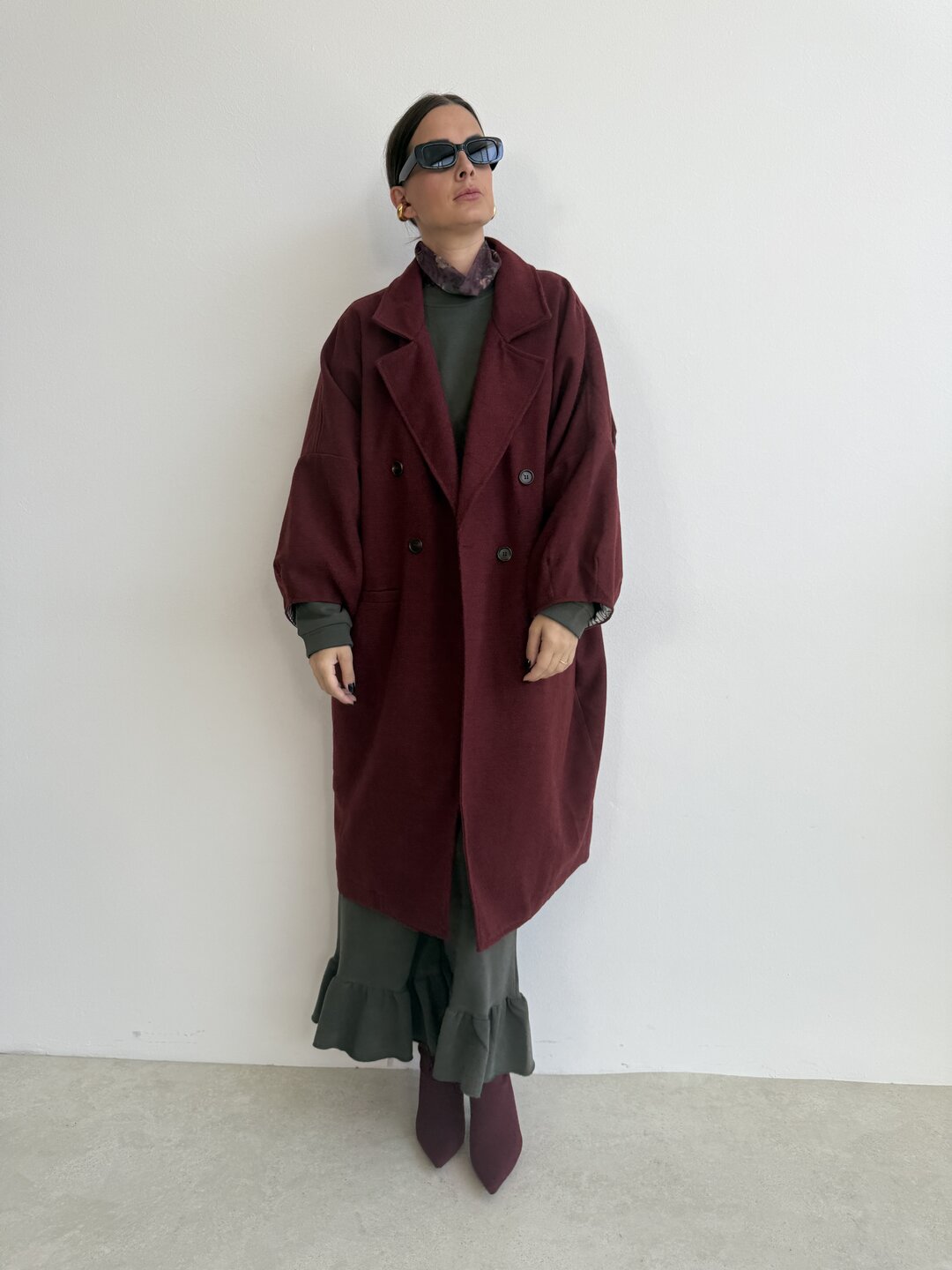 - cappotto modello oversize con fondo manica ripresa. Taglio della spalla scesa e allacciatura con bottoni.