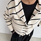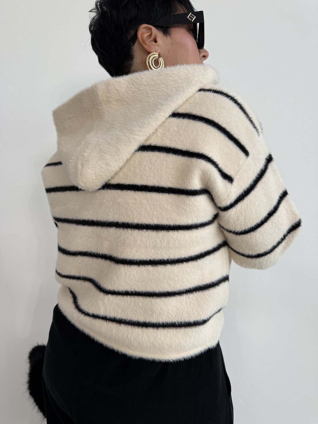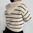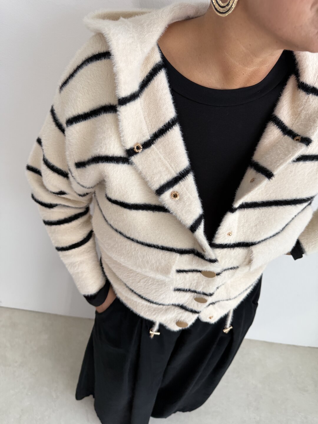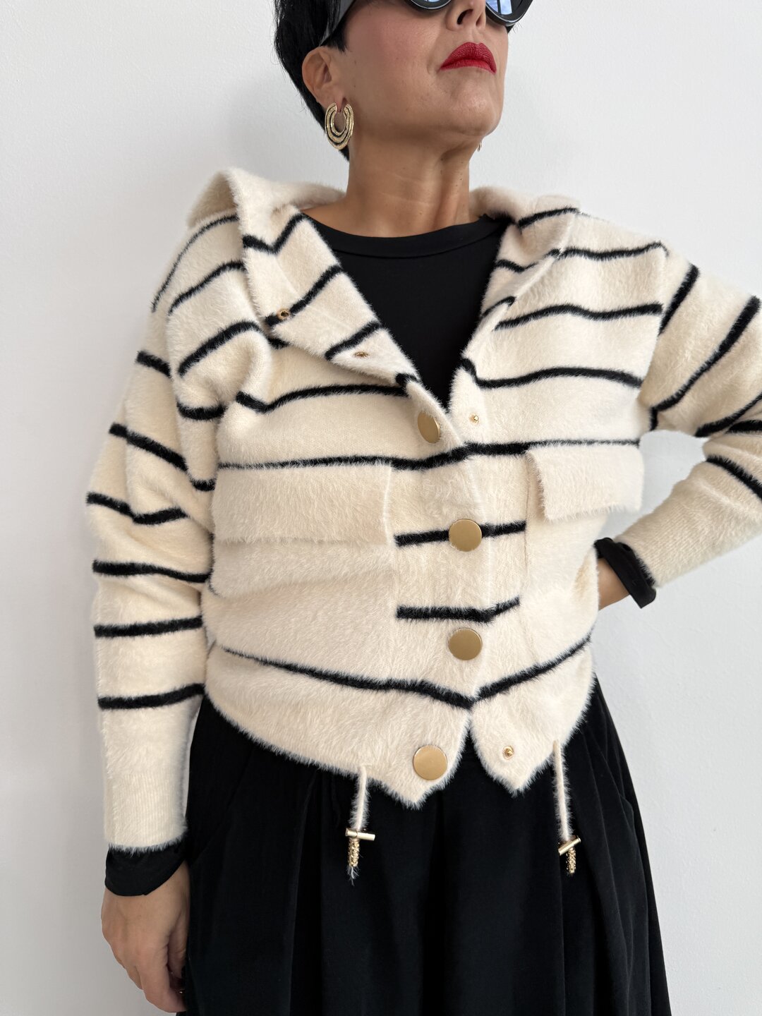 Modello a cardigan con bottoni automatici in oro satinato brunito. Sul fondo dotata di coulisse. cappuccio non rimovibile.