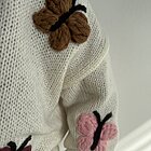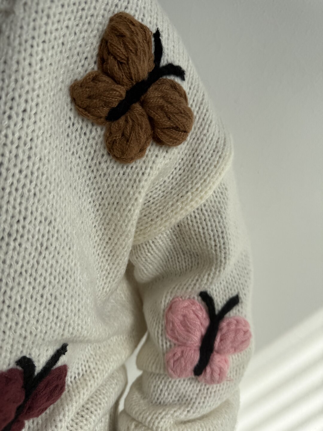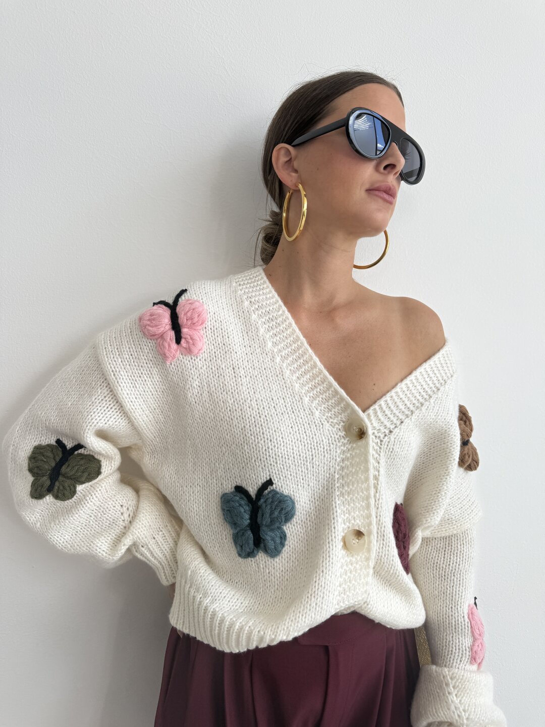 • modello leggermente ad ovetto con taglio della spalla sceso. Scollo a V con allacciatura bottoni. Dettaglio farfalle a maglia colorate