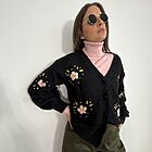 modello leggermente ad ovetto con taglio della spalla sceso. Scollo a V con allacciatura bottoni. Dettaglio fiore a maglia colorate