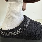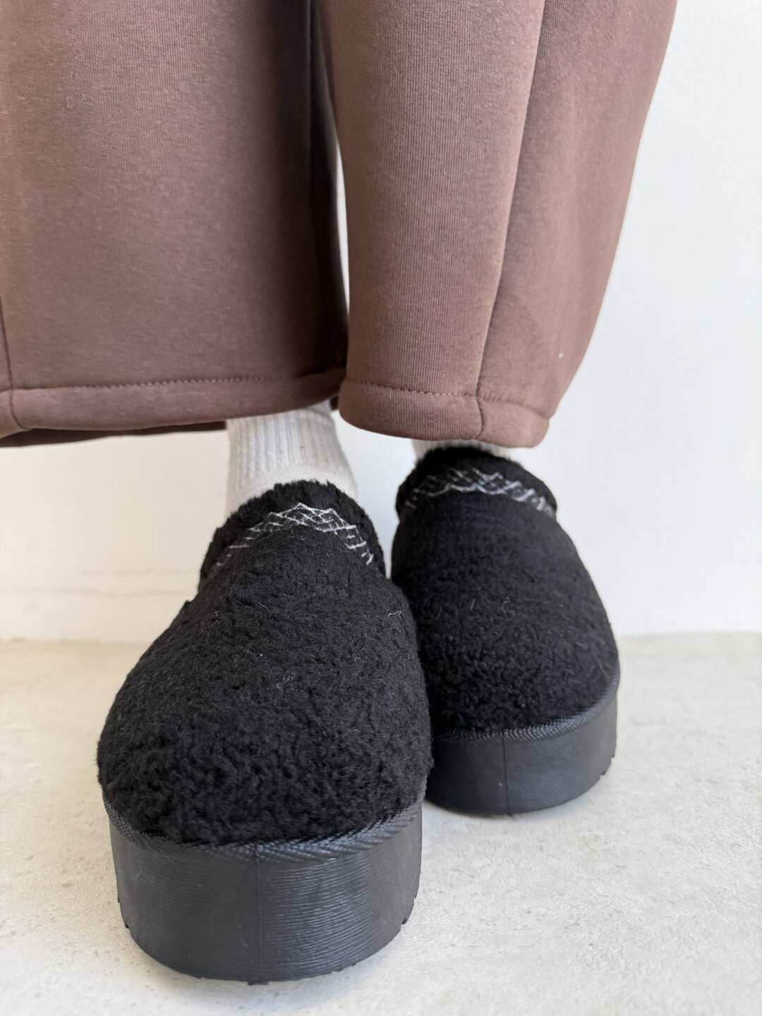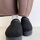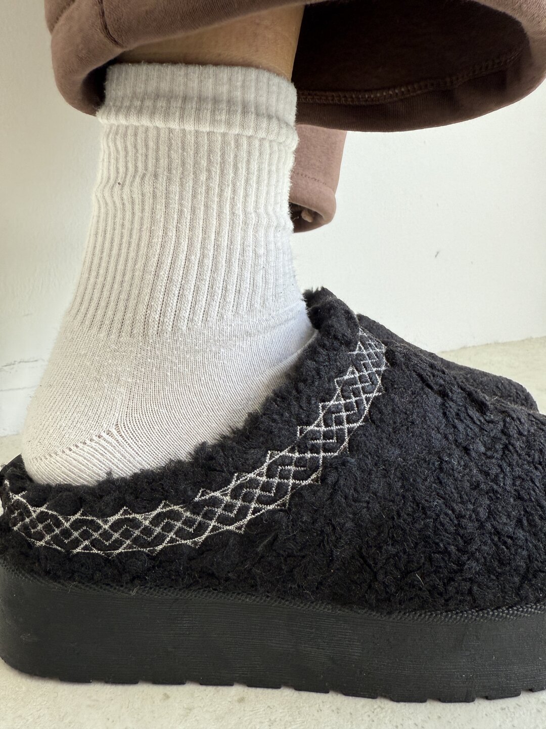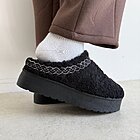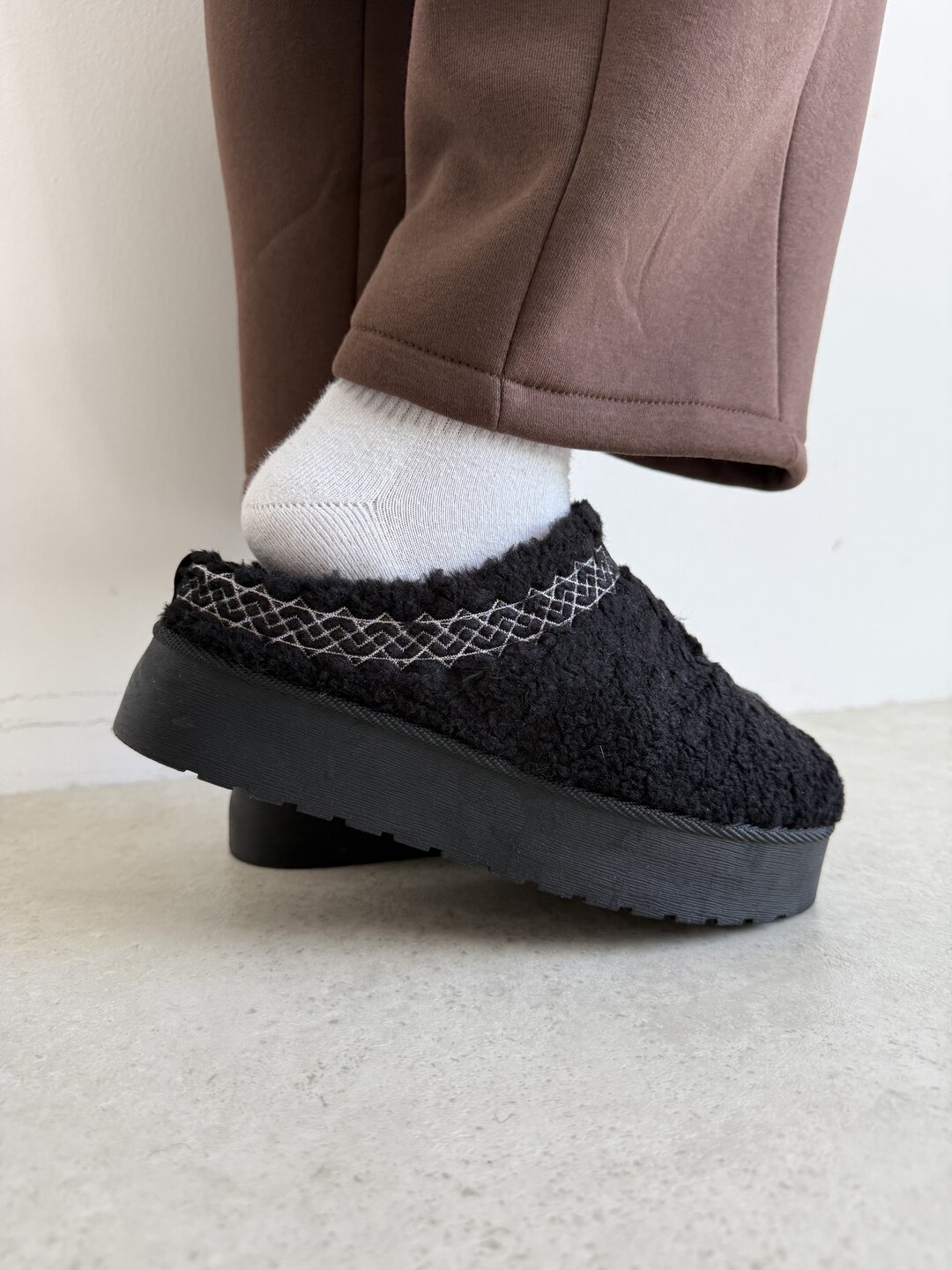 Struttura ciabatta modello mules con punta arrotondata. Effetto tessuto teddy con fondo platform. Su estremità tomaia ricamo colorato effetto greca. Altezza del fondo 4,5cm.