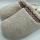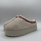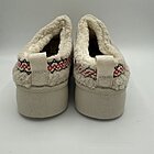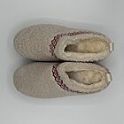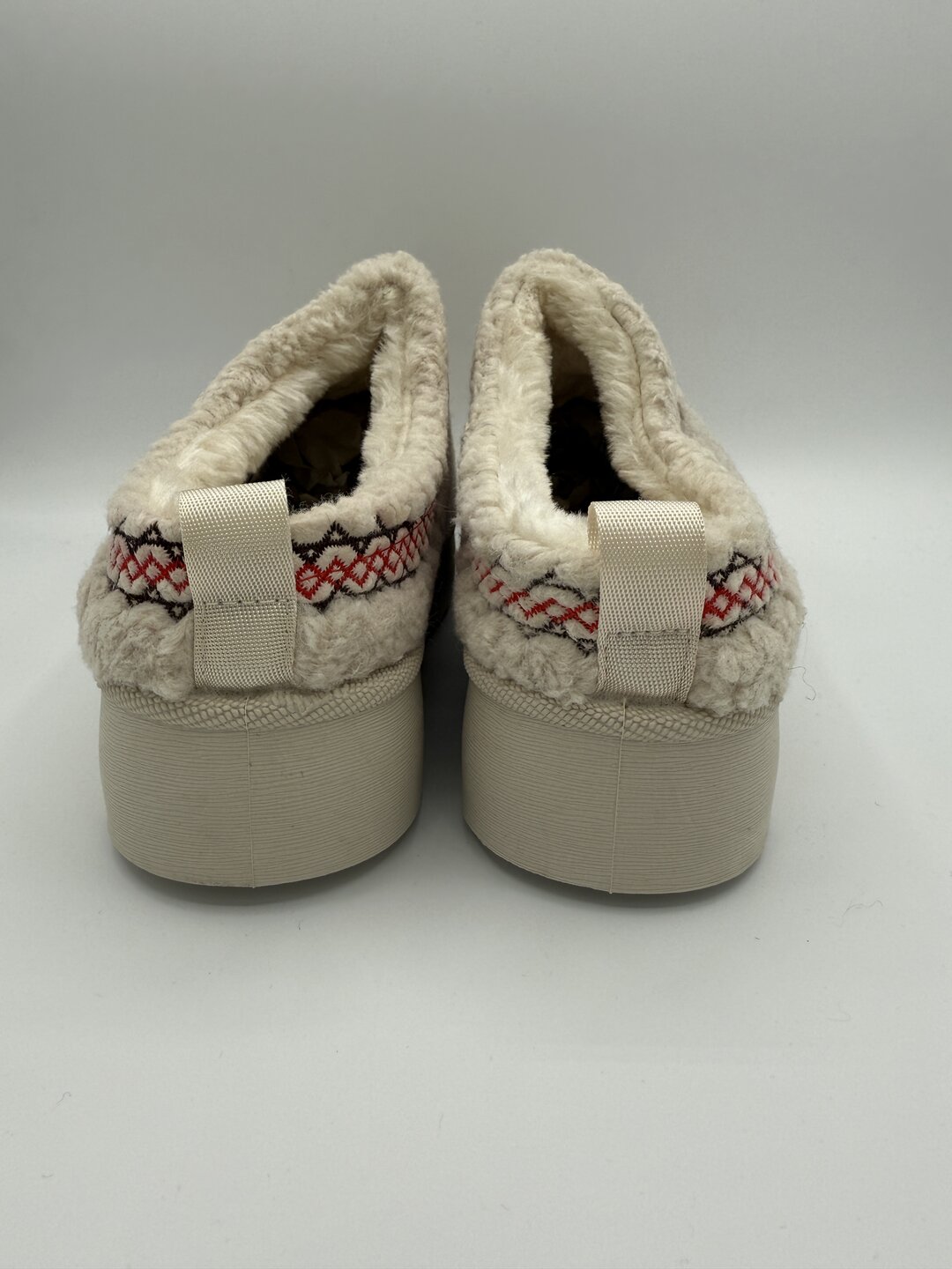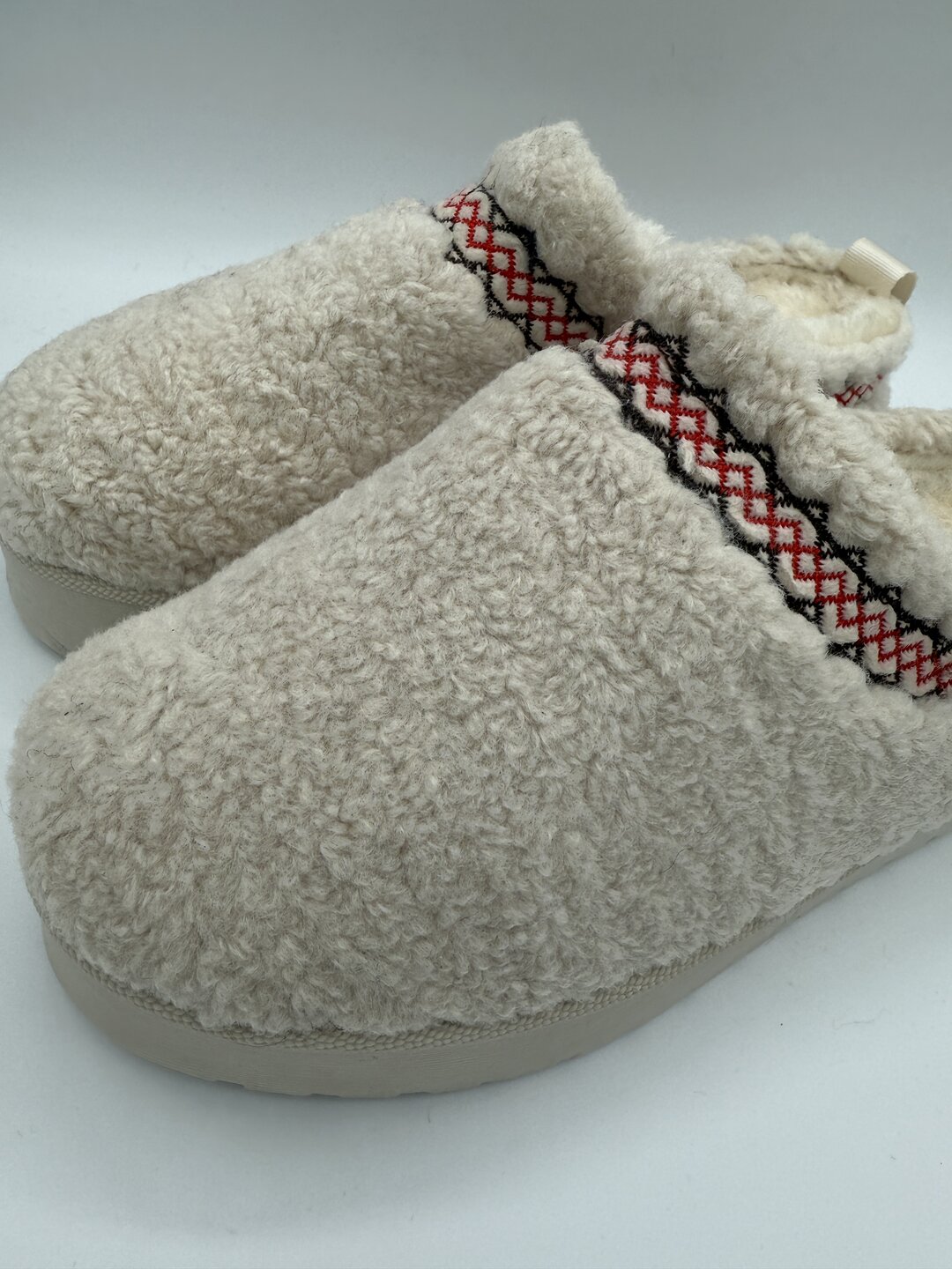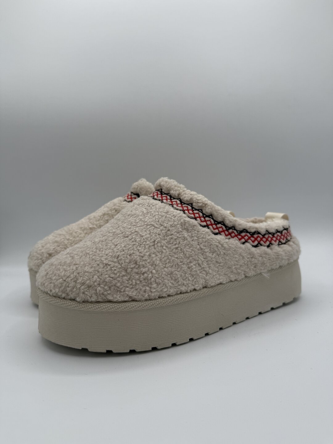Struttura ciabatta modello mules con punta arrotondata. Effetto tessuto teddy con fondo platform. Su estremità tomaia ricamo colorato effetto greca. Altezza del fondo 4,5cm.