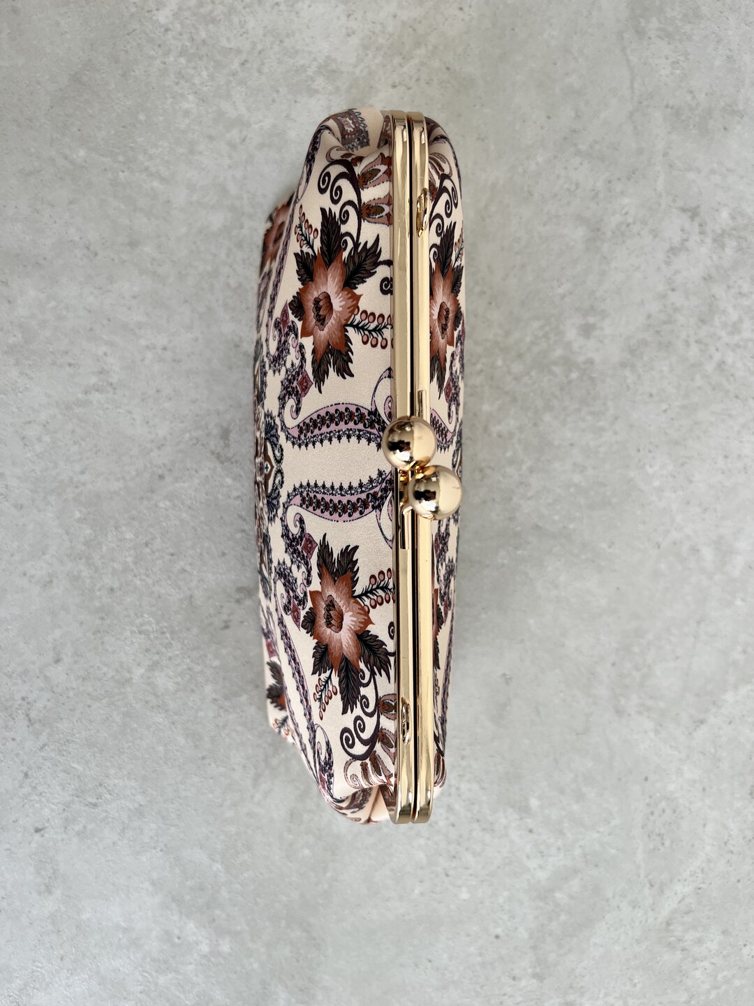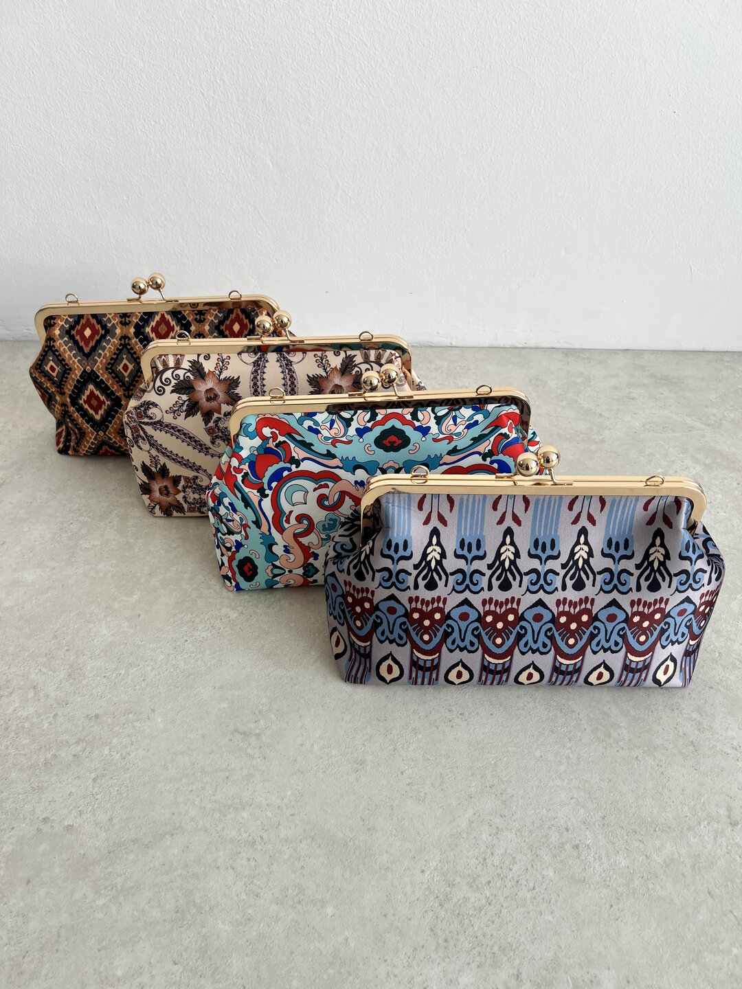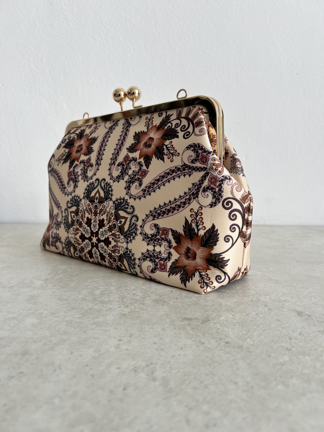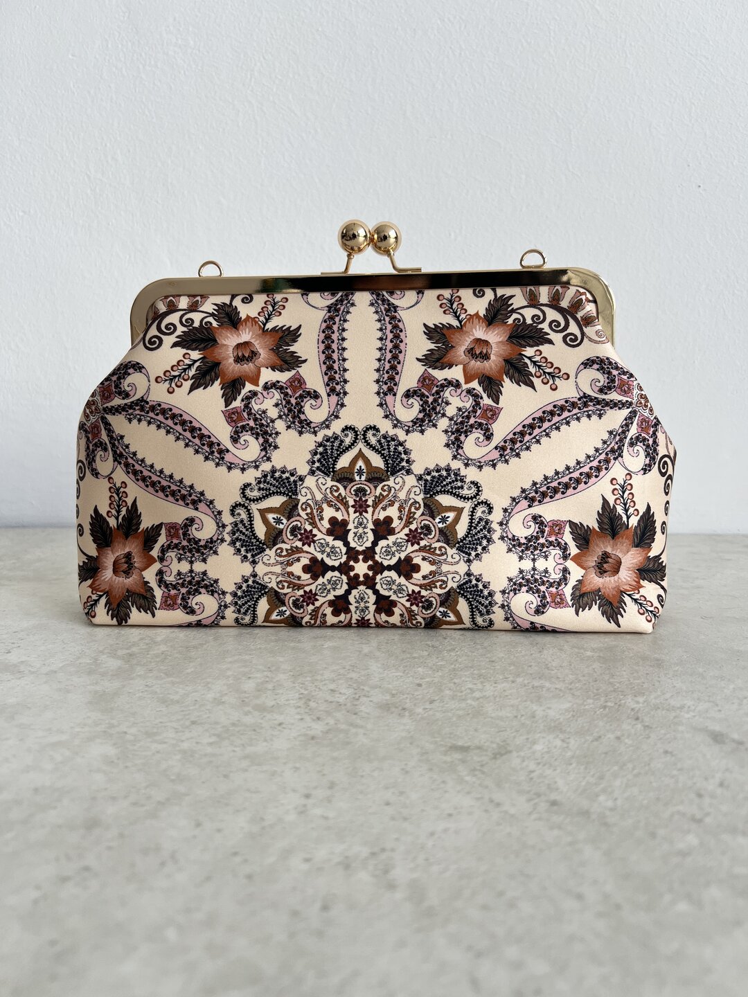 Chiusura con bottone a clip. Tracolla removibile. Due tasche interne.