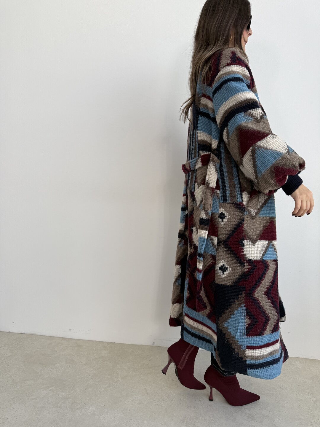 Modello extra lungo simil accappatoio con cintura in tessuto. Senza collo con allacciatura in automatico. Foderato senza spallina. Manica con finale a cannetè.
