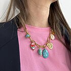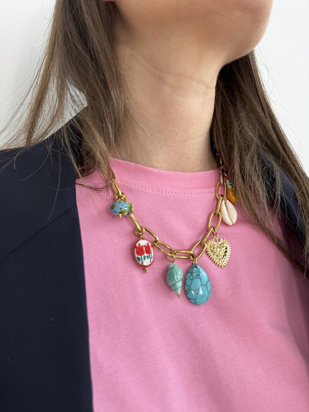 modello a catena con charm in galvanica colore oro e mix pendenti acquamarina rosso ….