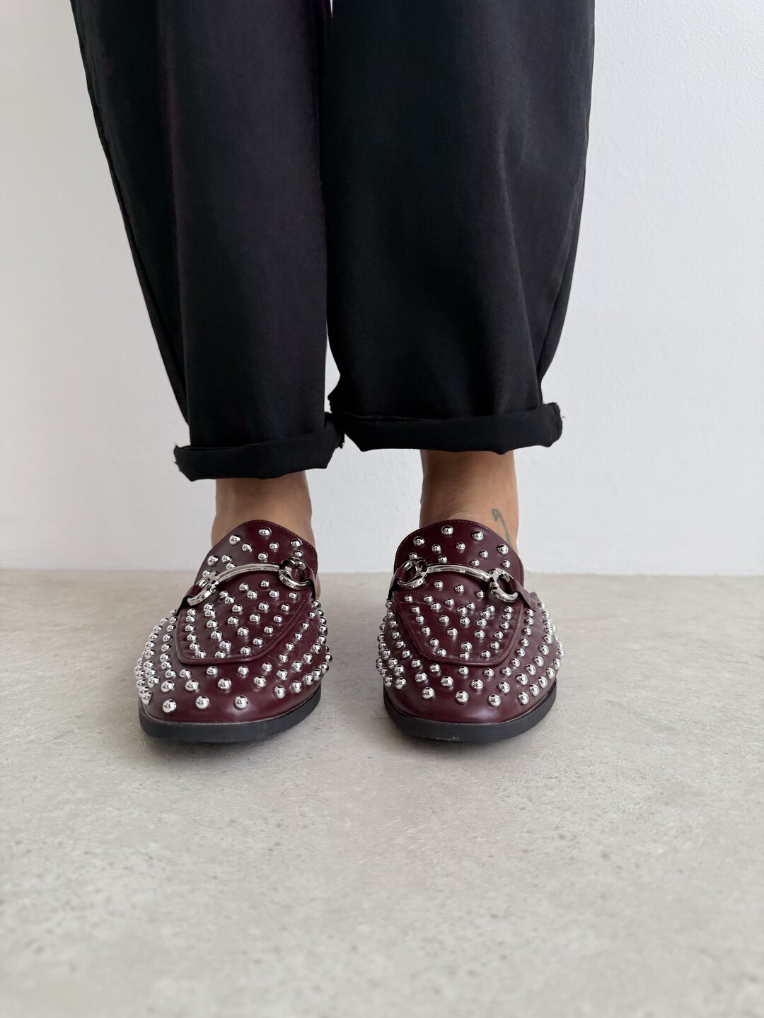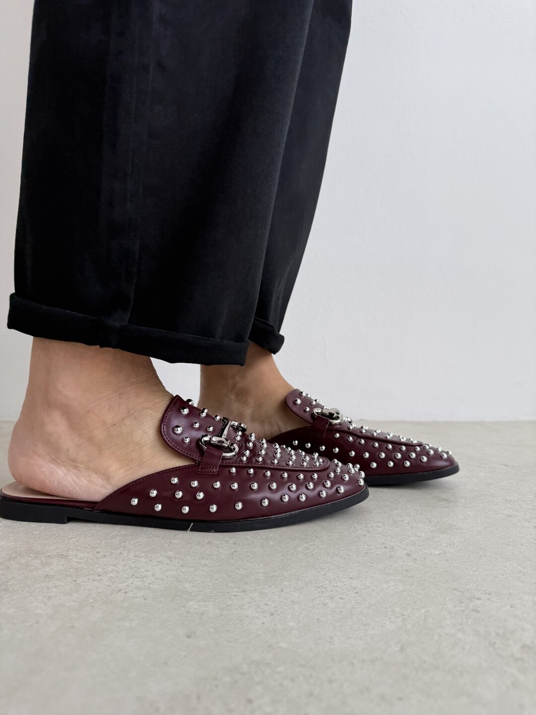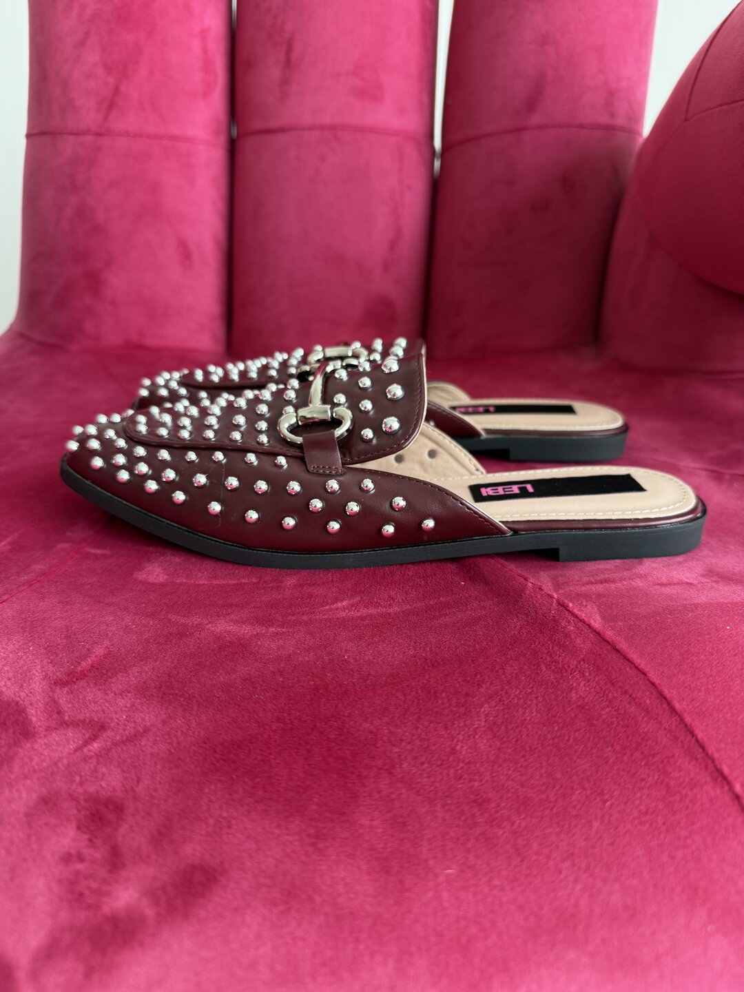 Colore rosso scuro (wine) con bulloni e fibbia argento.