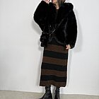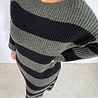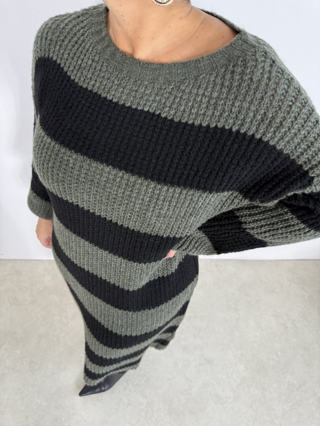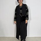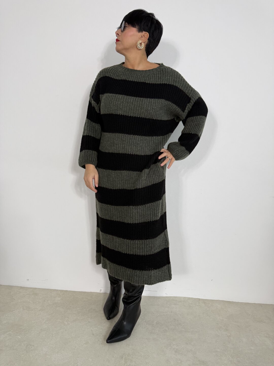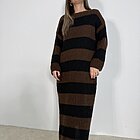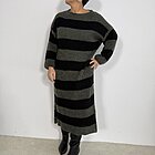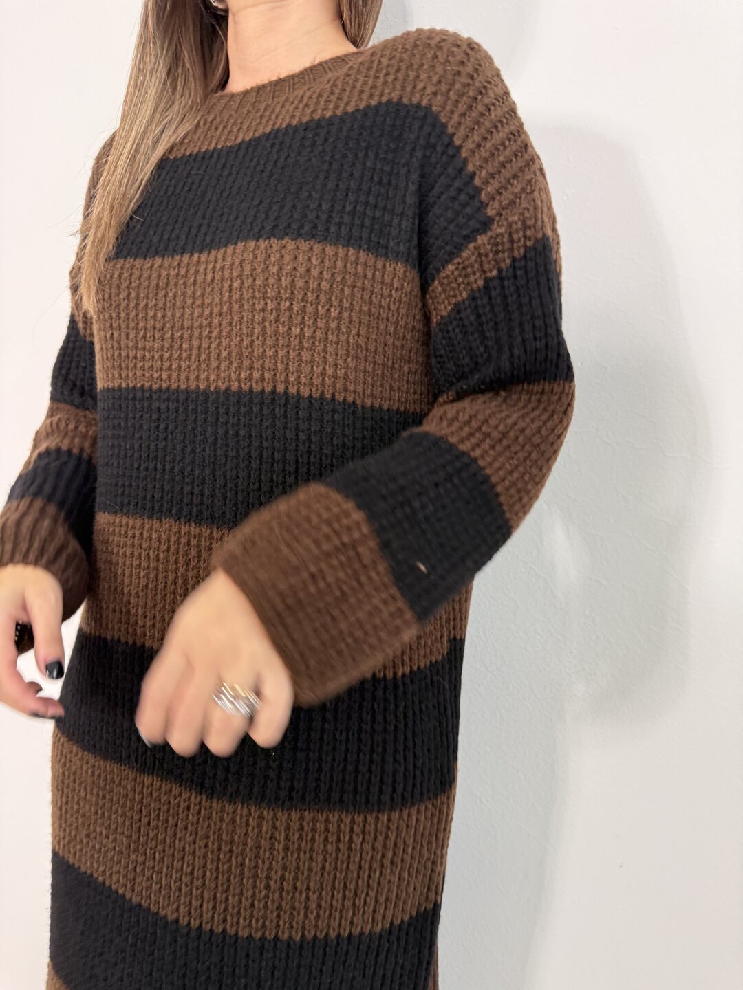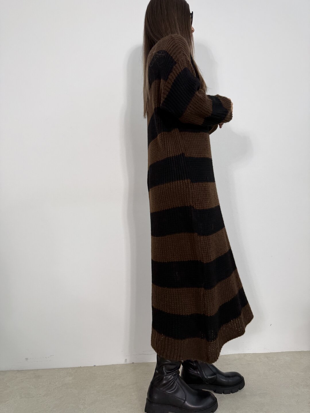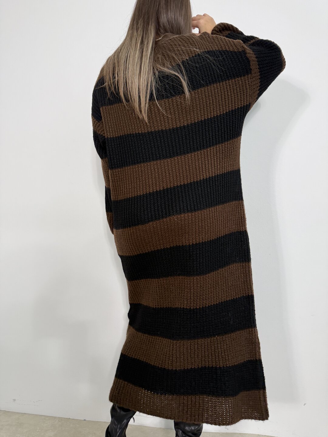 Modello lungo in lana con scollo a giro. Taglio dritto.