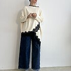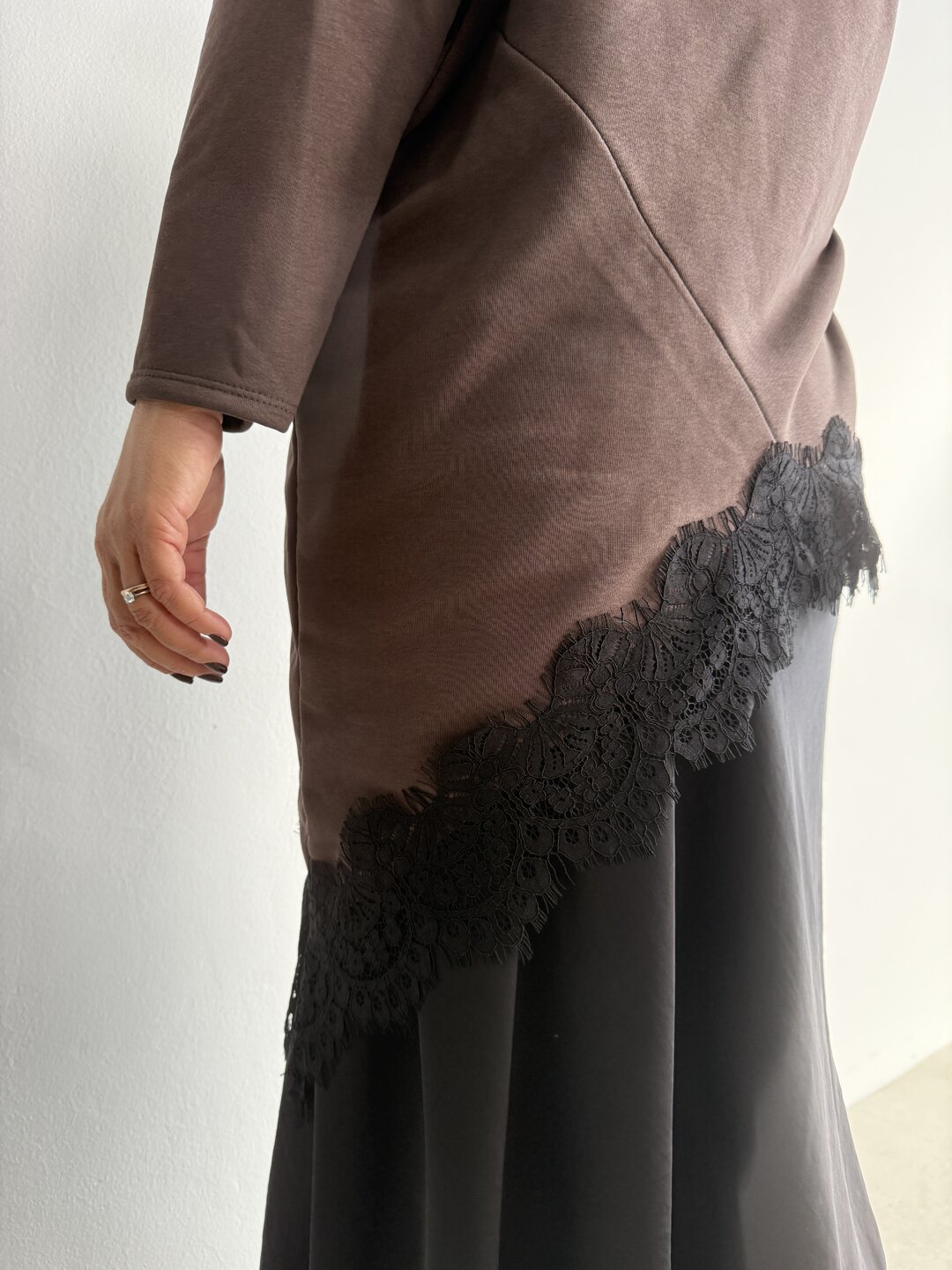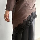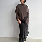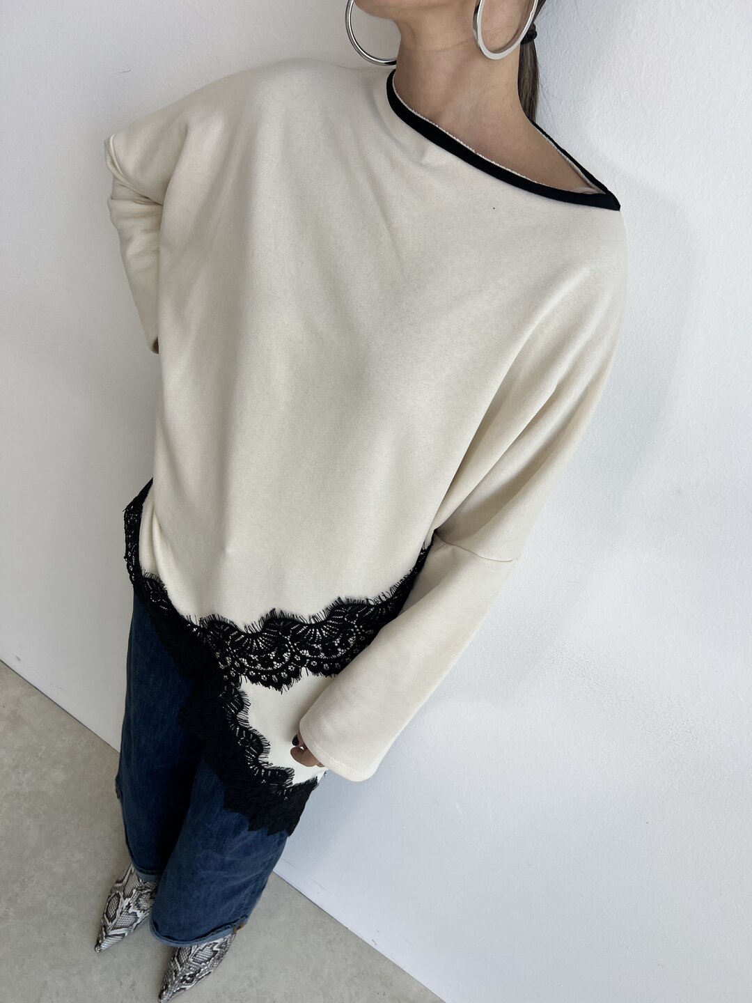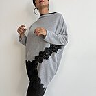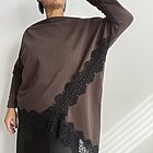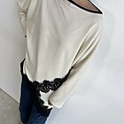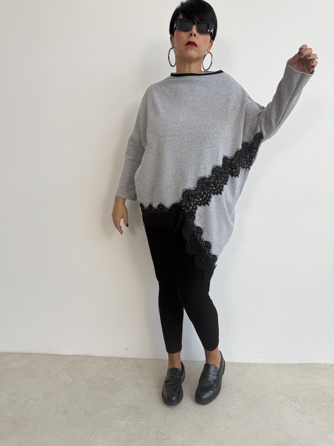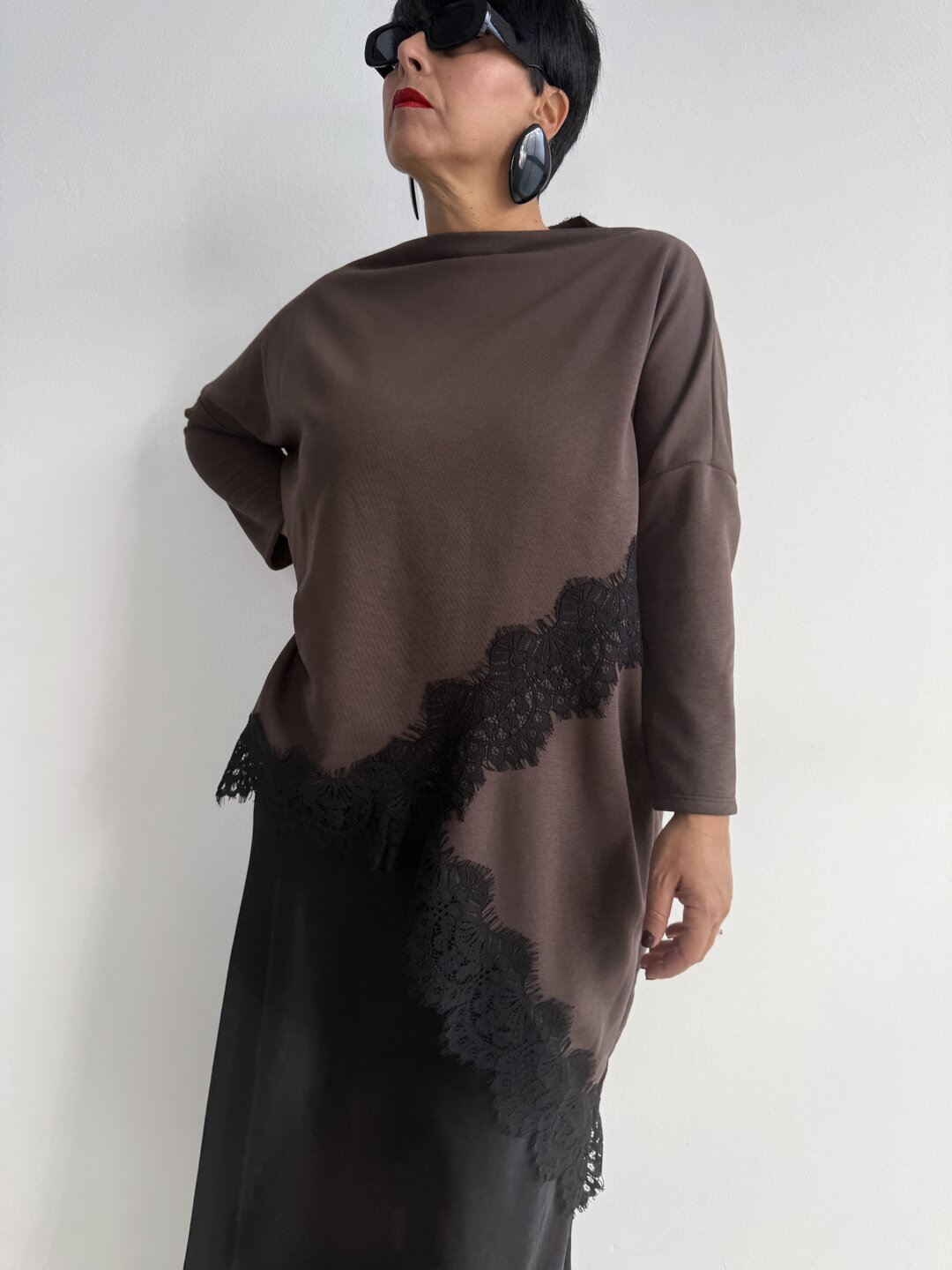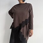 Modello over con rifinitura pizzo trasversali, che definisce il modello asimmettrico. Taglio della spalla sceso.