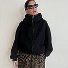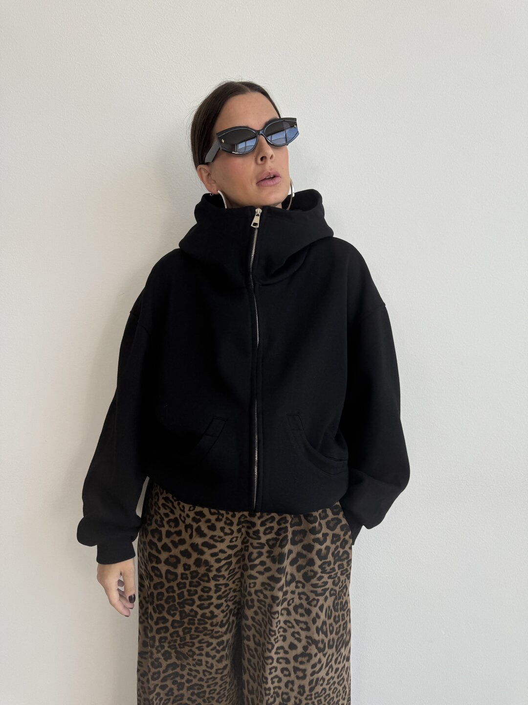 • felpa con cappuccio e chiusura a zip. Modello ovetto con tessuto finale braccia e corpo in canneté.