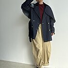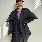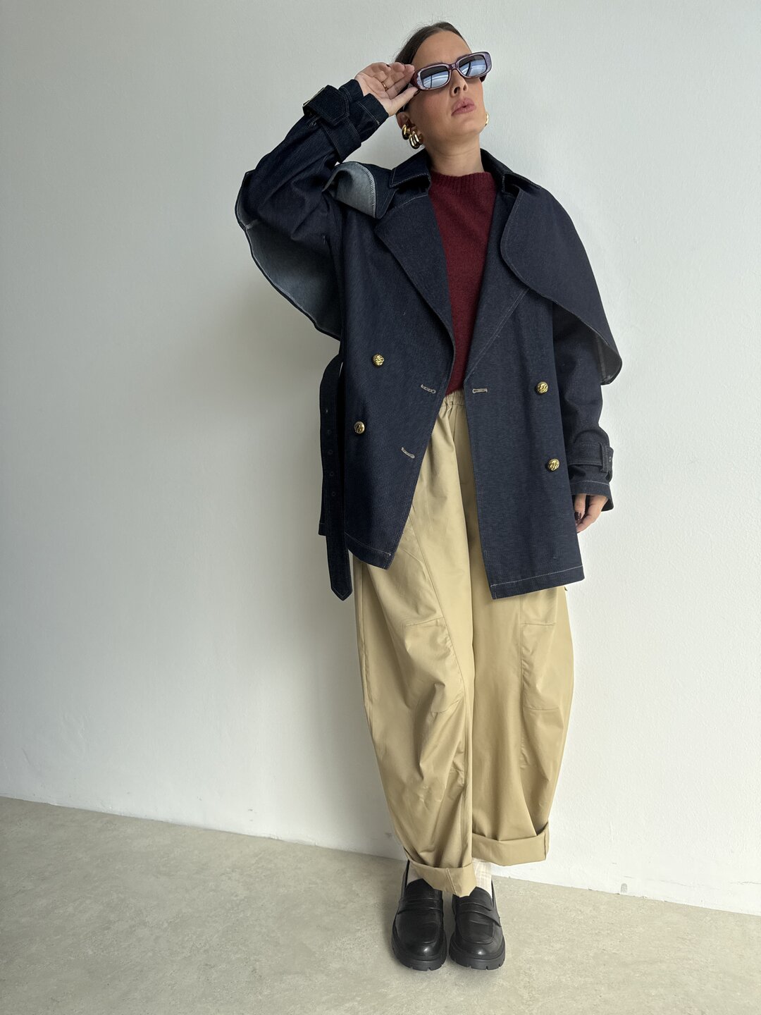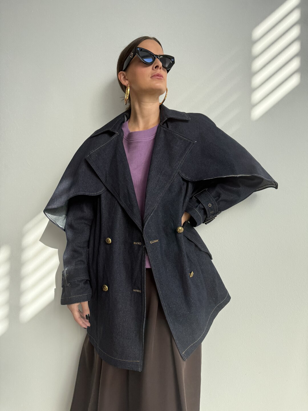 • modello corto con chiusura doppio petto e cintura in vita. Mantellina su spalla.