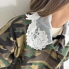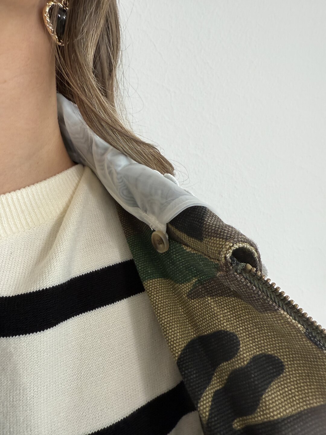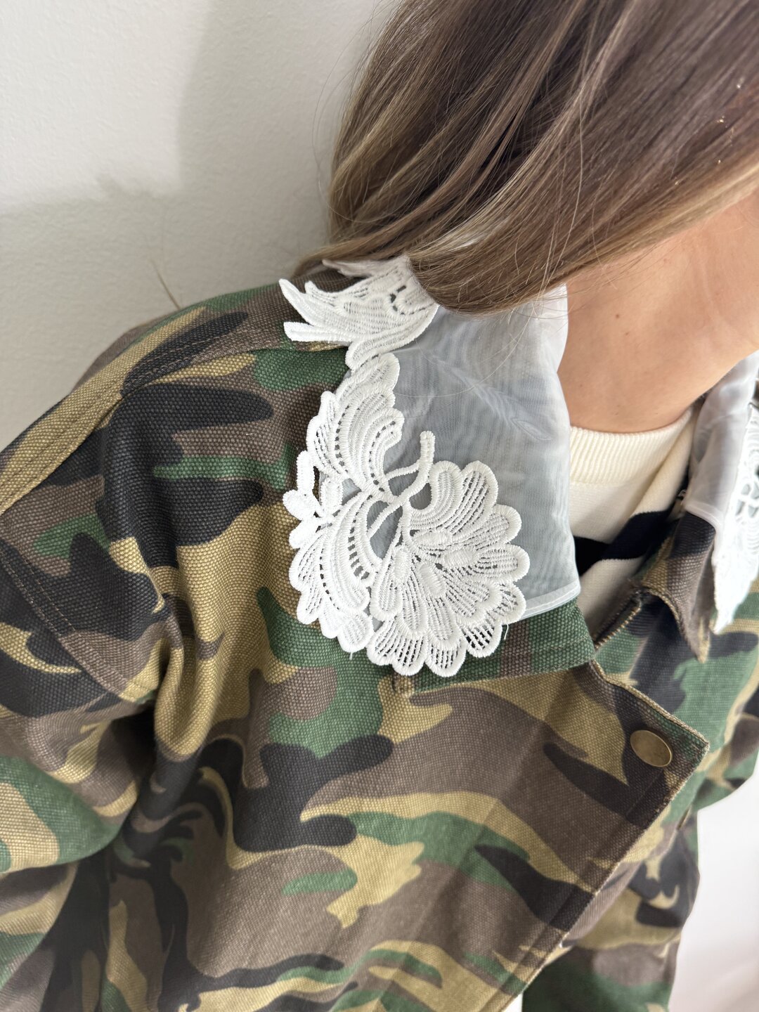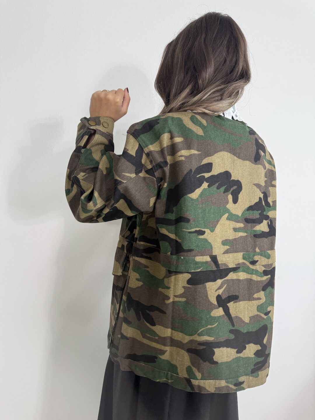- modello in tessuto sostenuto nella fantasia militare. Tasche sul davanti e colletto in cotone e pizzo. Struttura dritta con chiusura zip. 3 tasche a toppa sul davanti con chiusura automatica.
