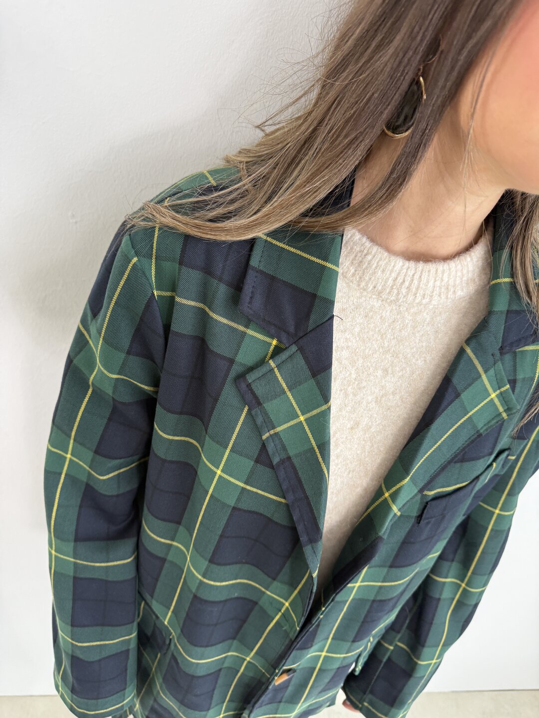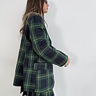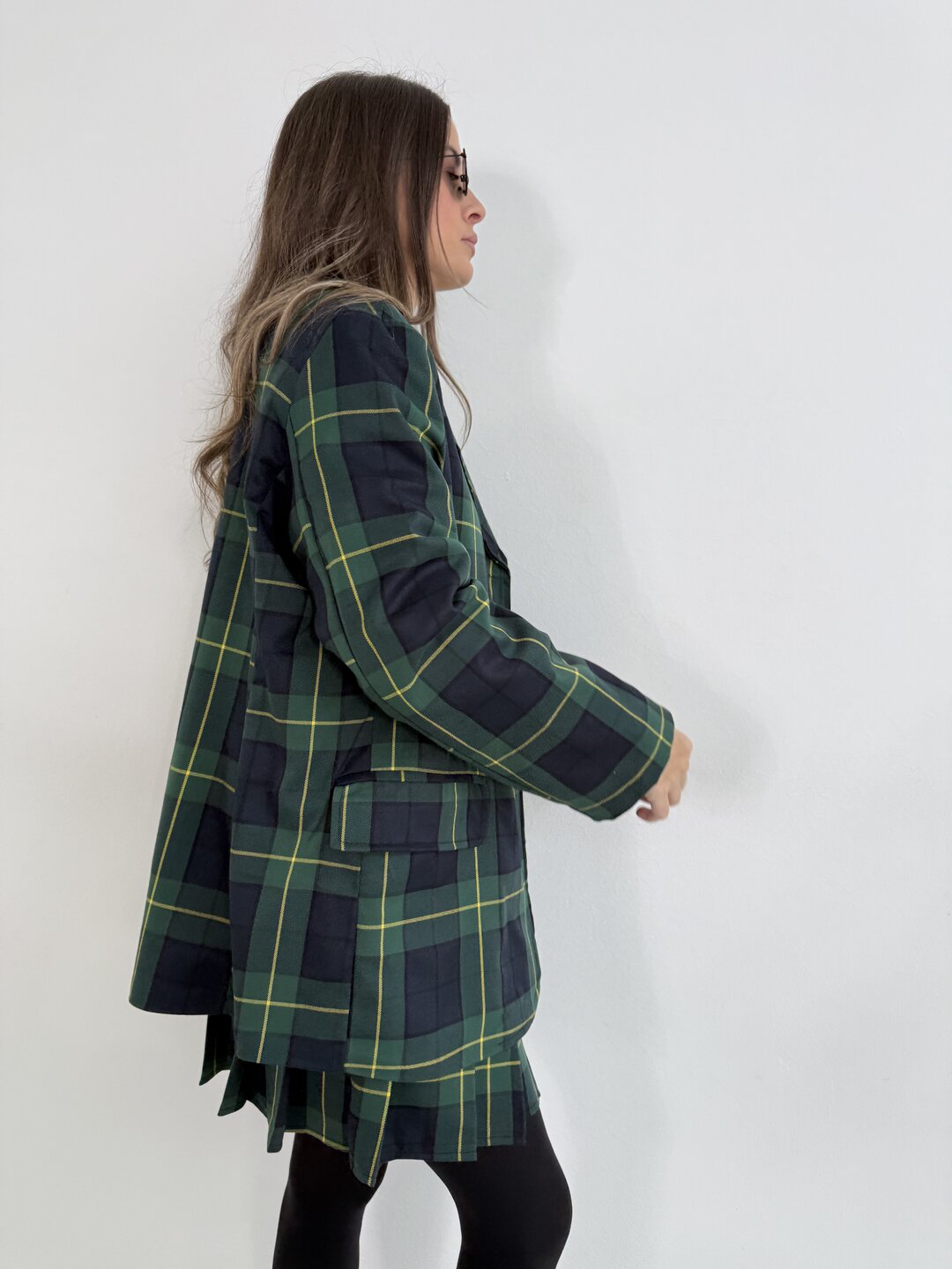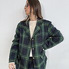 Modello giacca scozzese, chiusura con 3 bottoni centrali e taschine sul fondo.