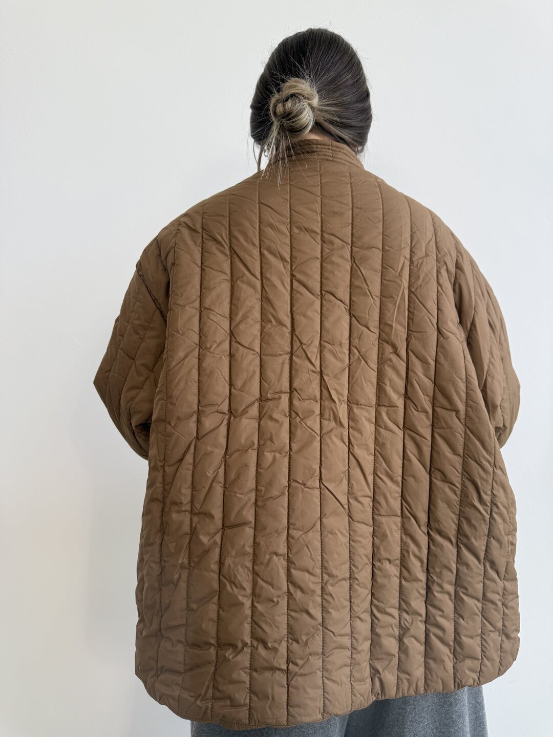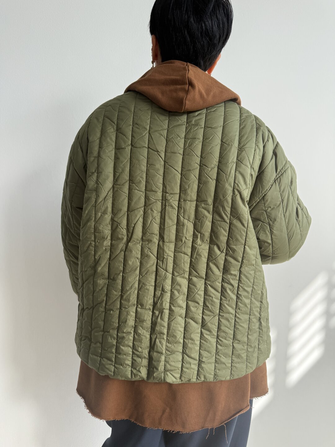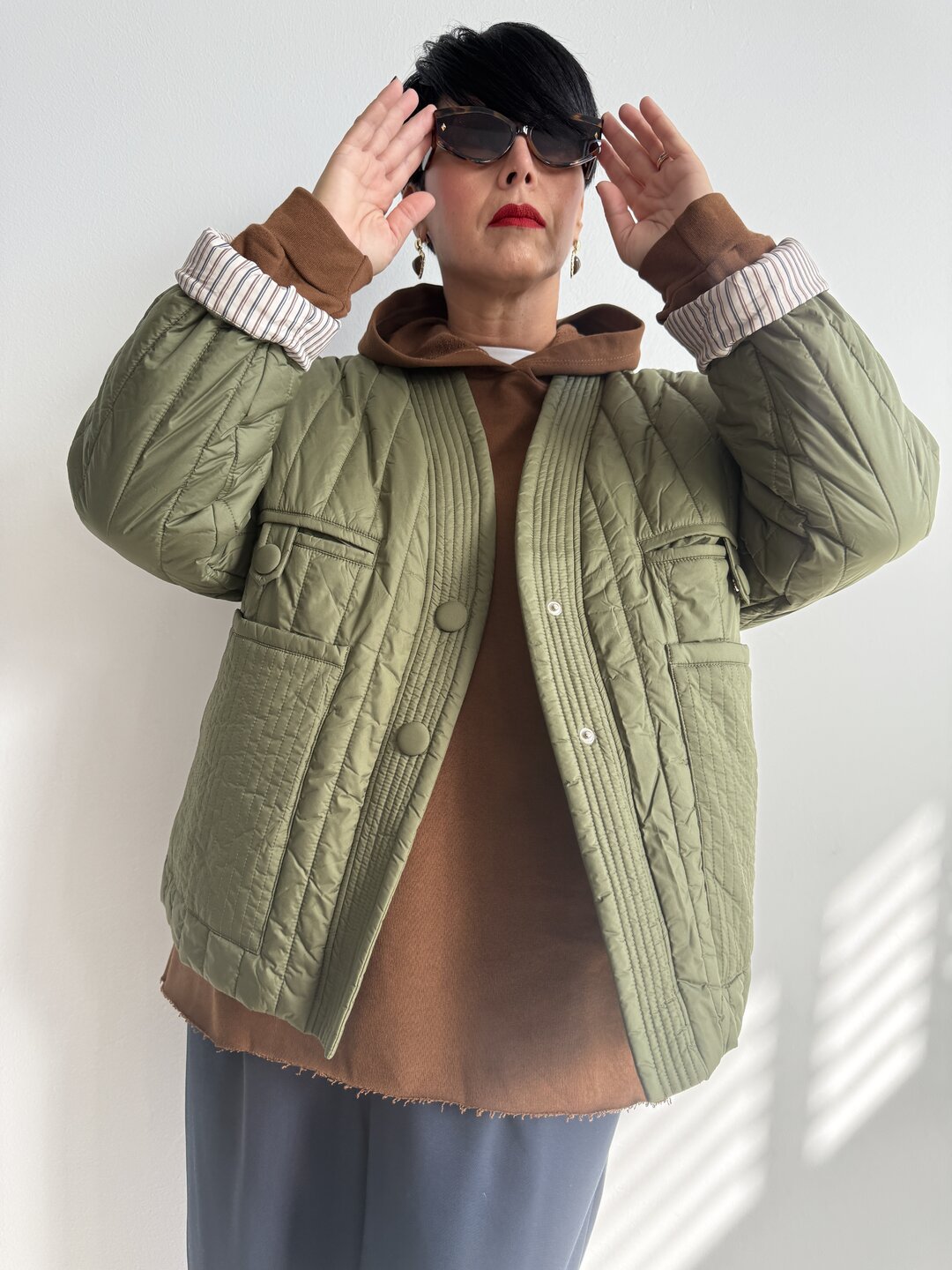 - modello dritto trapuntato. Allacciatura con bottone. Trapunto verticale. Tasche a toppa sul davanti.