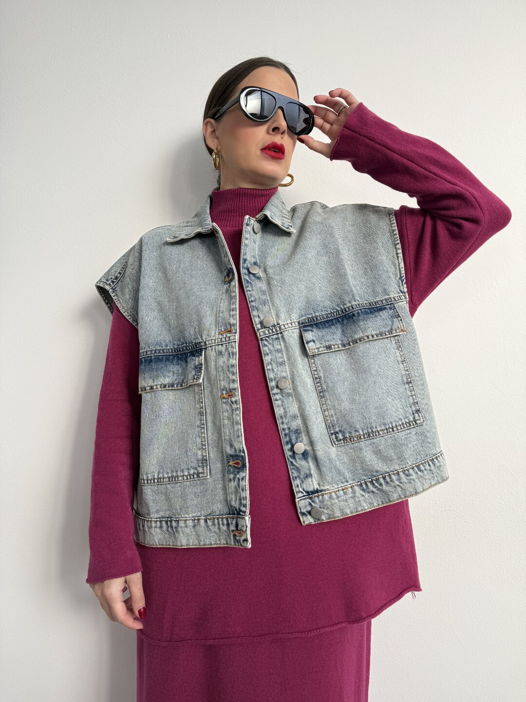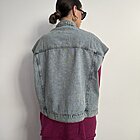 modello oversize in denim chiaro. Smanicato. Presenta colletto e due tasche a toppa con patta. Chiusura con bottoni. Linea dritta.