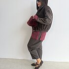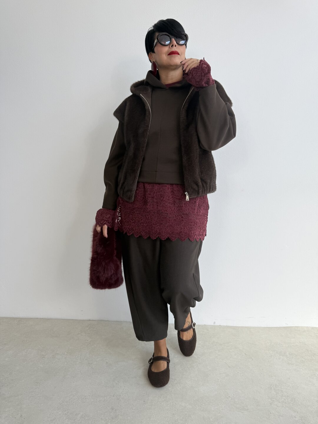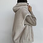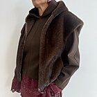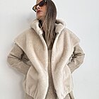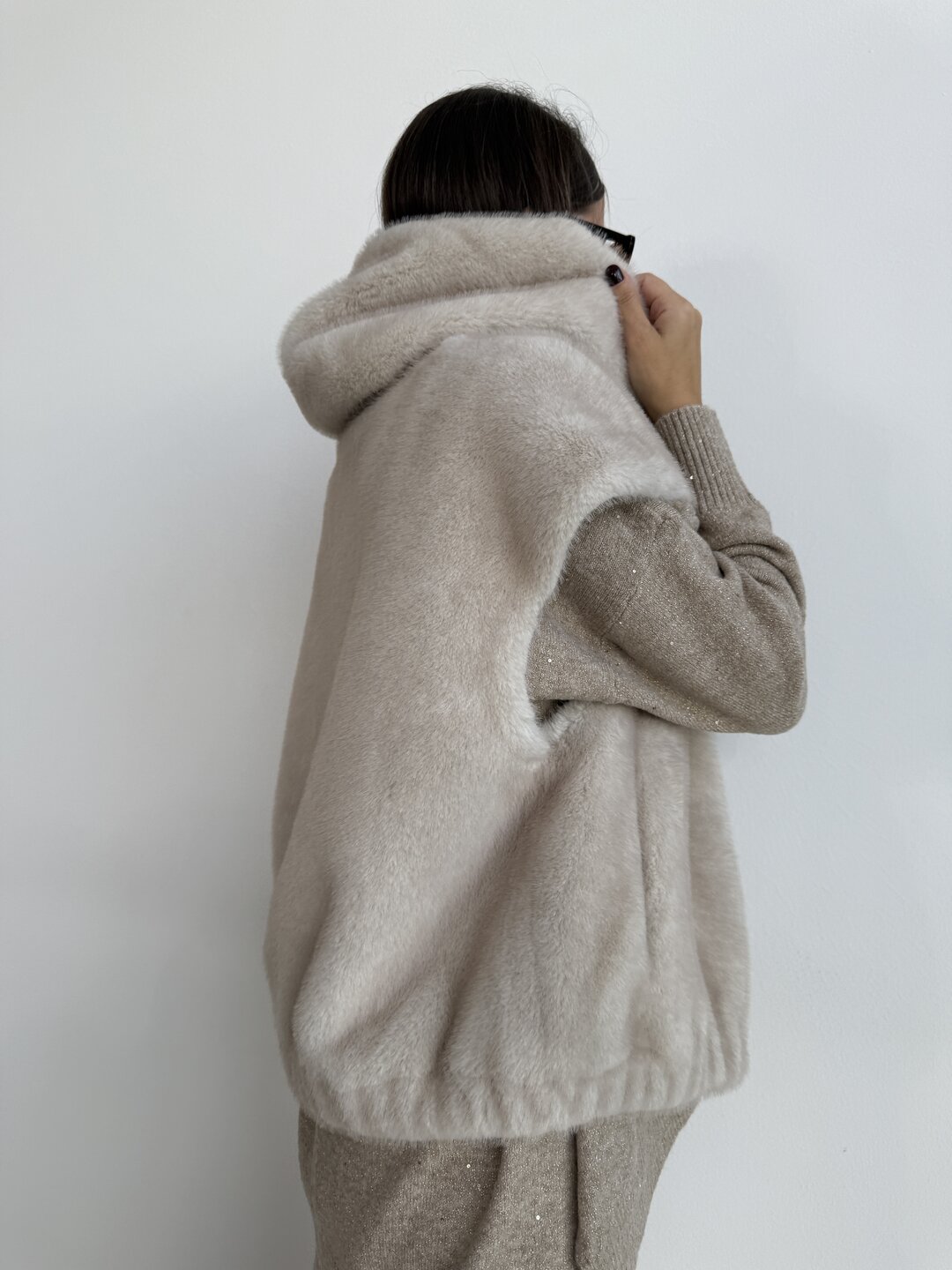 - modello giacca a gilet con cappuccio. Chiusura con zip e leggermente ripreso sul fondo.
