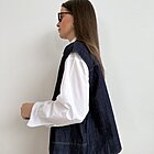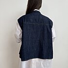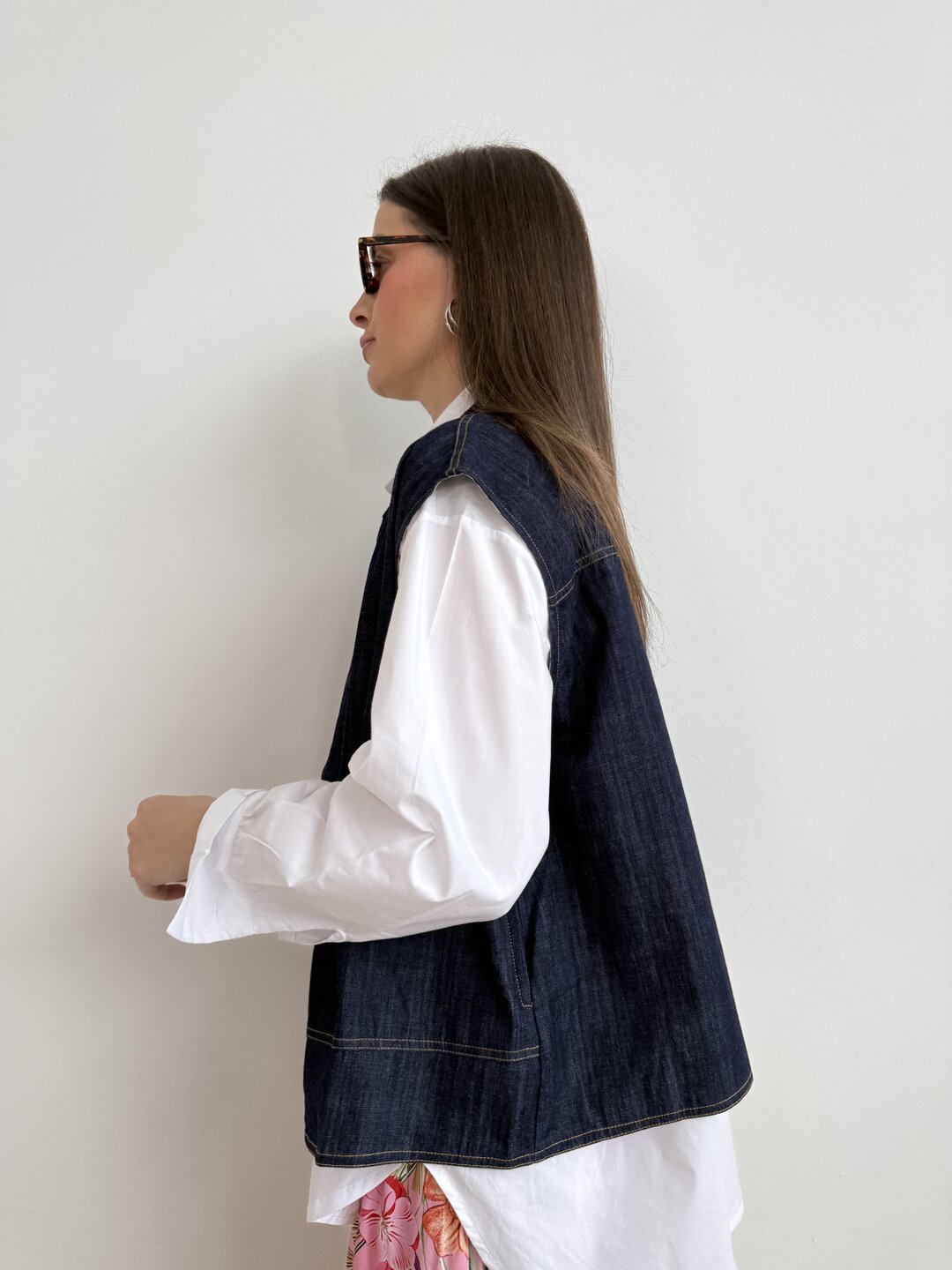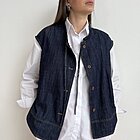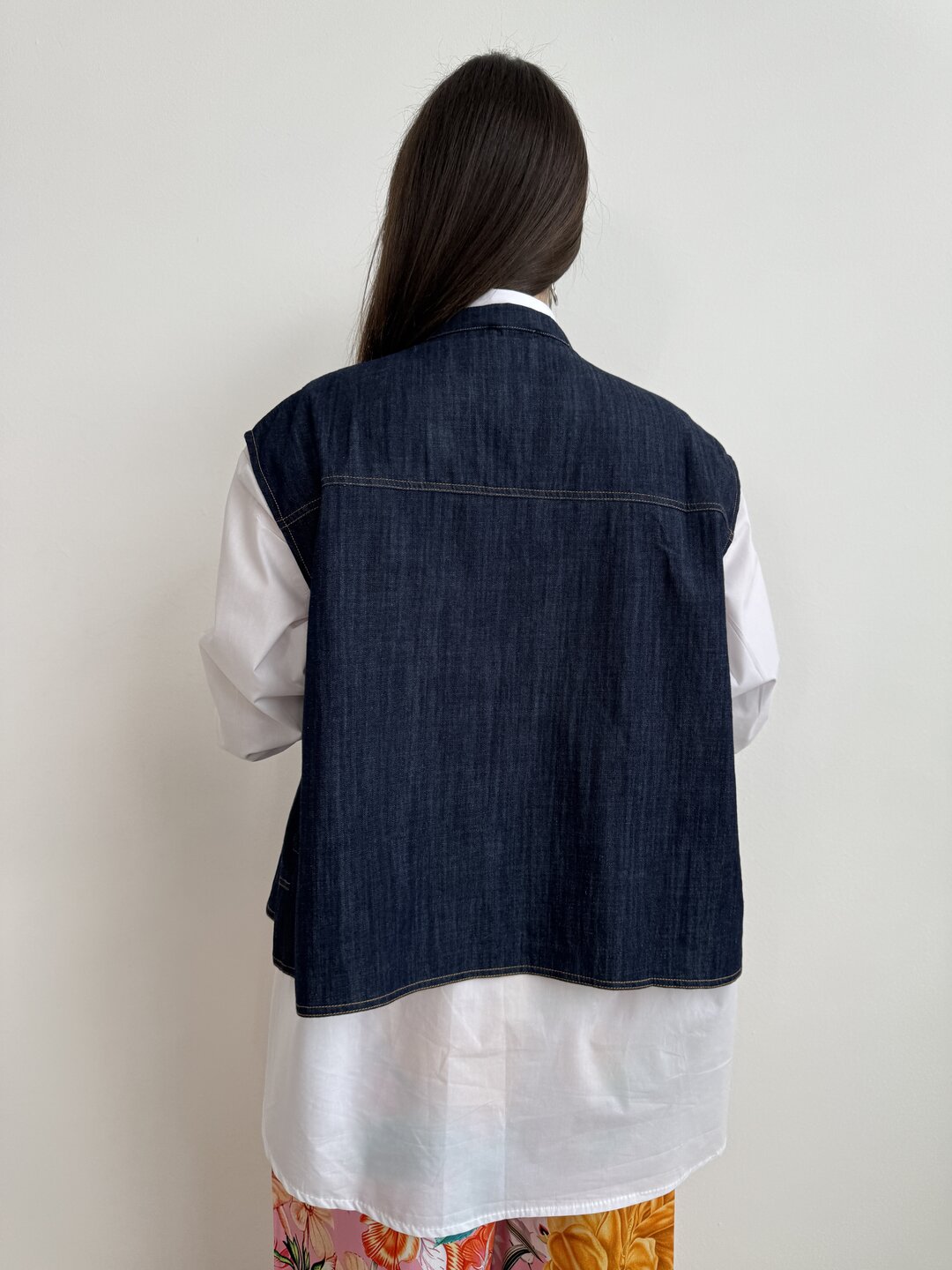 modello a scatola in denim leggero. Collo rotondo con coulisse. Allacciatura con bottoni centrali. Tasche a filo.