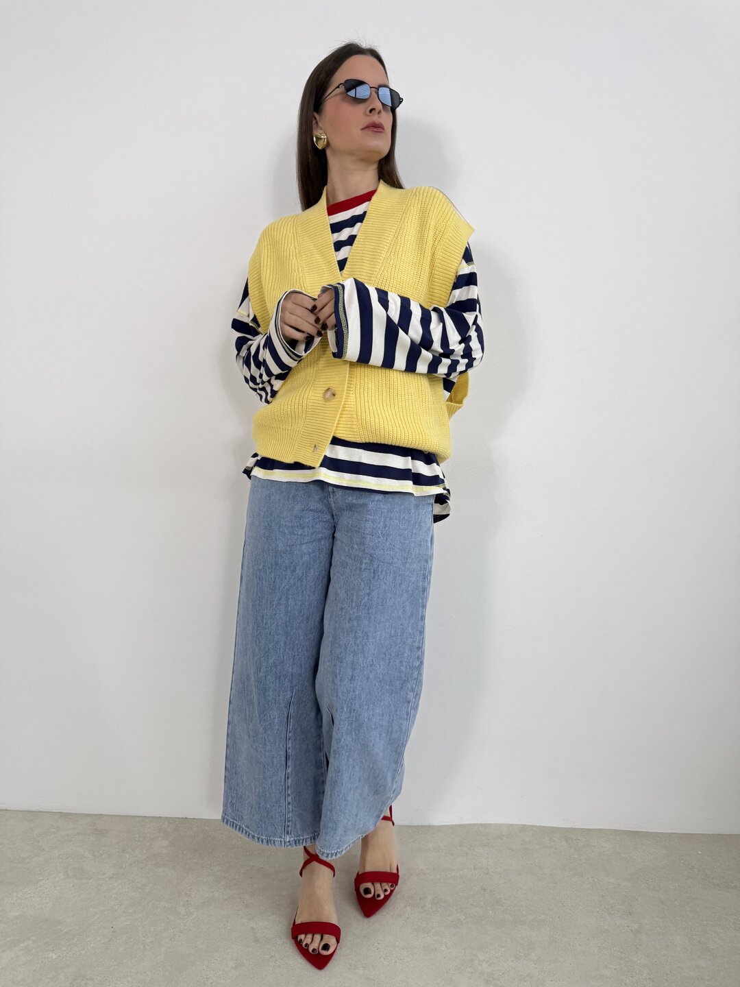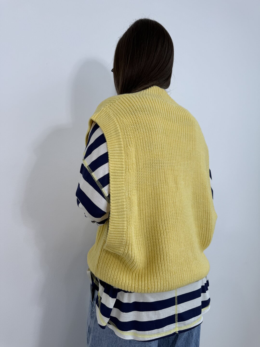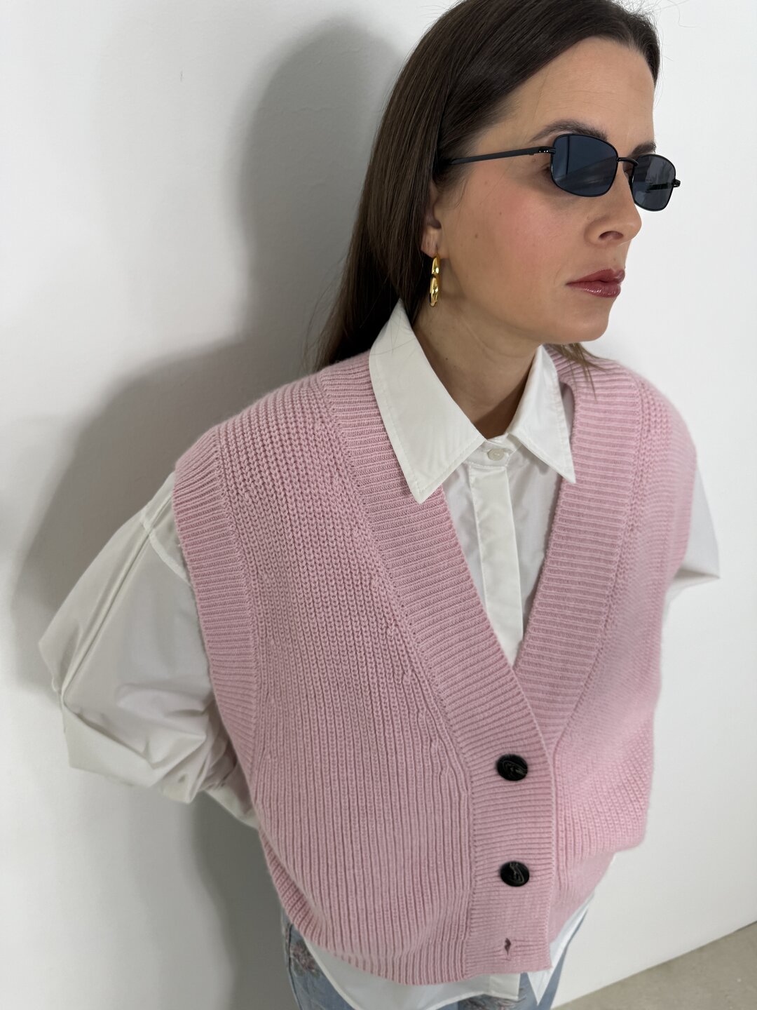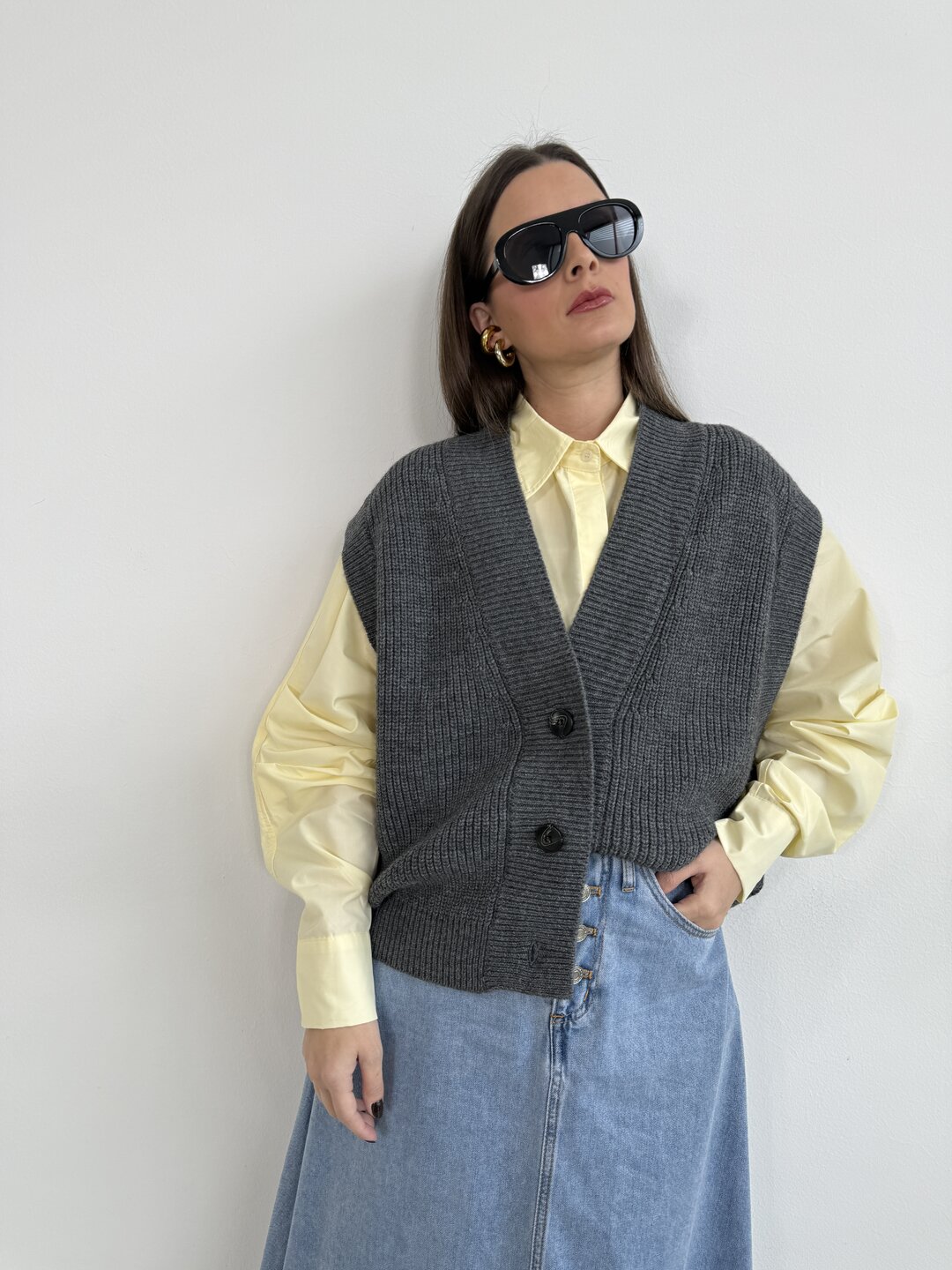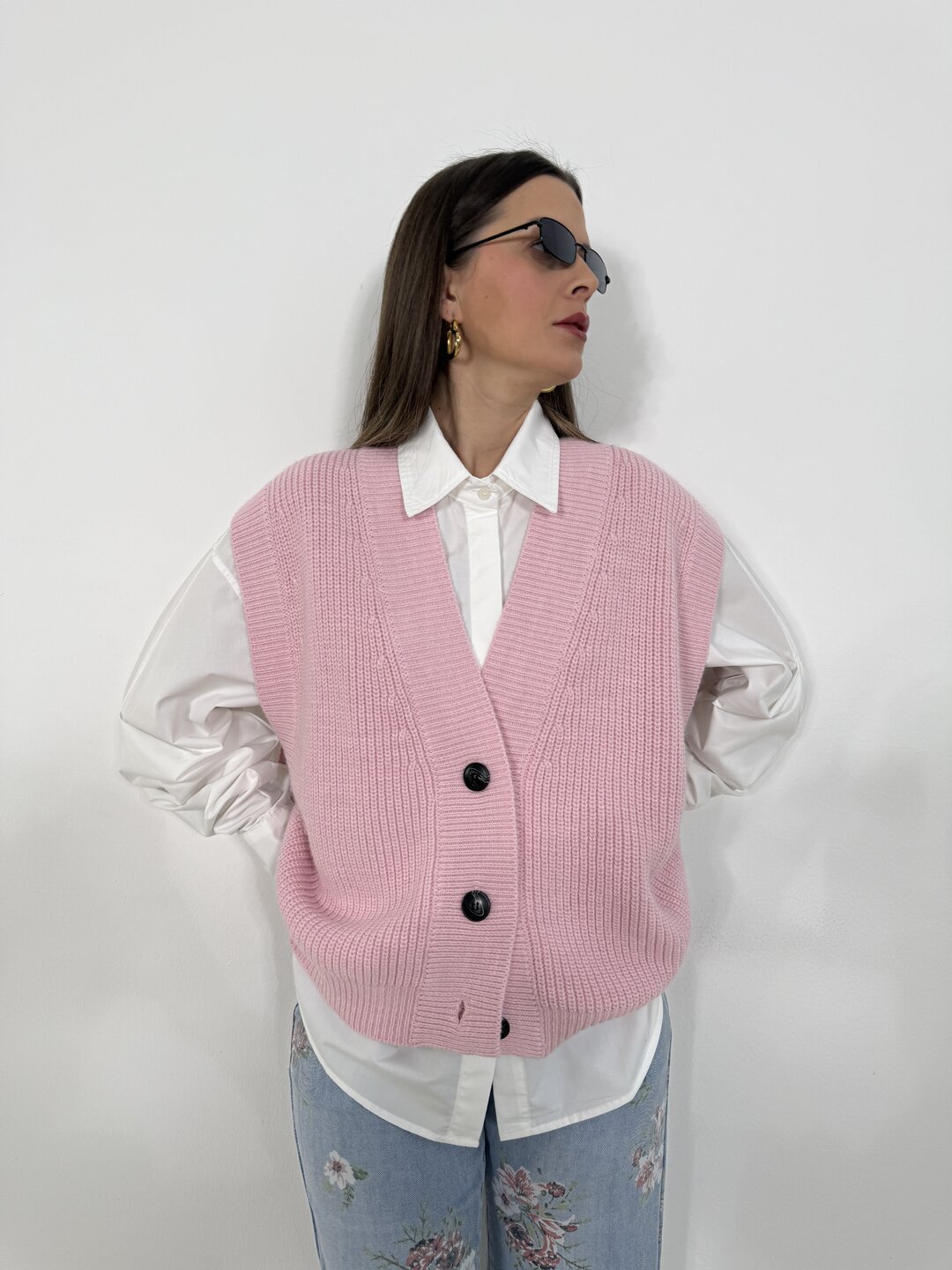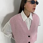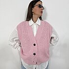 Modello gilet over in maglia. Scollo a V con giromanica ampio. Chiusura con 3 bottoni.
