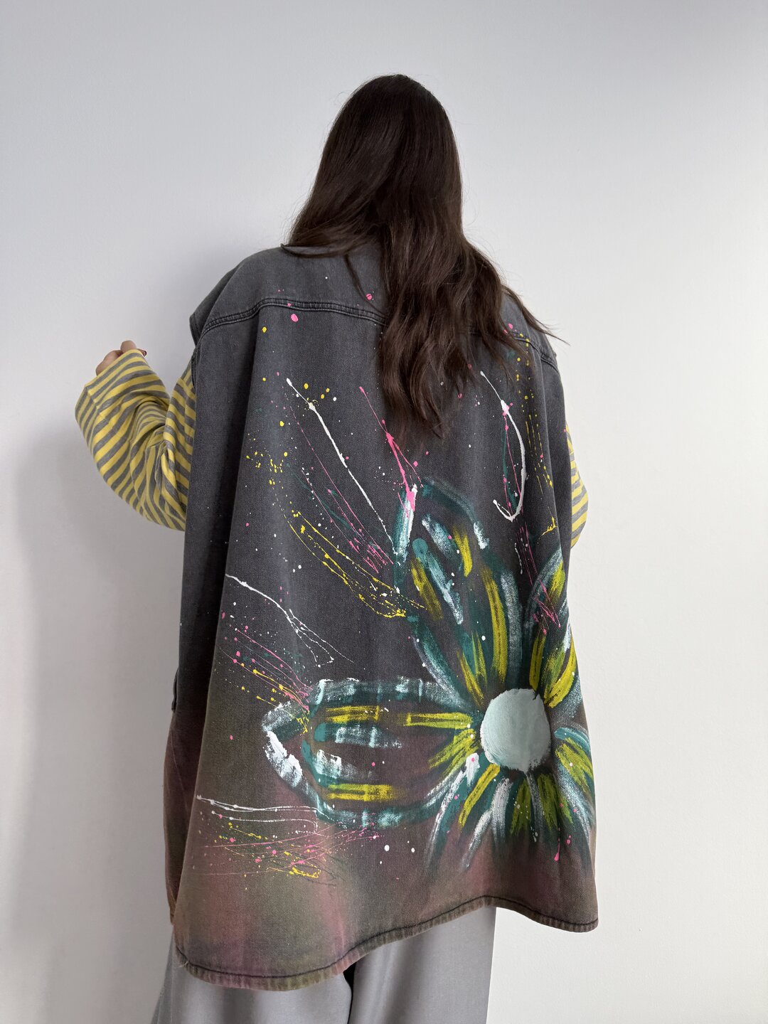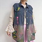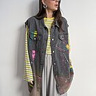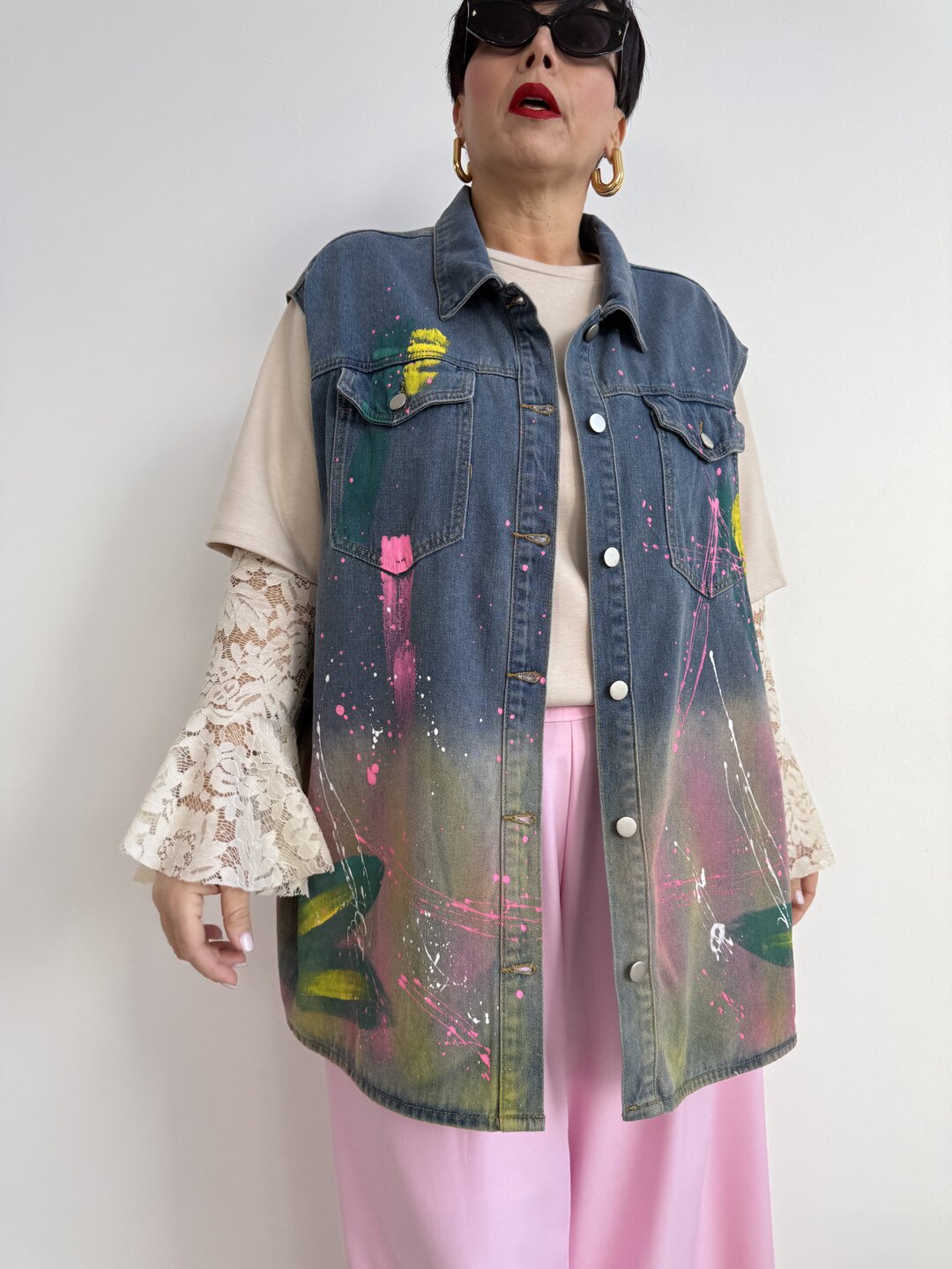 Modello maxi gilet in denim con stampa effetto vernice davanti e sul dietro. Allacciatura classica con bottoni.