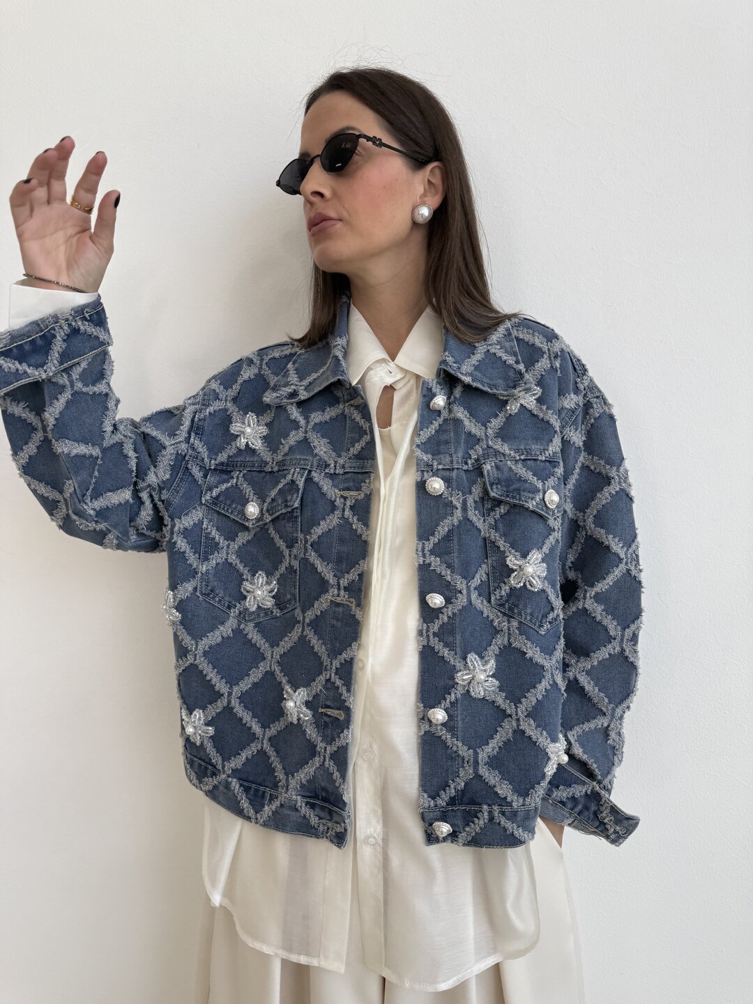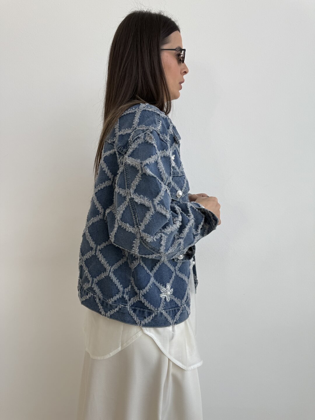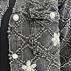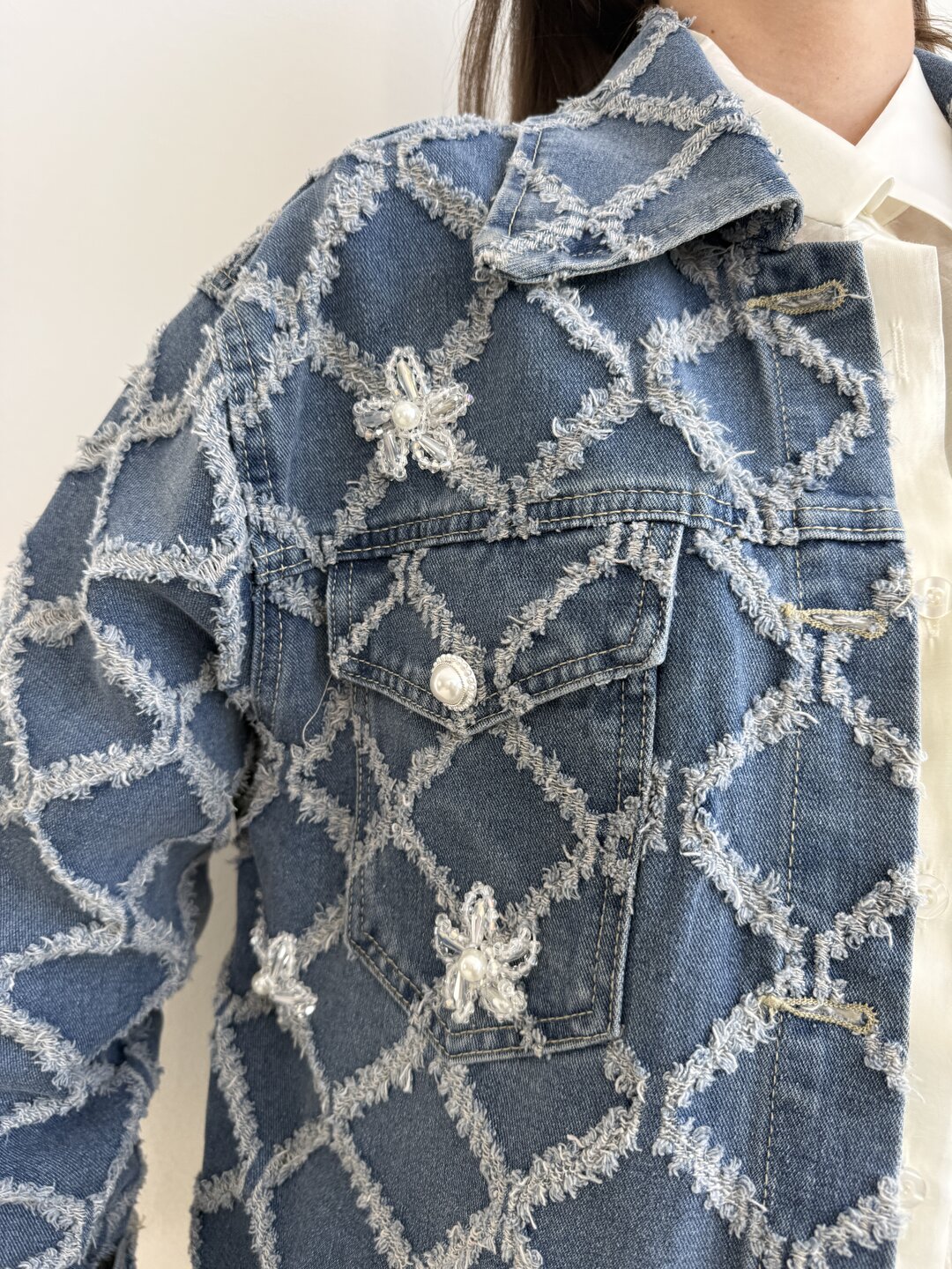 modello a scatola in denim. Dettaglio di ricamo a rombi con applicazioni di perle sui bottoni e sul davanti.