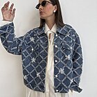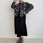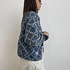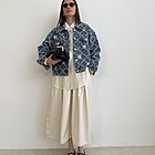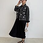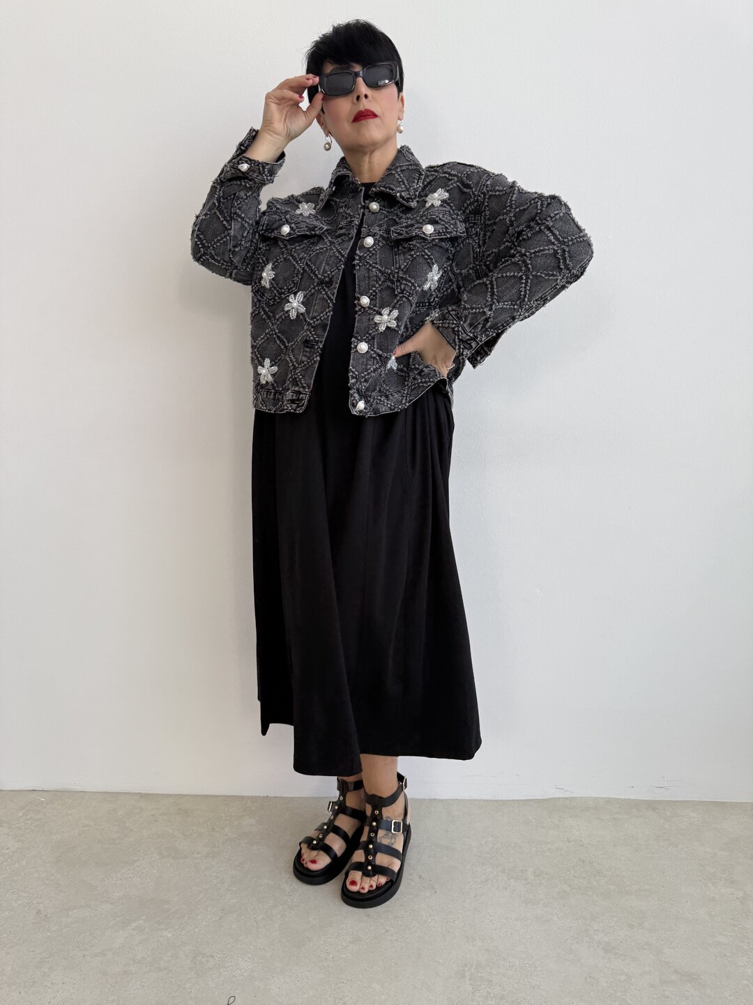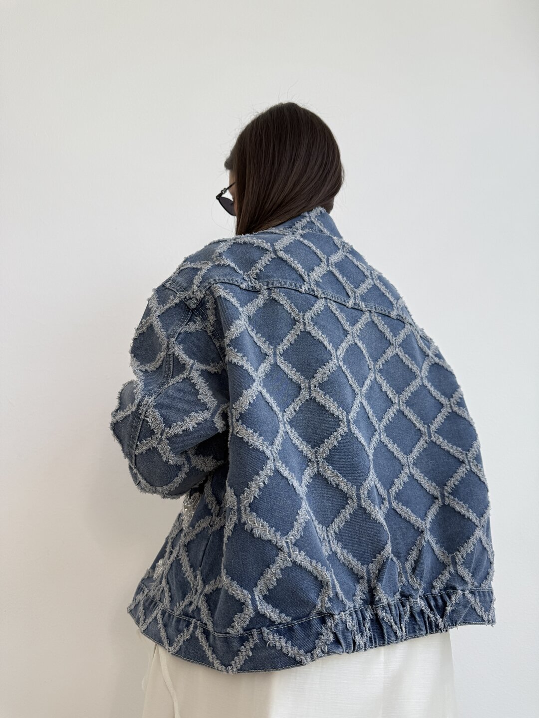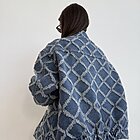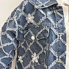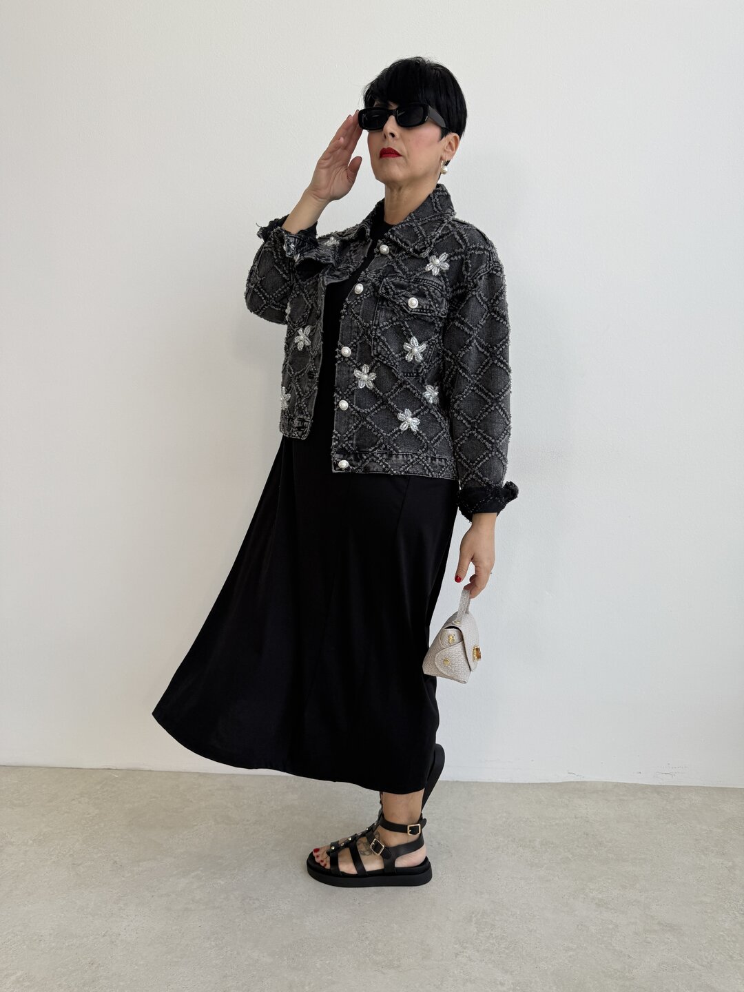 modello a scatola in denim. Dettaglio di ricamo a rombi con applicazioni di perle sui bottoni e sul davanti.
