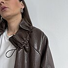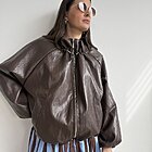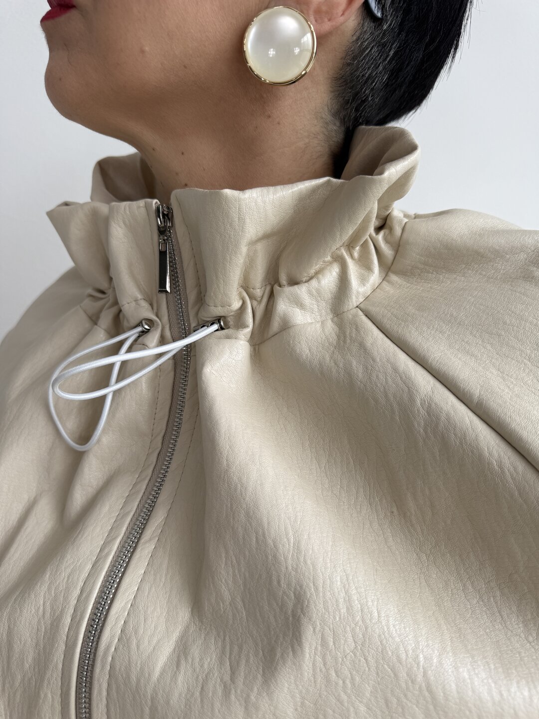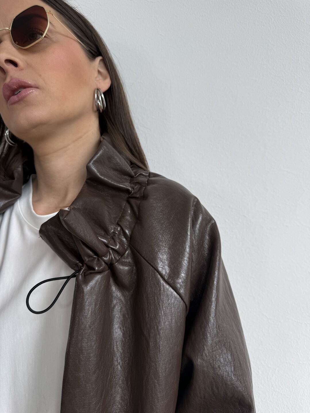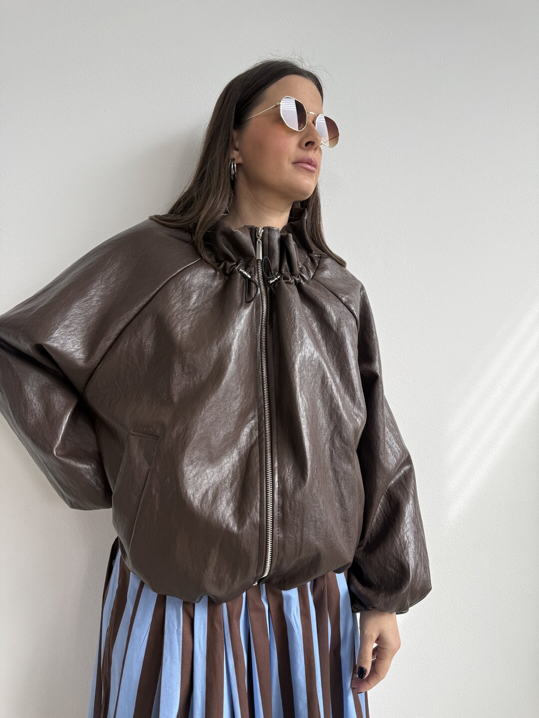 Modello simil bomber in ecopelle leggermente lucido con colletto effetto rouches e finale bombato a nuvoletta. Chiusura con zip totale e tasche laterali trasversali.