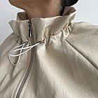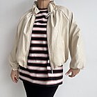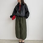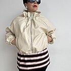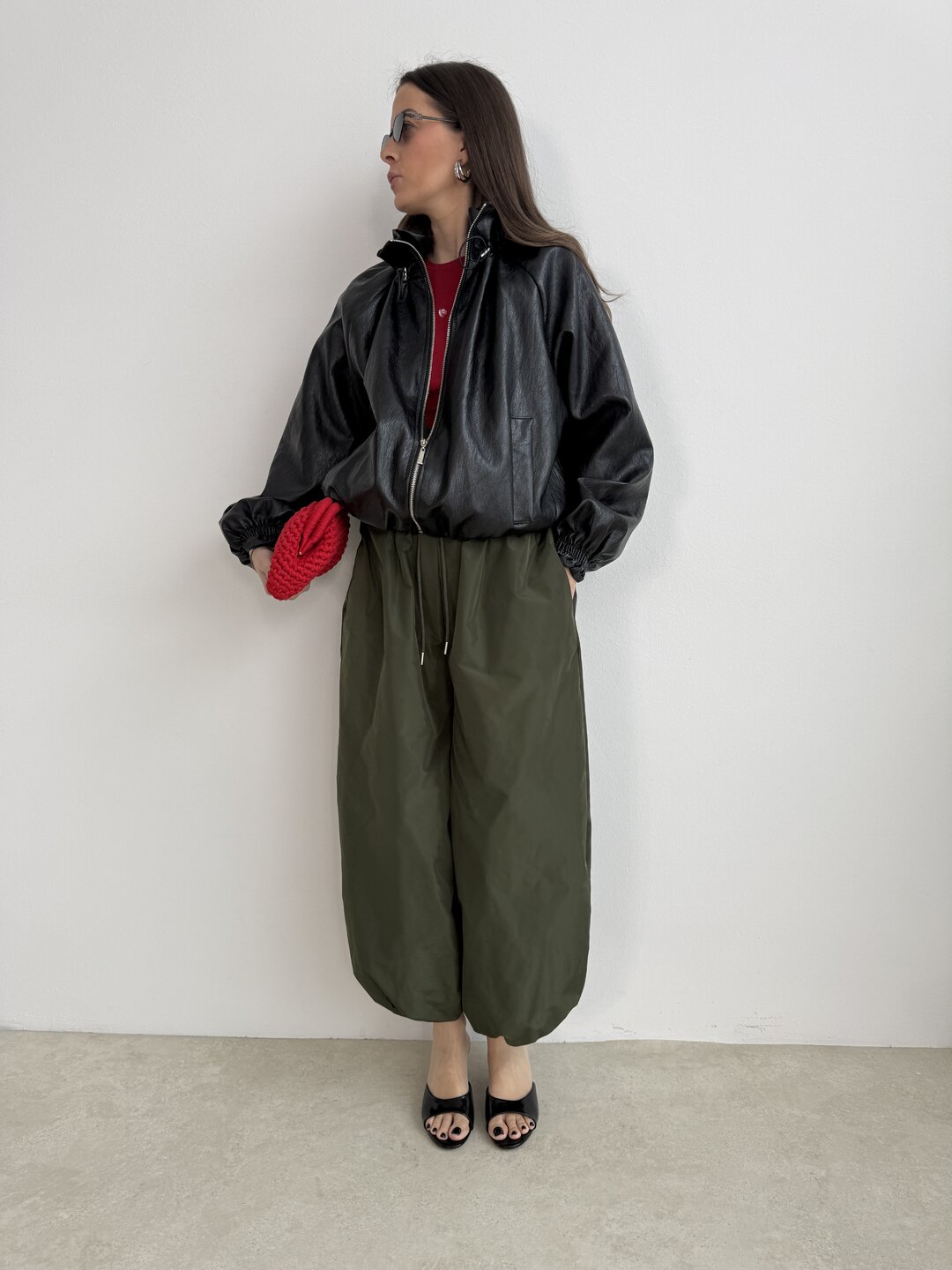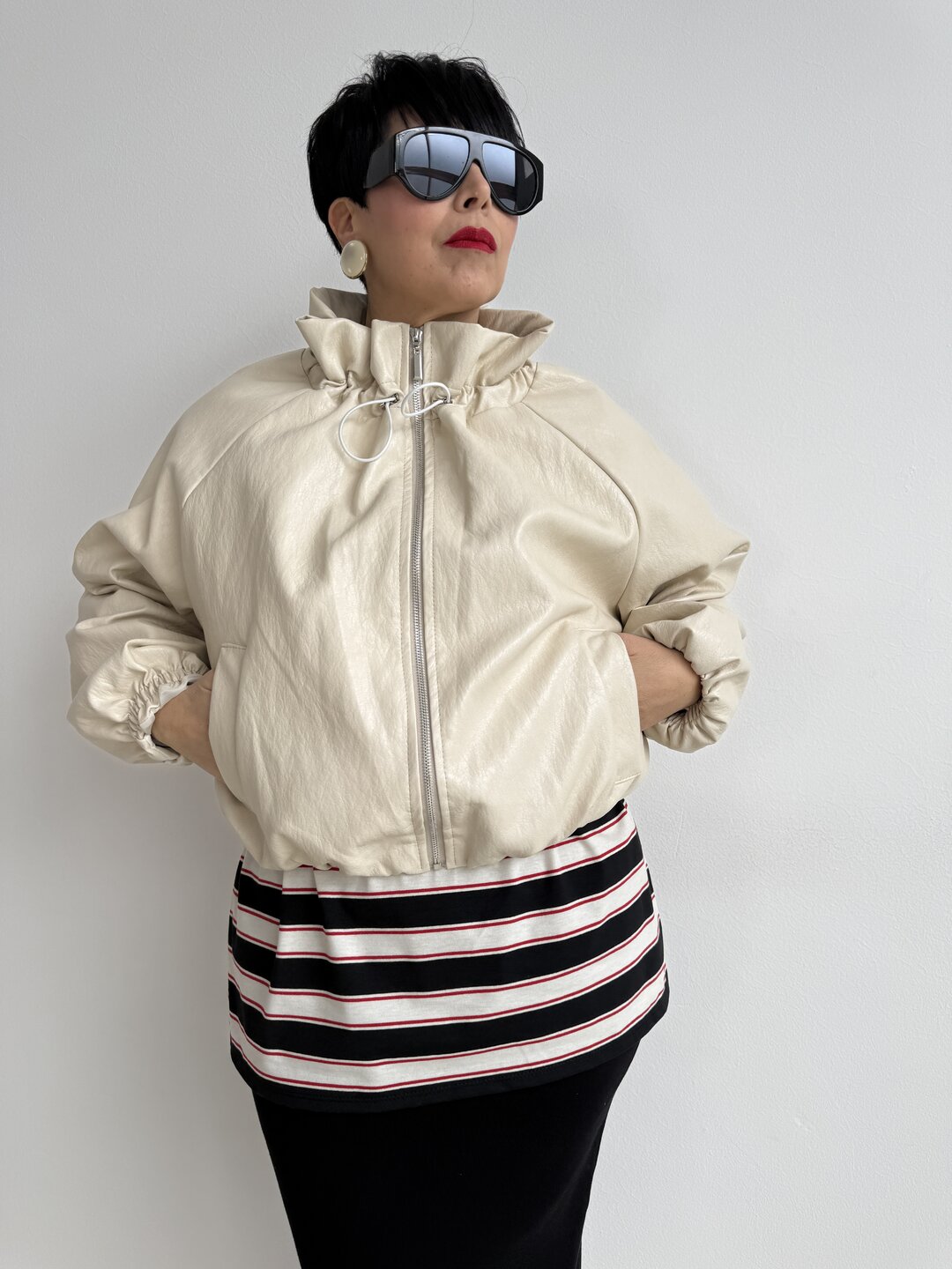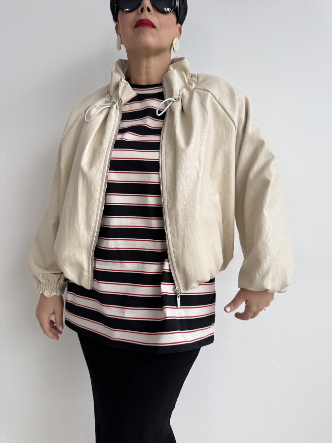 Modello simil bomber in ecopelle leggermente lucido con colletto effetto rouches e finale bombato a nuvoletta. Chiusura con zip totale e tasche laterali trasversali.