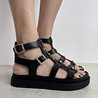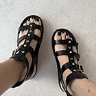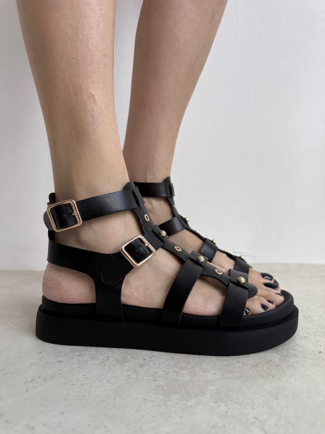 modello con fascette, doppio cinturino regolabile alla caviglia con fibbia e dettagli oro.