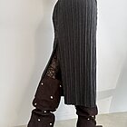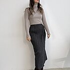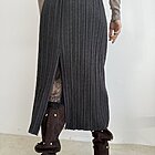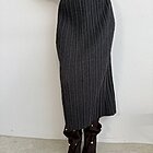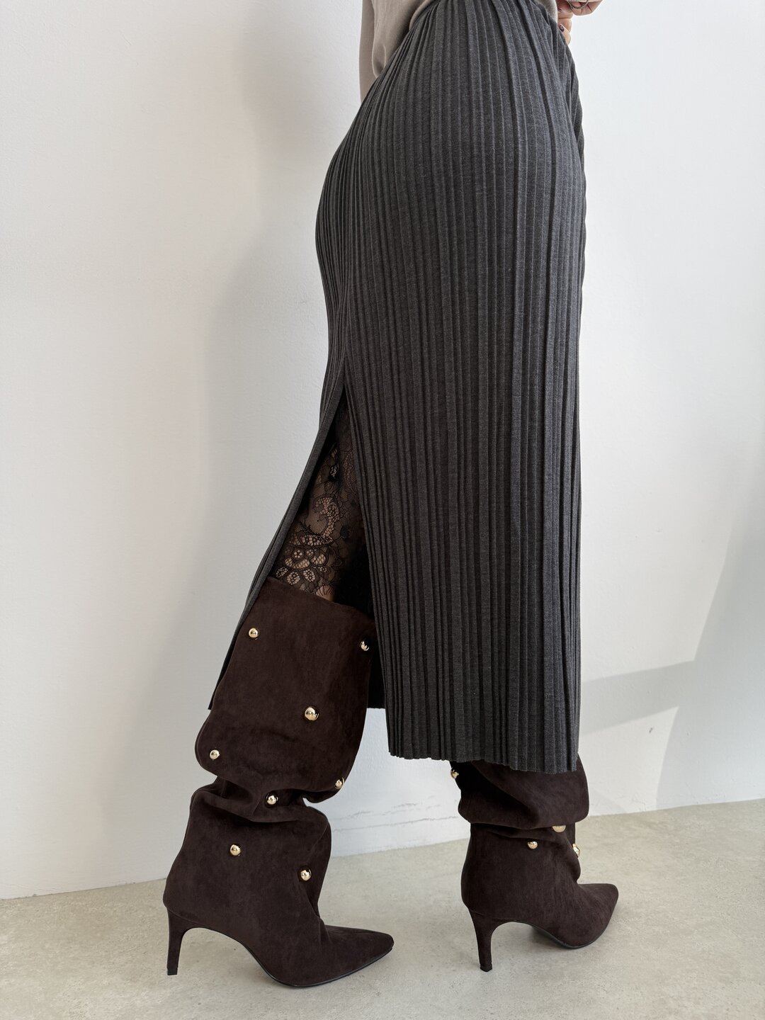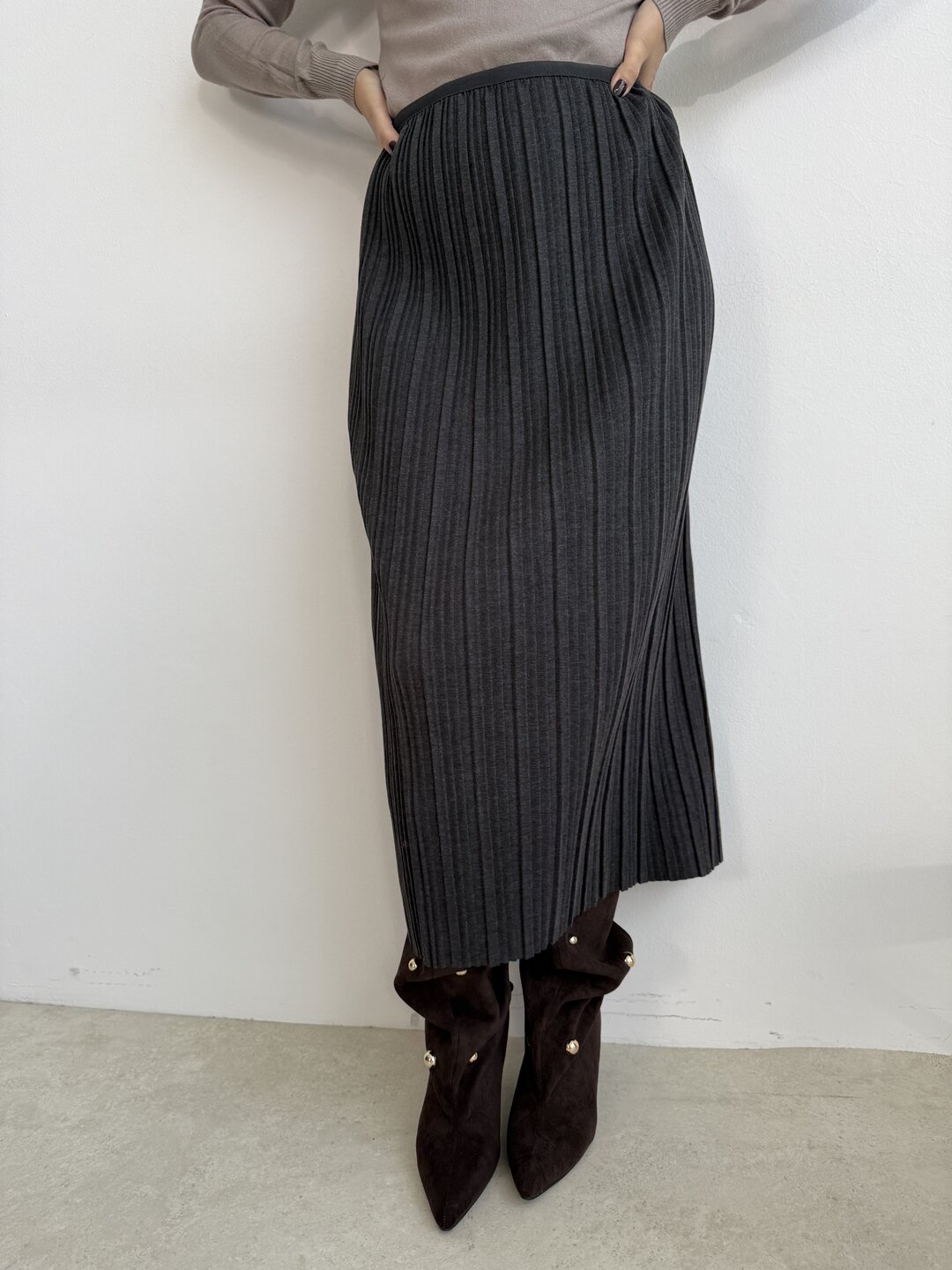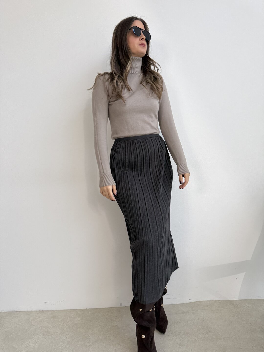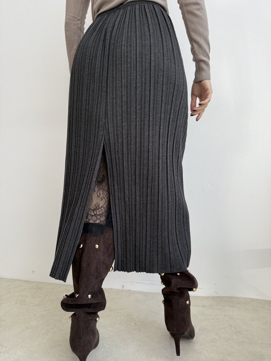 Modello midi con tessuto plissettato a molla. Elastico in vita, spacco laterale con riporto pizzo nero