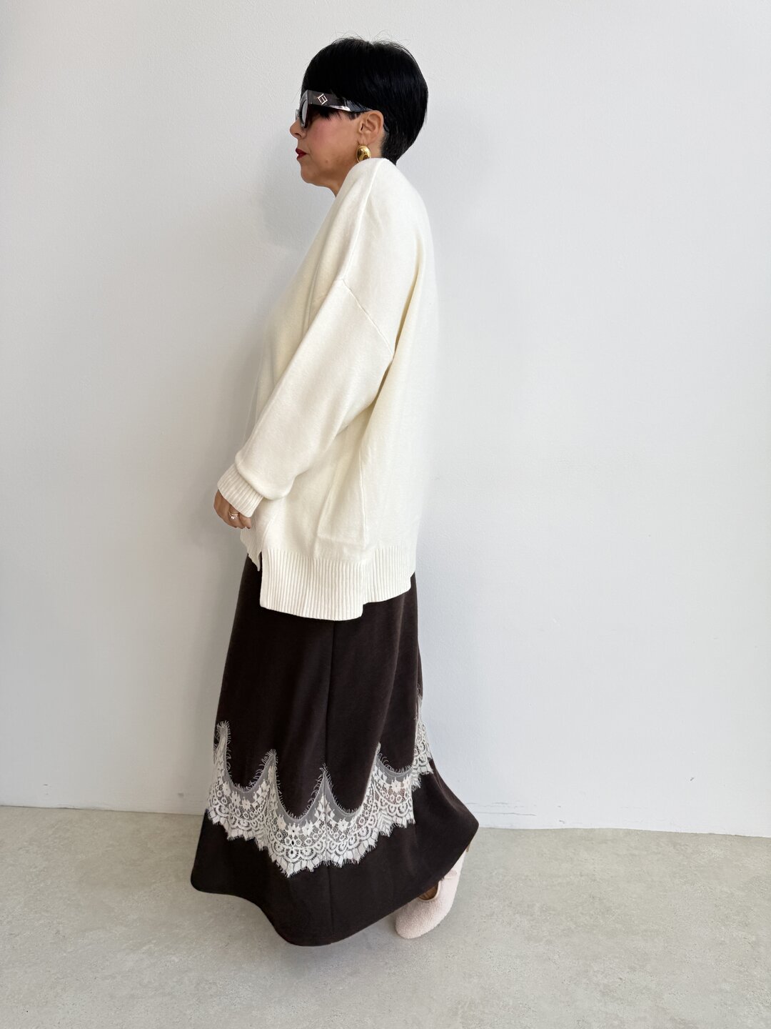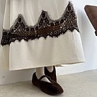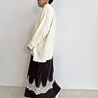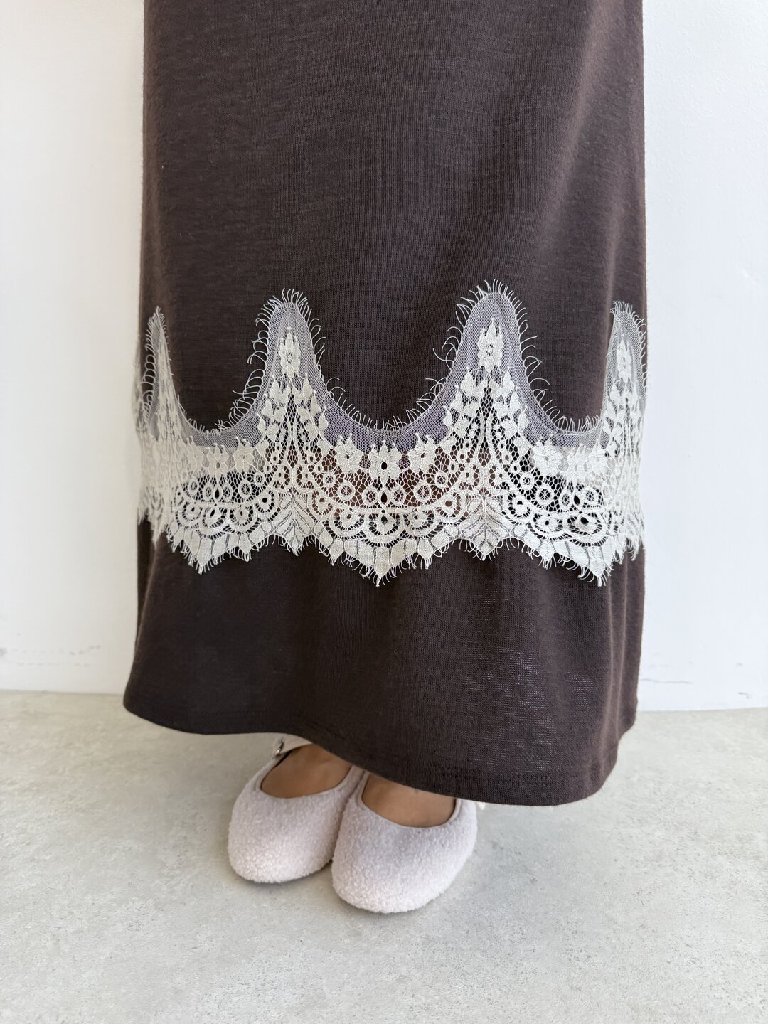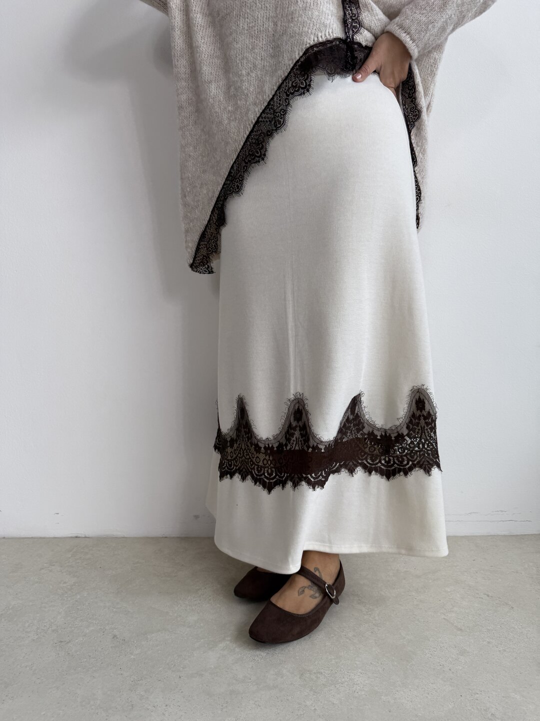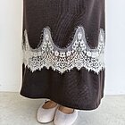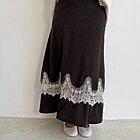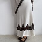 Modello lungo a campana con balza intermedia finale in pizzo. Senza chiusura ma con molla in vita elasticizzata.