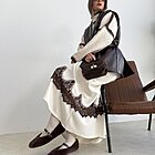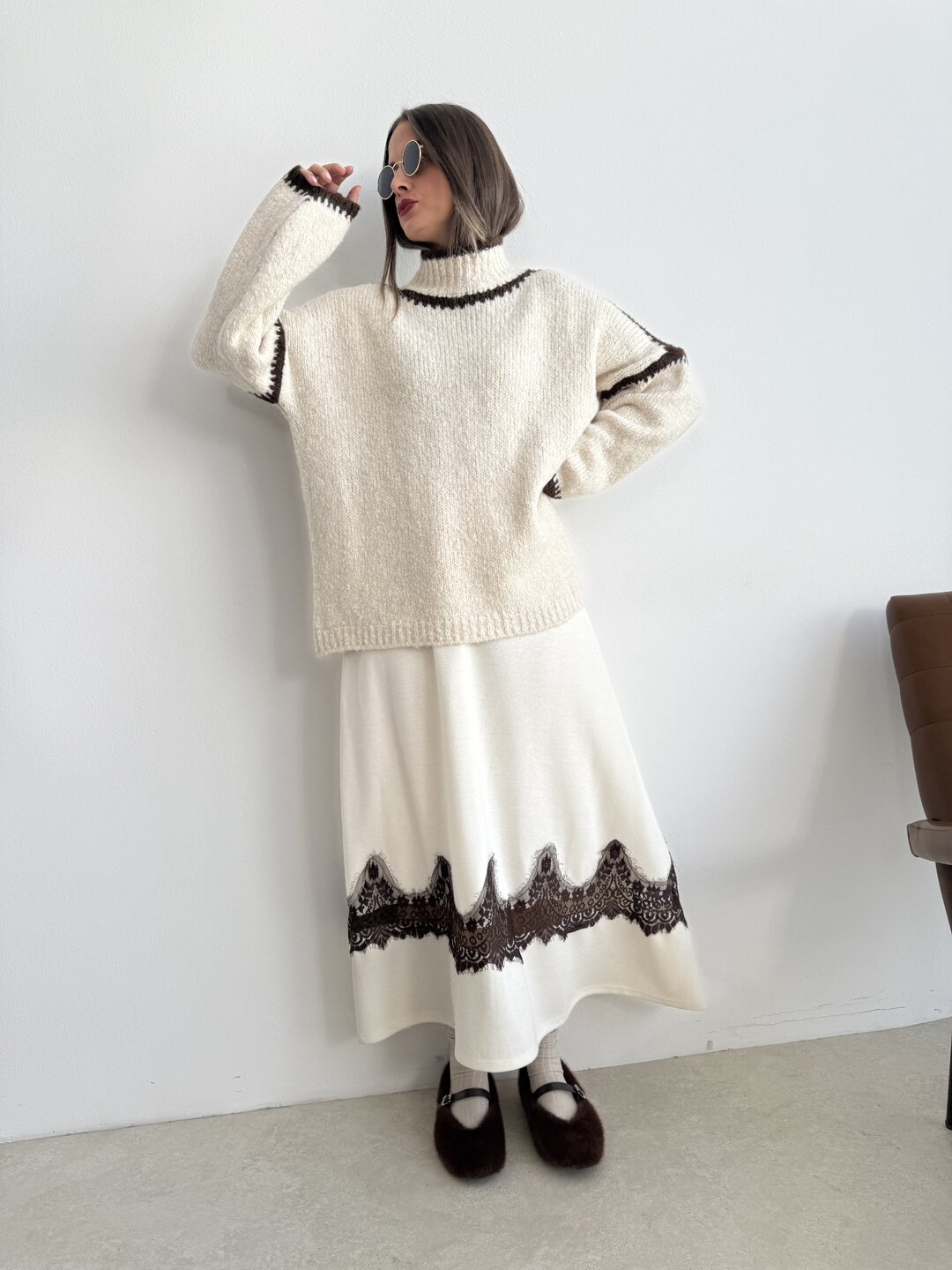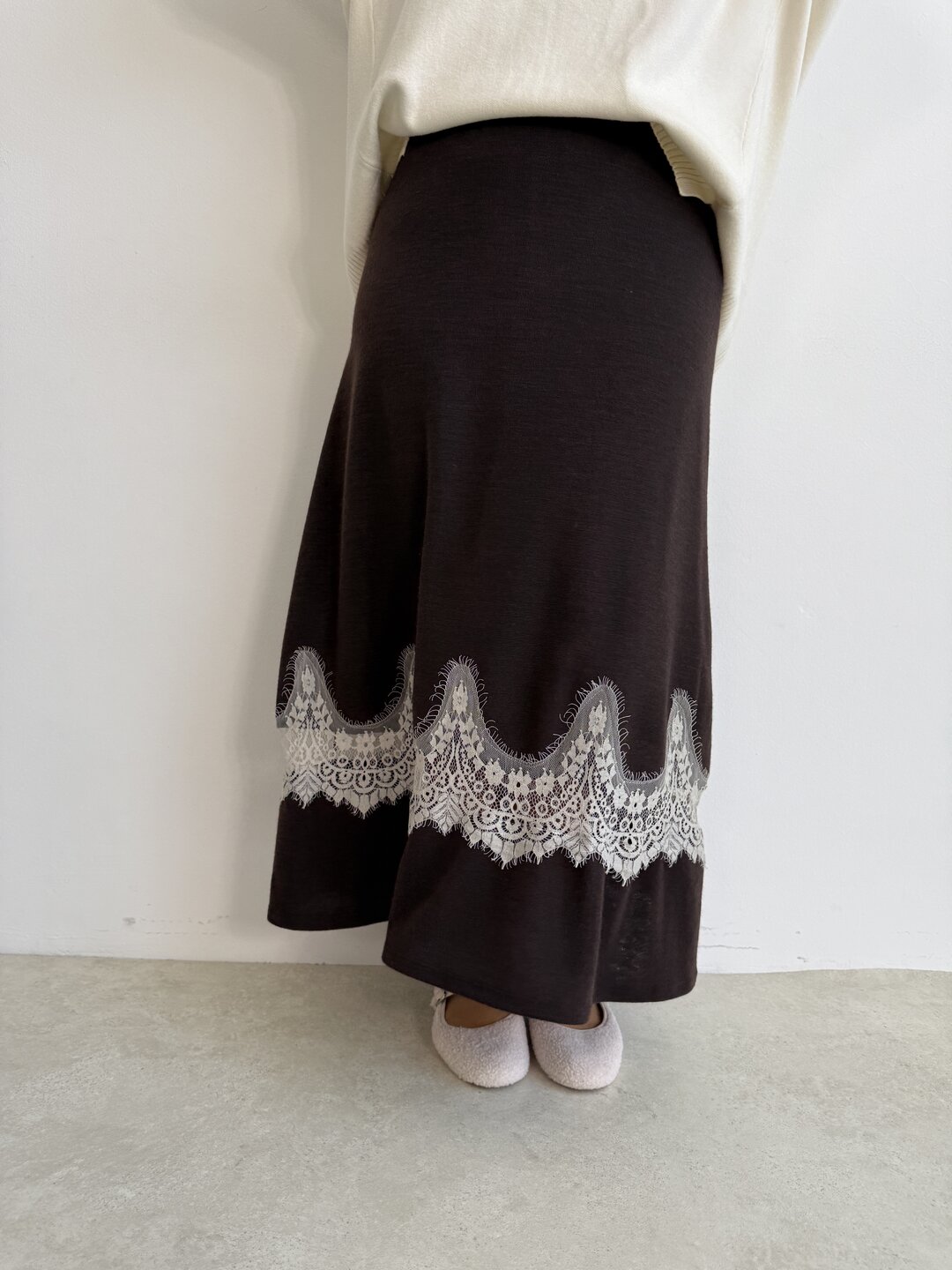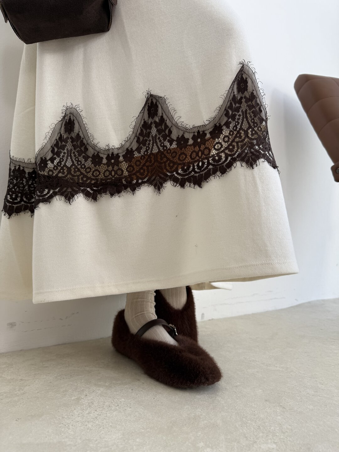 Modello lungo a campana con balza intermedia finale in pizzo. Senza chiusura ma con molla in vita elasticizzata.