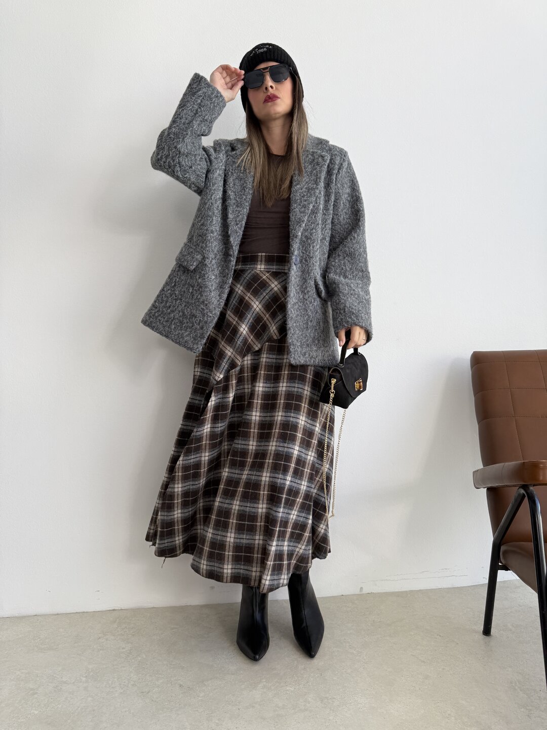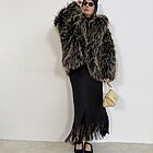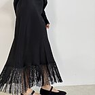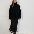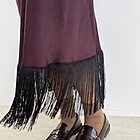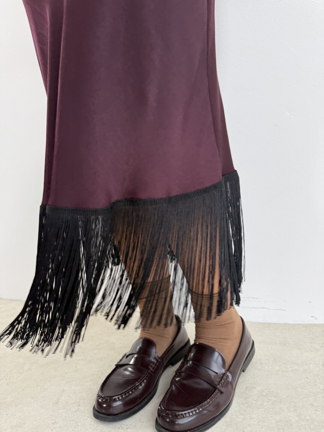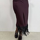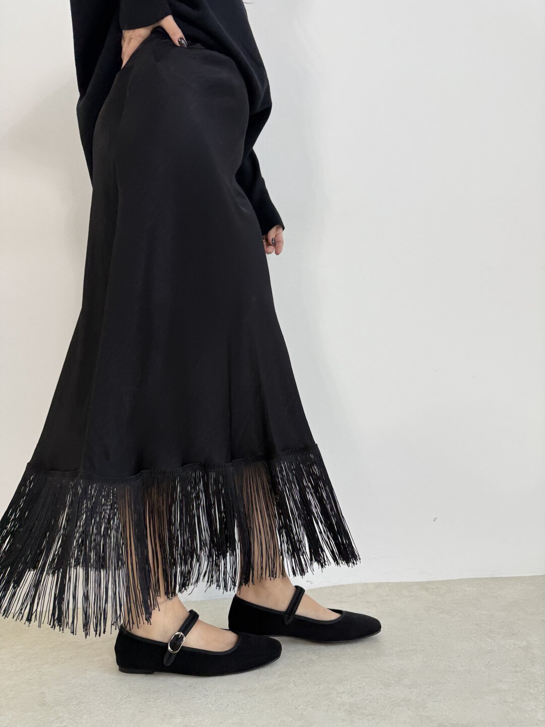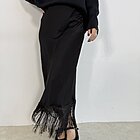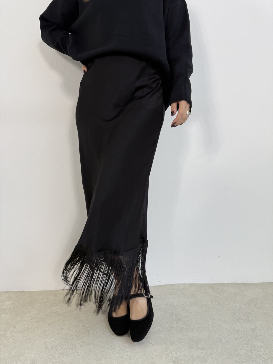 Gonna lunga satinata. Orlo rifinito in frangette. Elastico in vita. Vestibilità regolare.