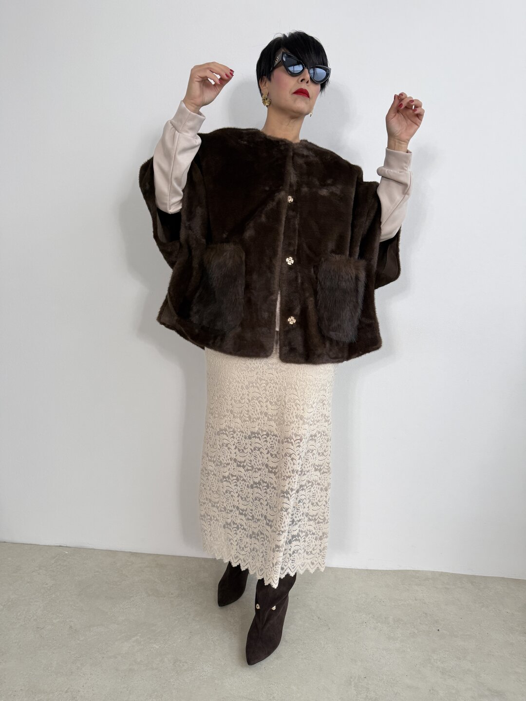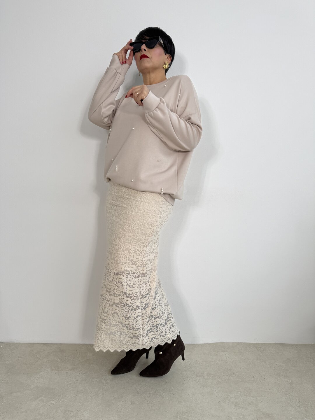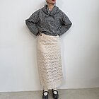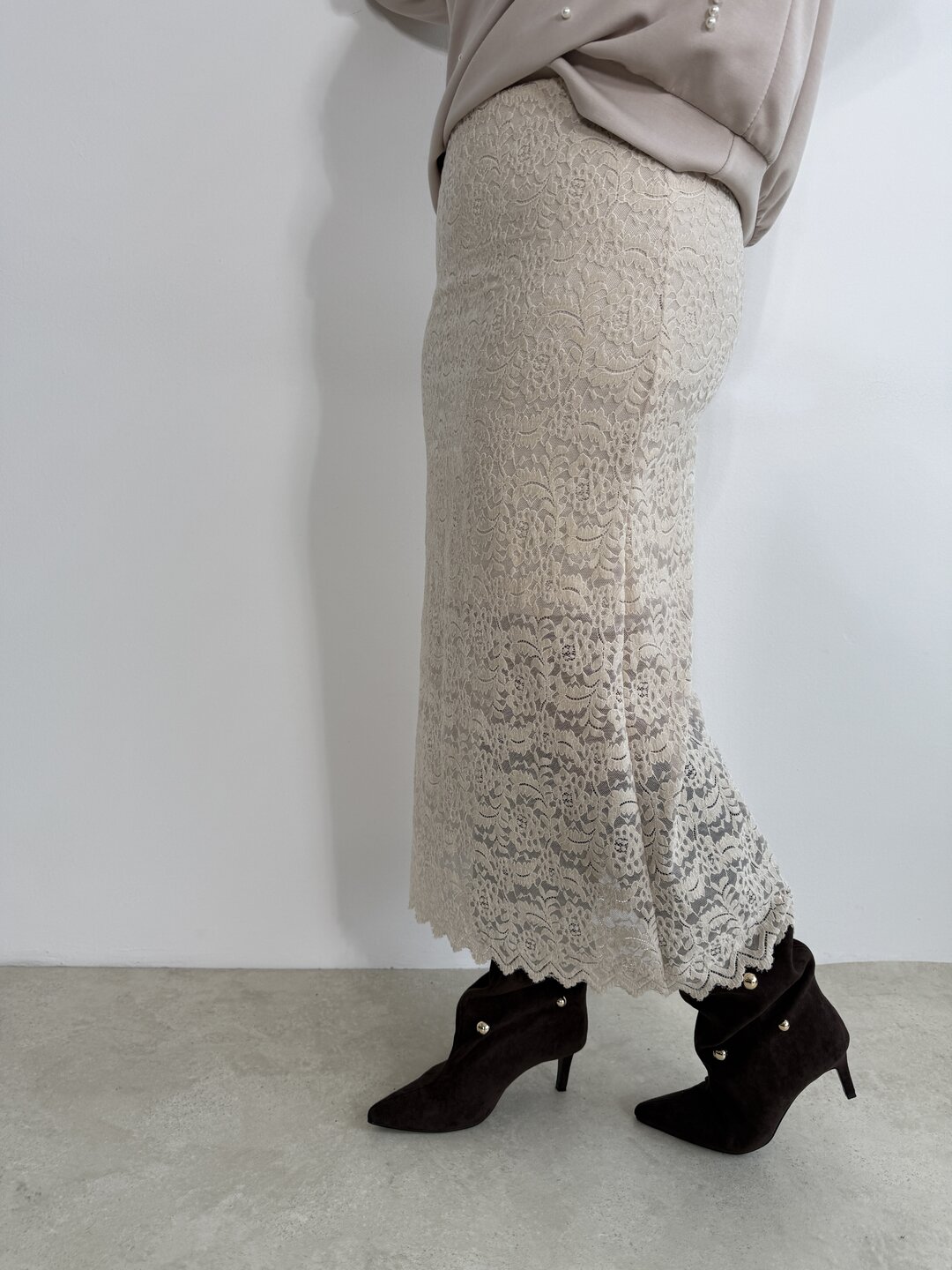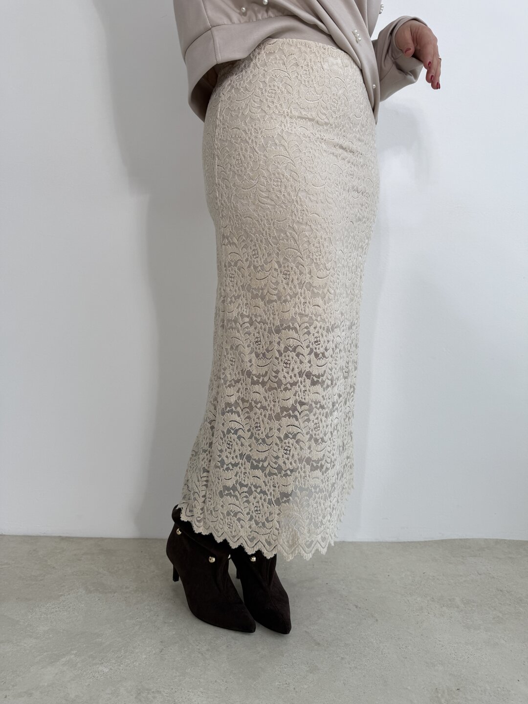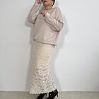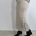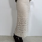 Modello lungo in pizzo a campana senza allacciatura con elastico in vita e sottoveste all’interno.