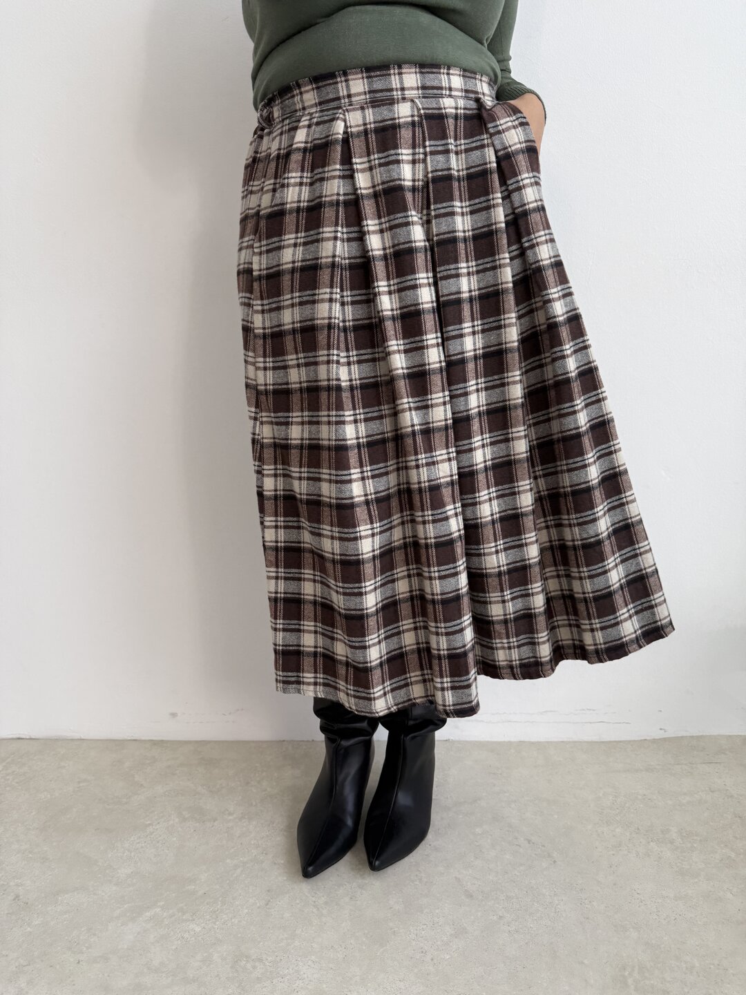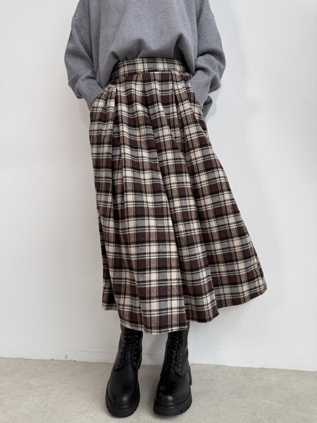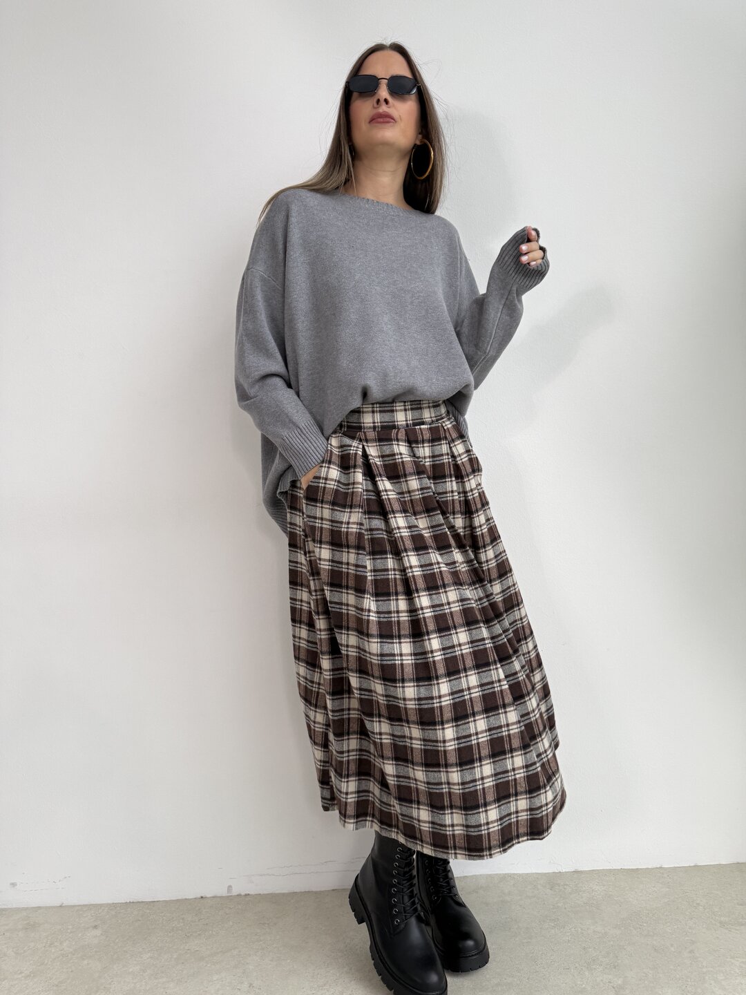 Modello a campana con pinces sul davanti. Molla elasticizzata sulla parte del retro. Tasche laterali.