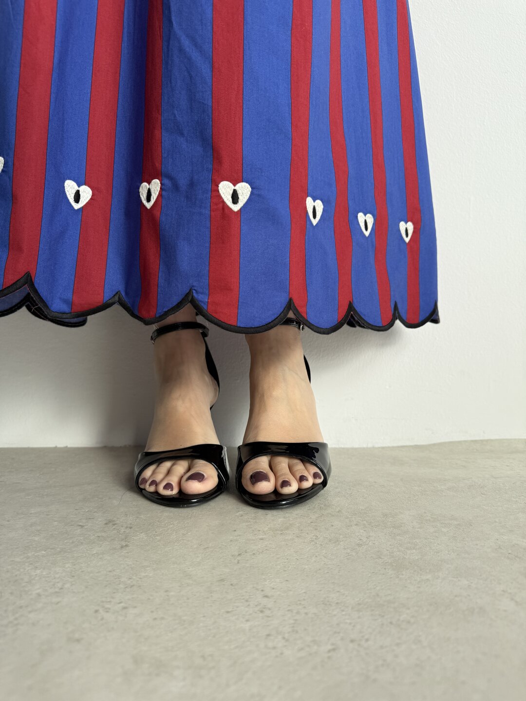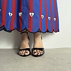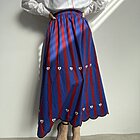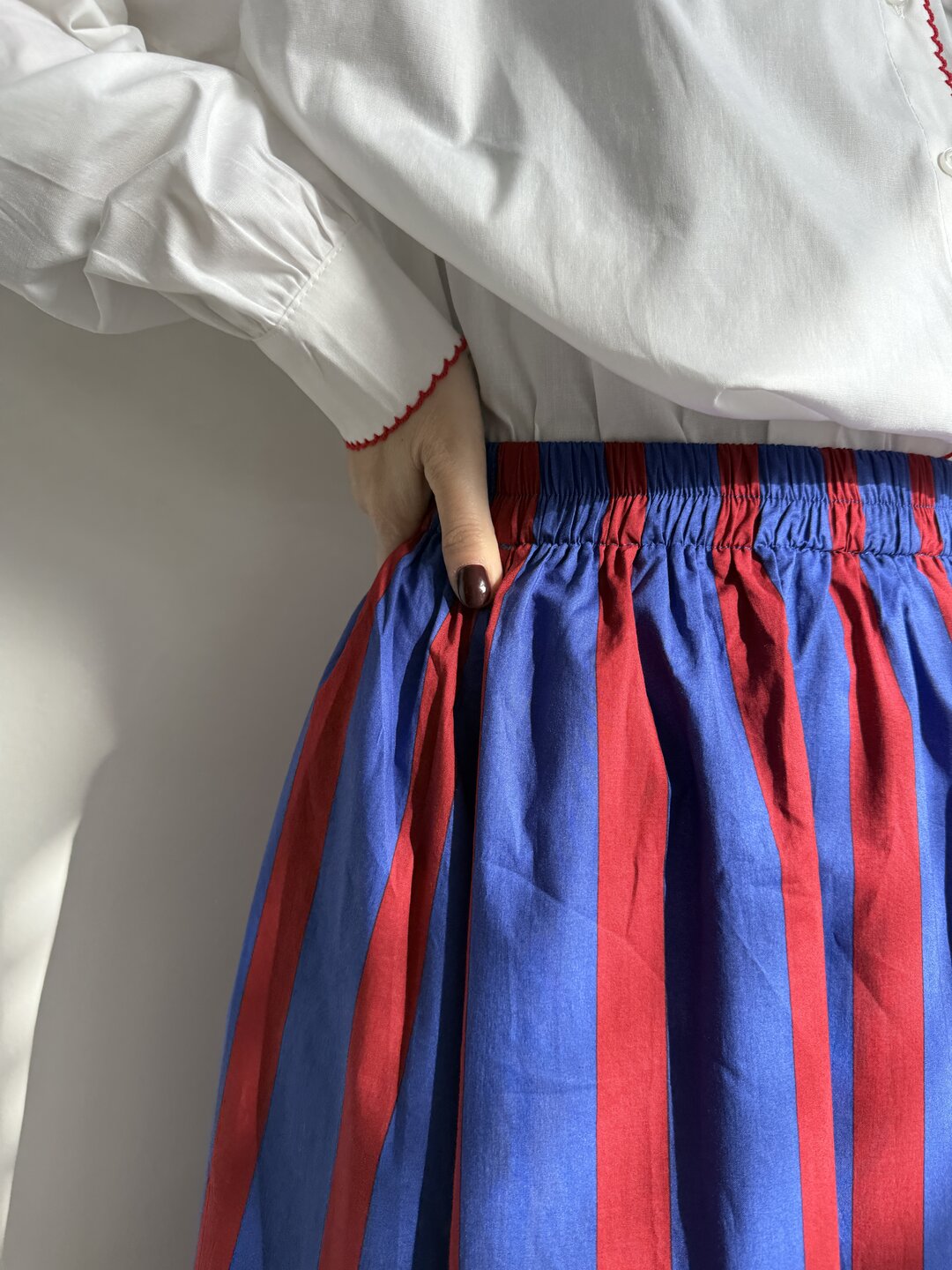 Modello gonna lunga ampia in cotone. Molla in vita. Fantasia a righe con applicazioni. Fondo con bordo a merletto.