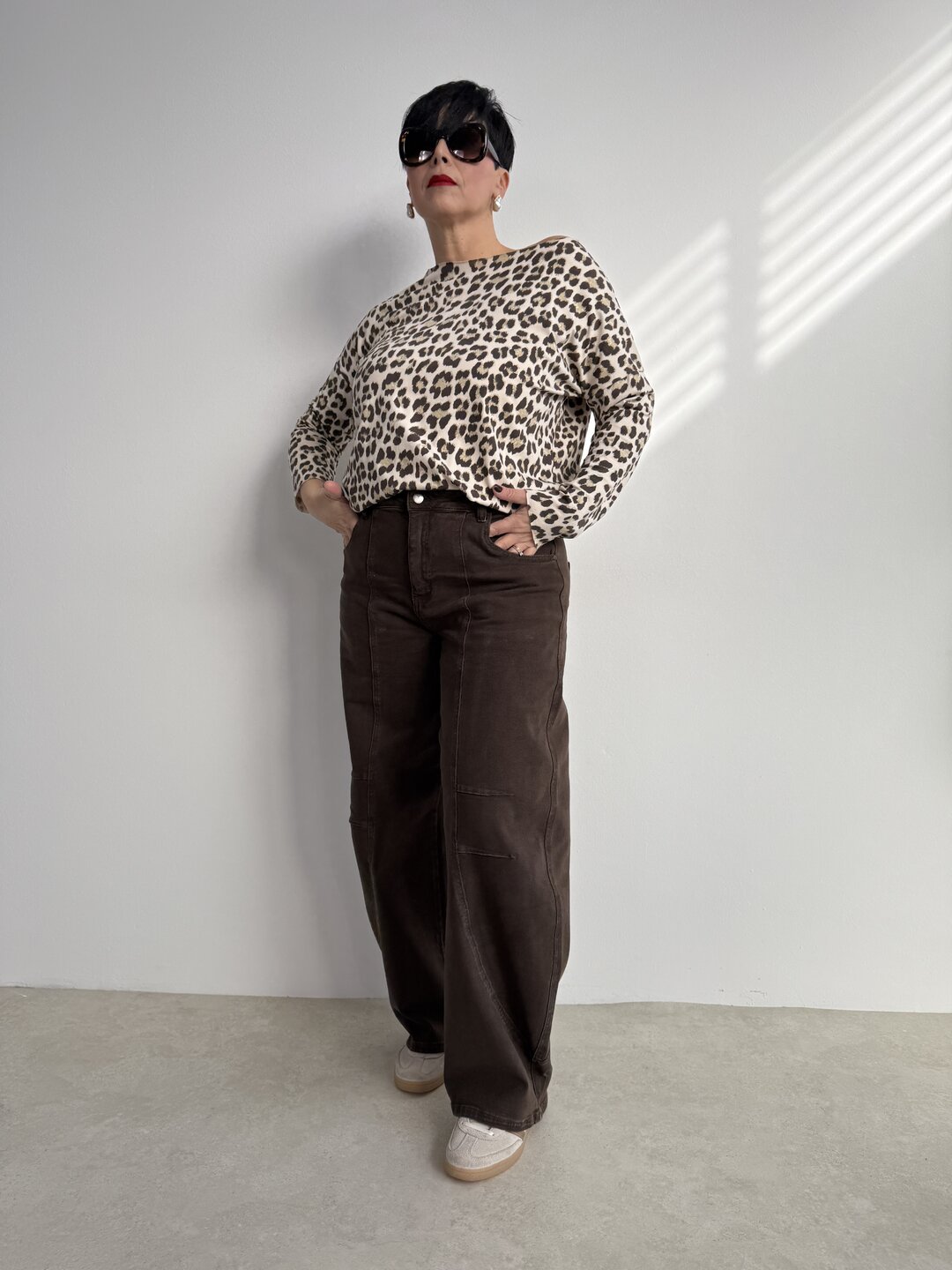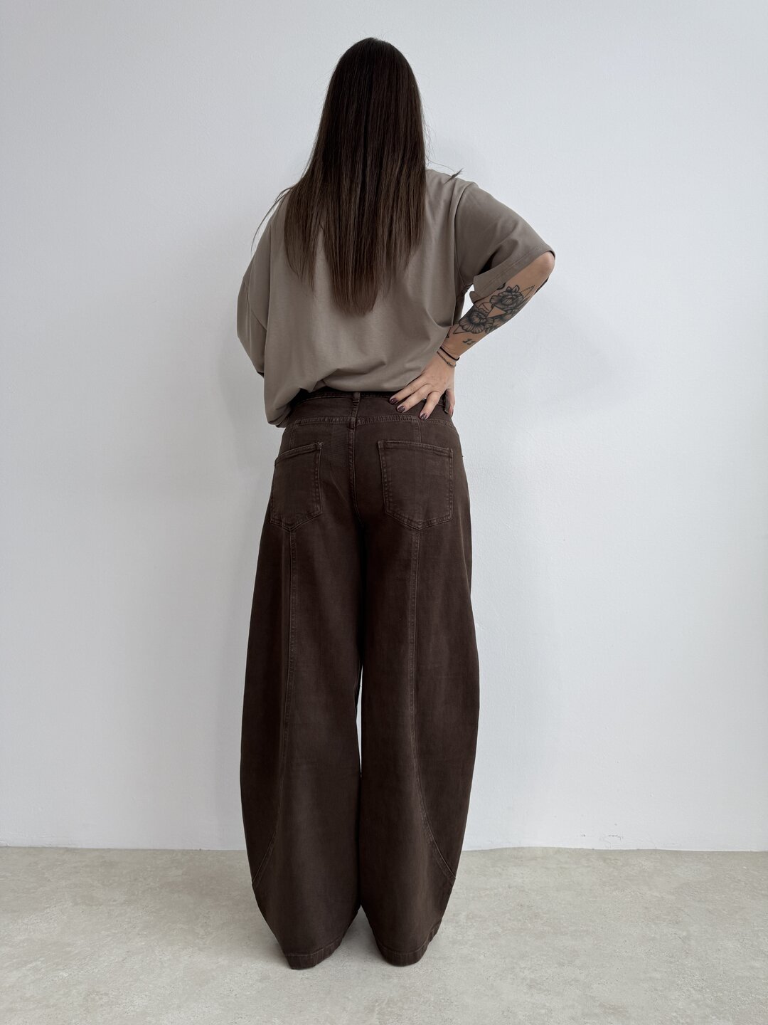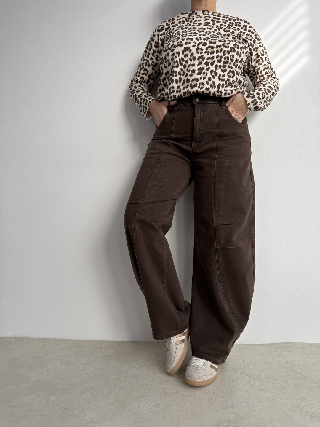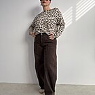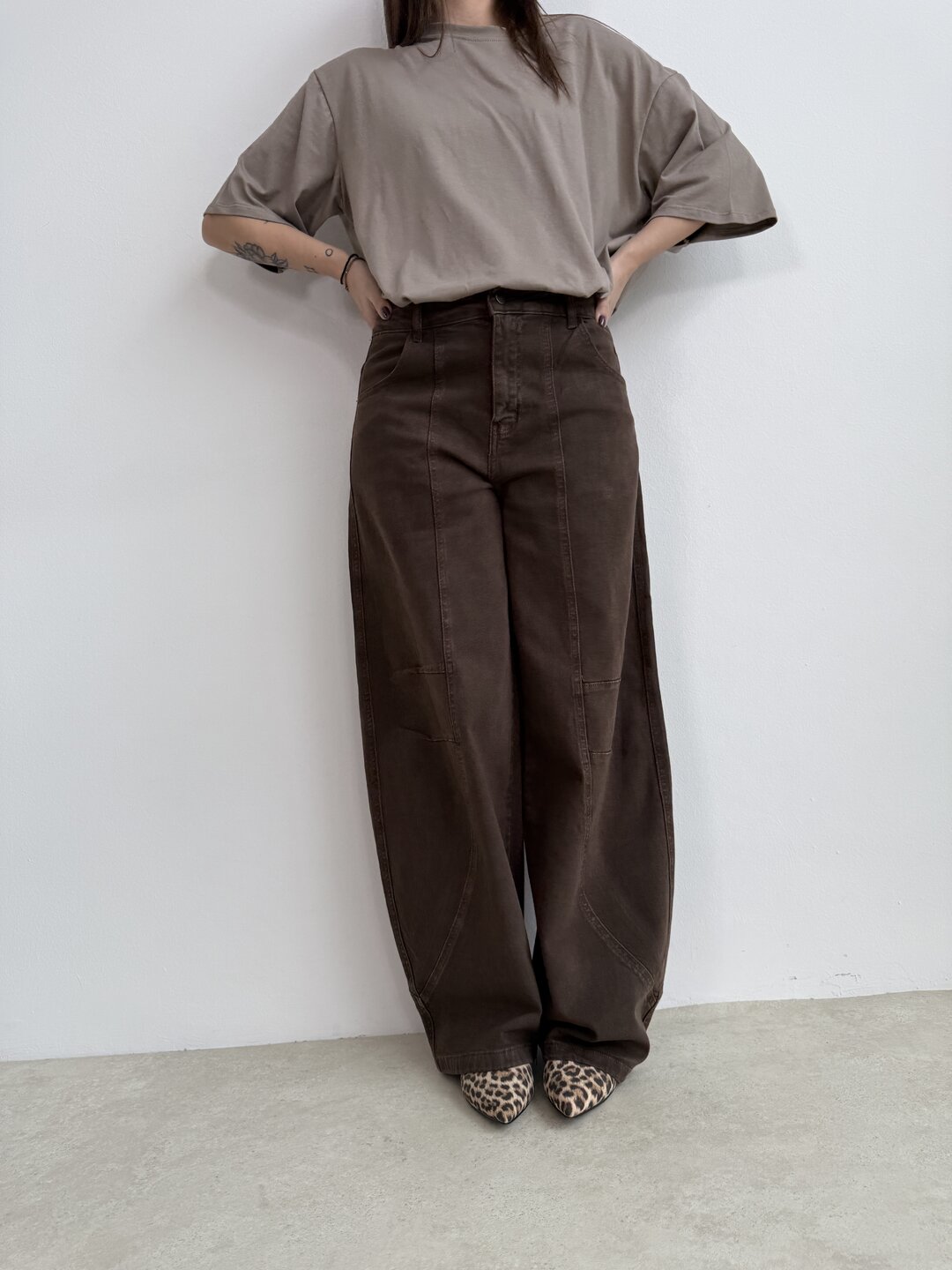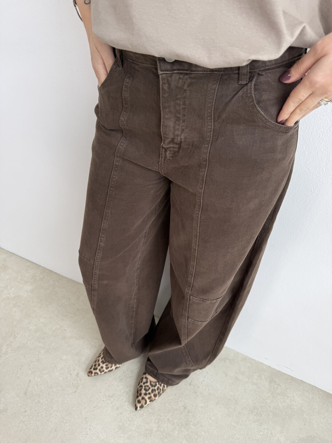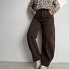 Modello jeans ovetto marrone. Chiusura classica con bottone.