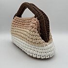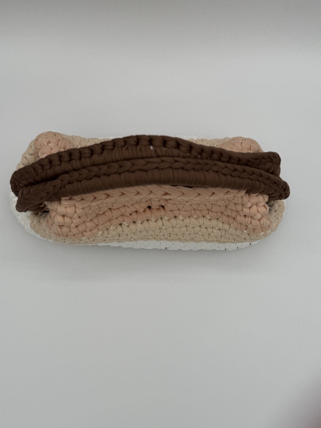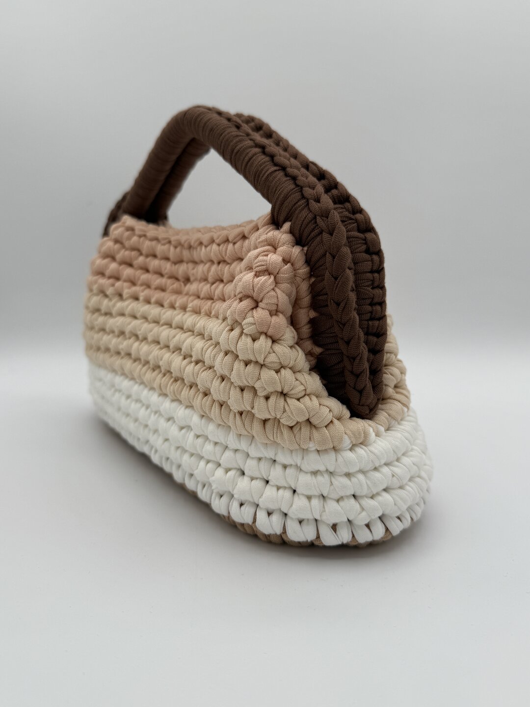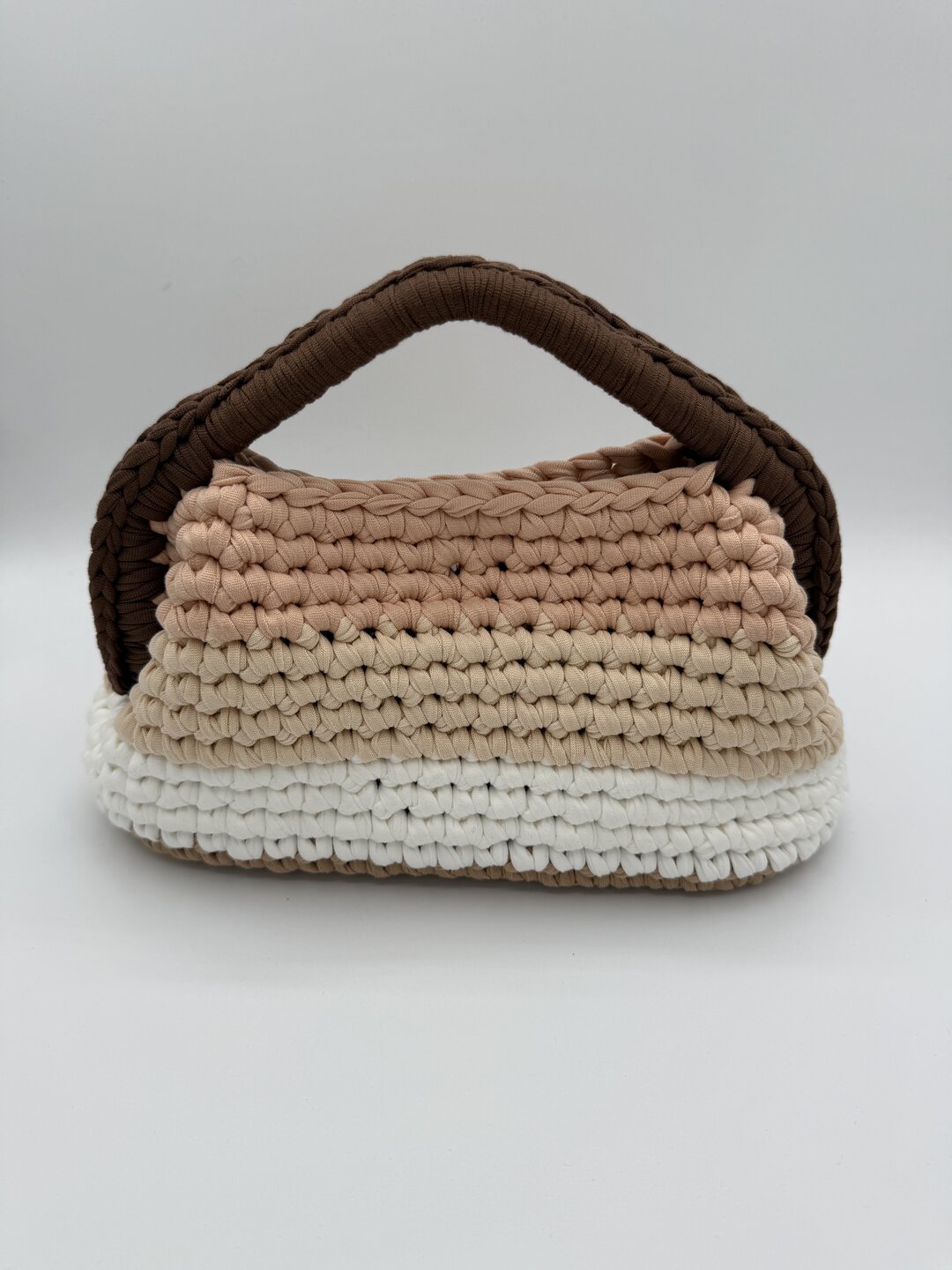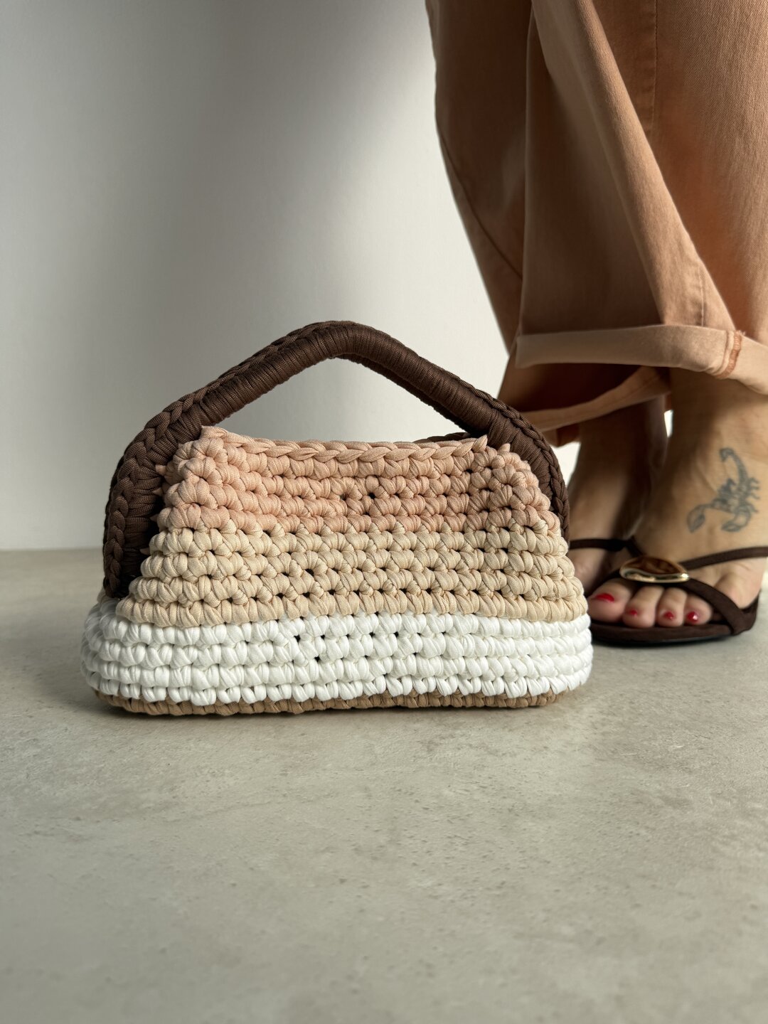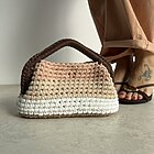 Modello clutch in tessuto crochet (effetto uncinetto). Tracolla con catena oro removibile. Manico rigido