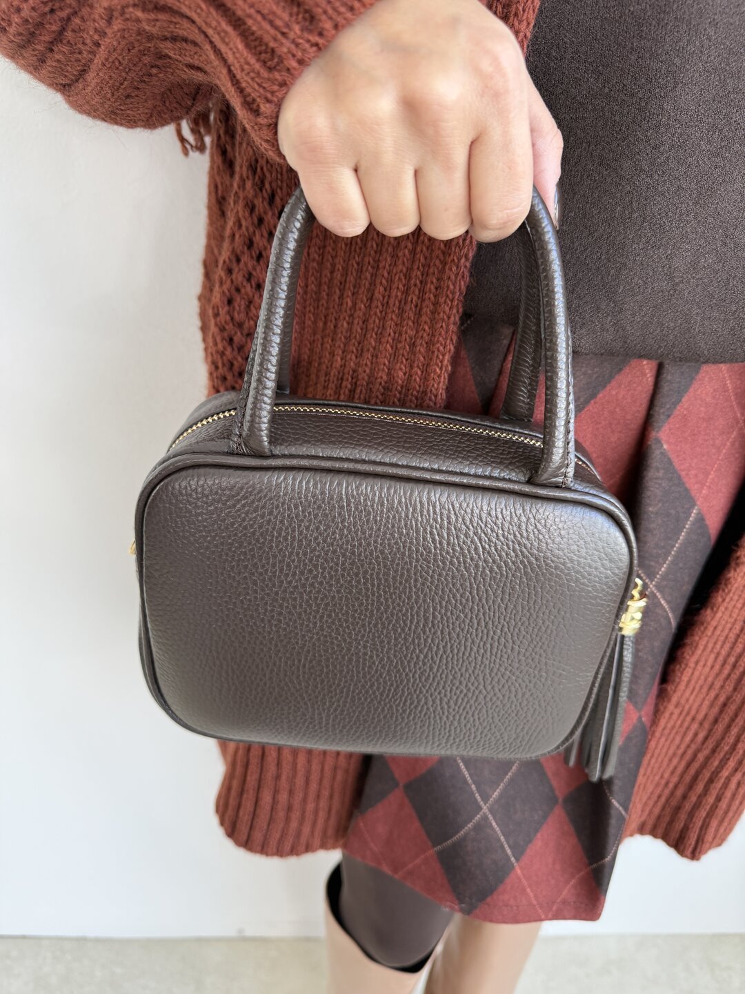 Modello mini bag in vera pelle con manico fisso e pattina sulla chiusura zip.