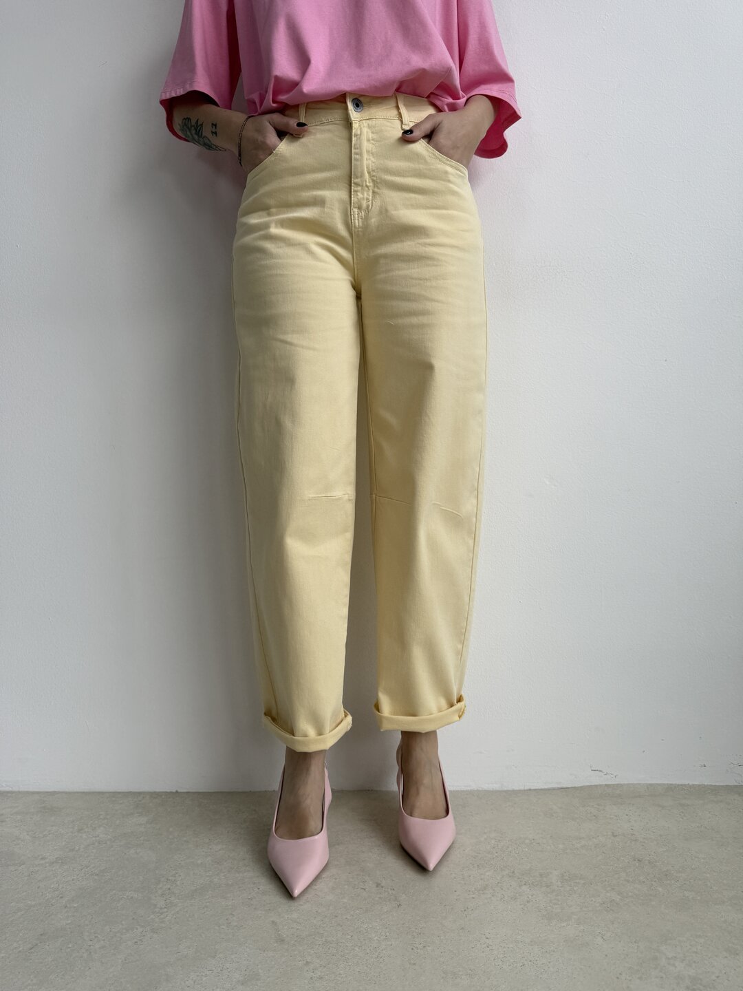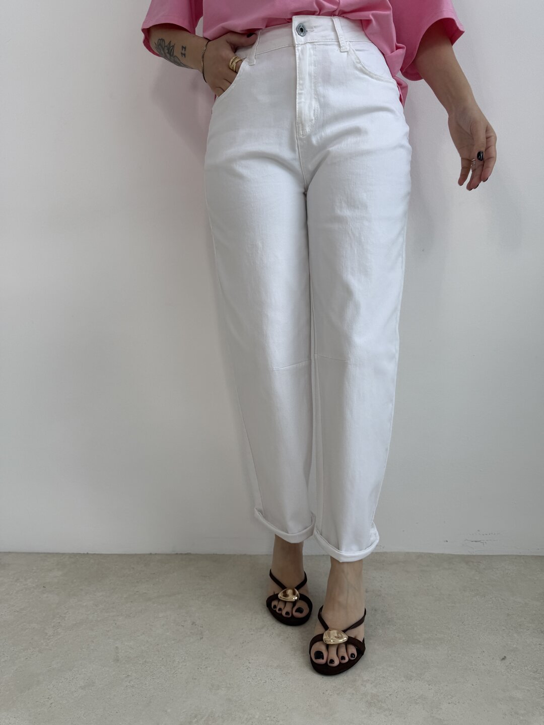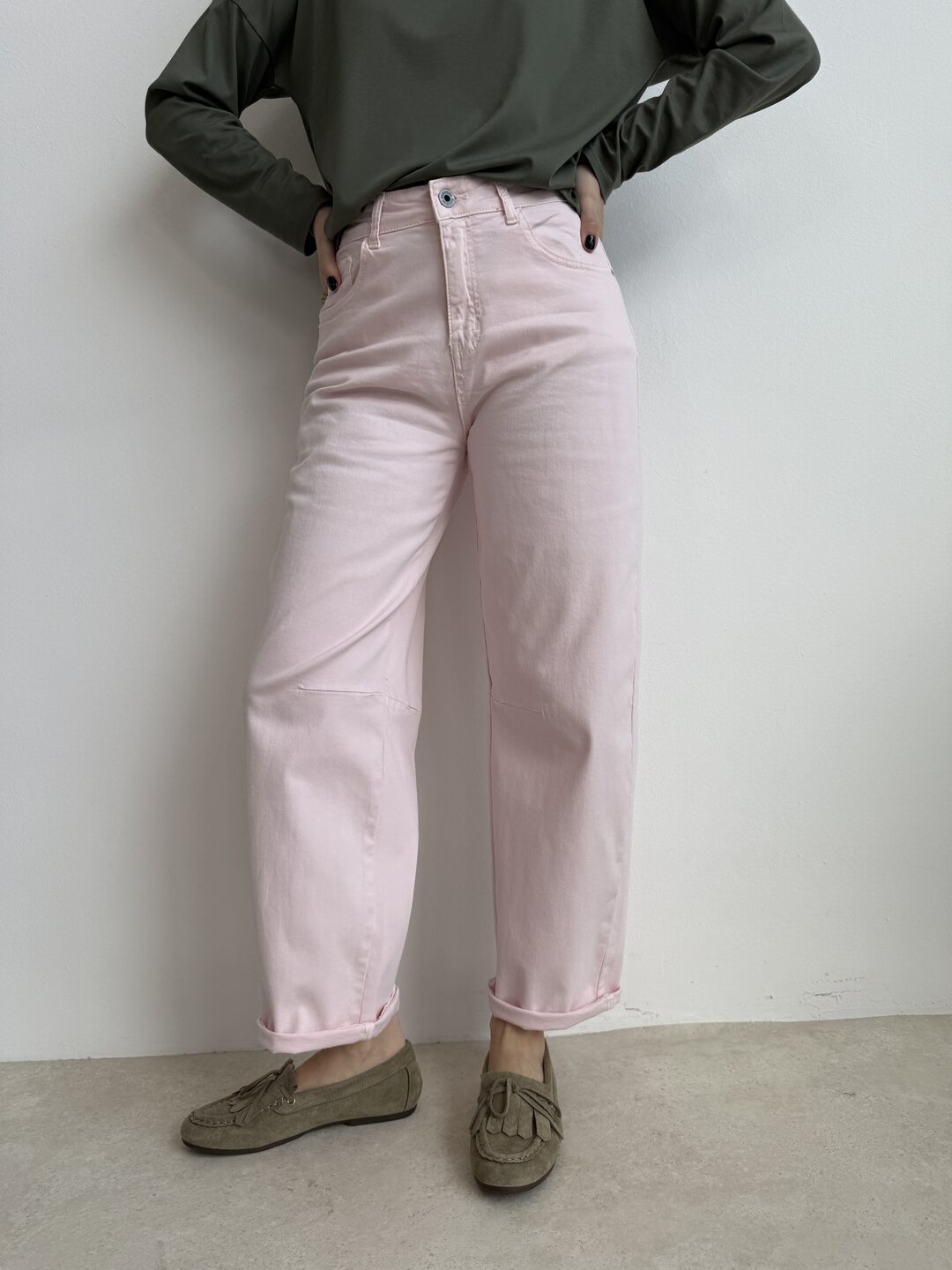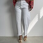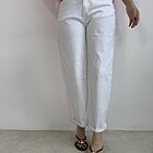 modello regolare con gamba morbida semi ovetto. Chiusura con bottone e zip. Tasche davanti e sul retro.
