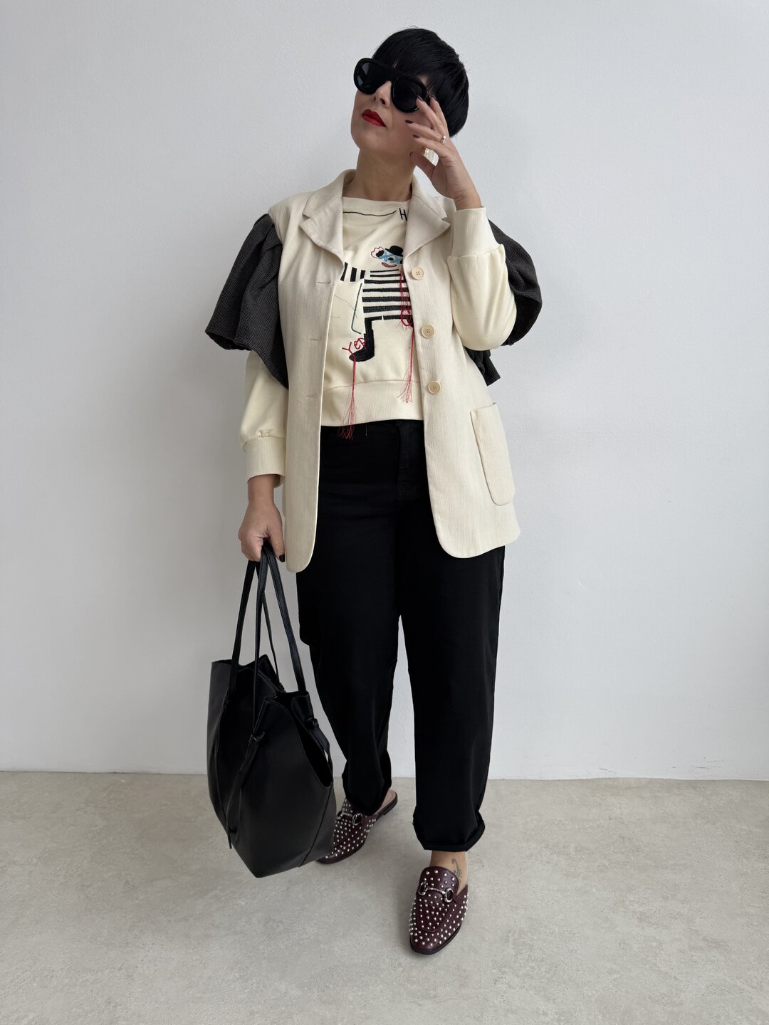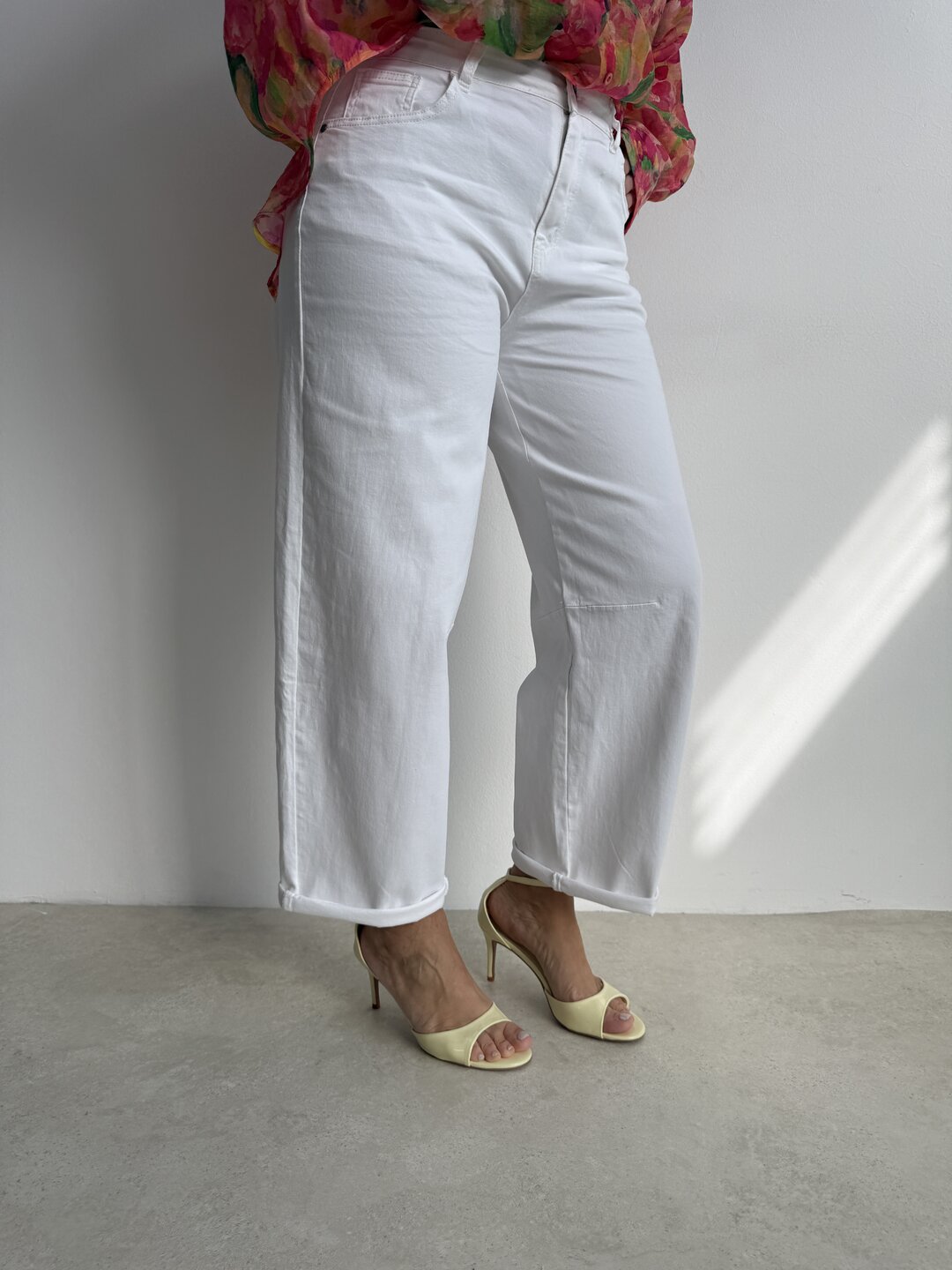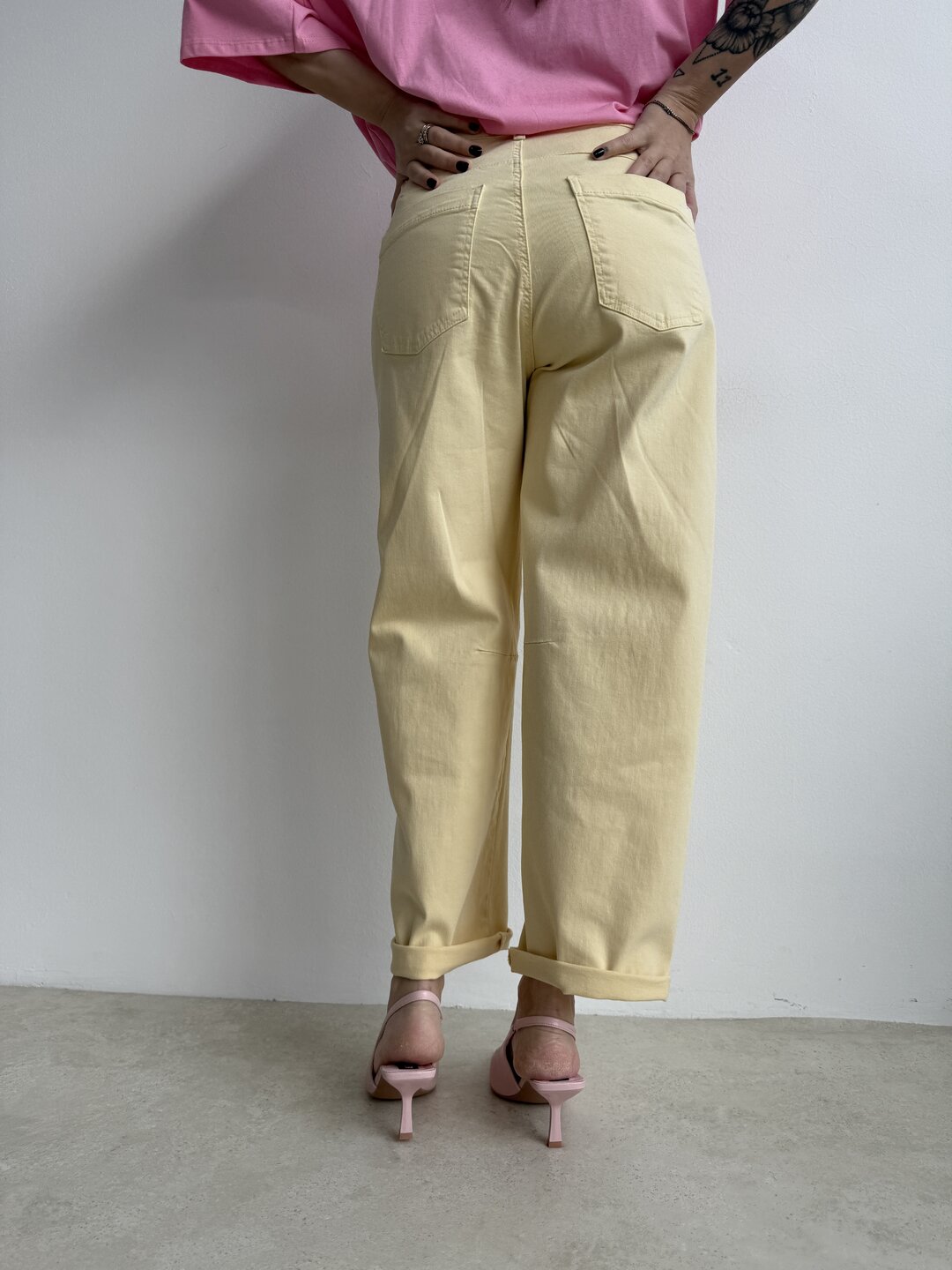 modello regolare con gamba morbida semi ovetto. Chiusura con bottone e zip. Tasche davanti e sul retro.