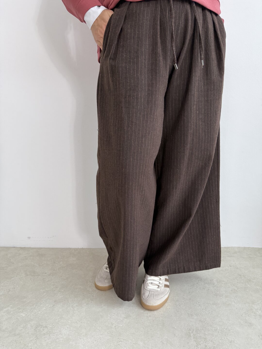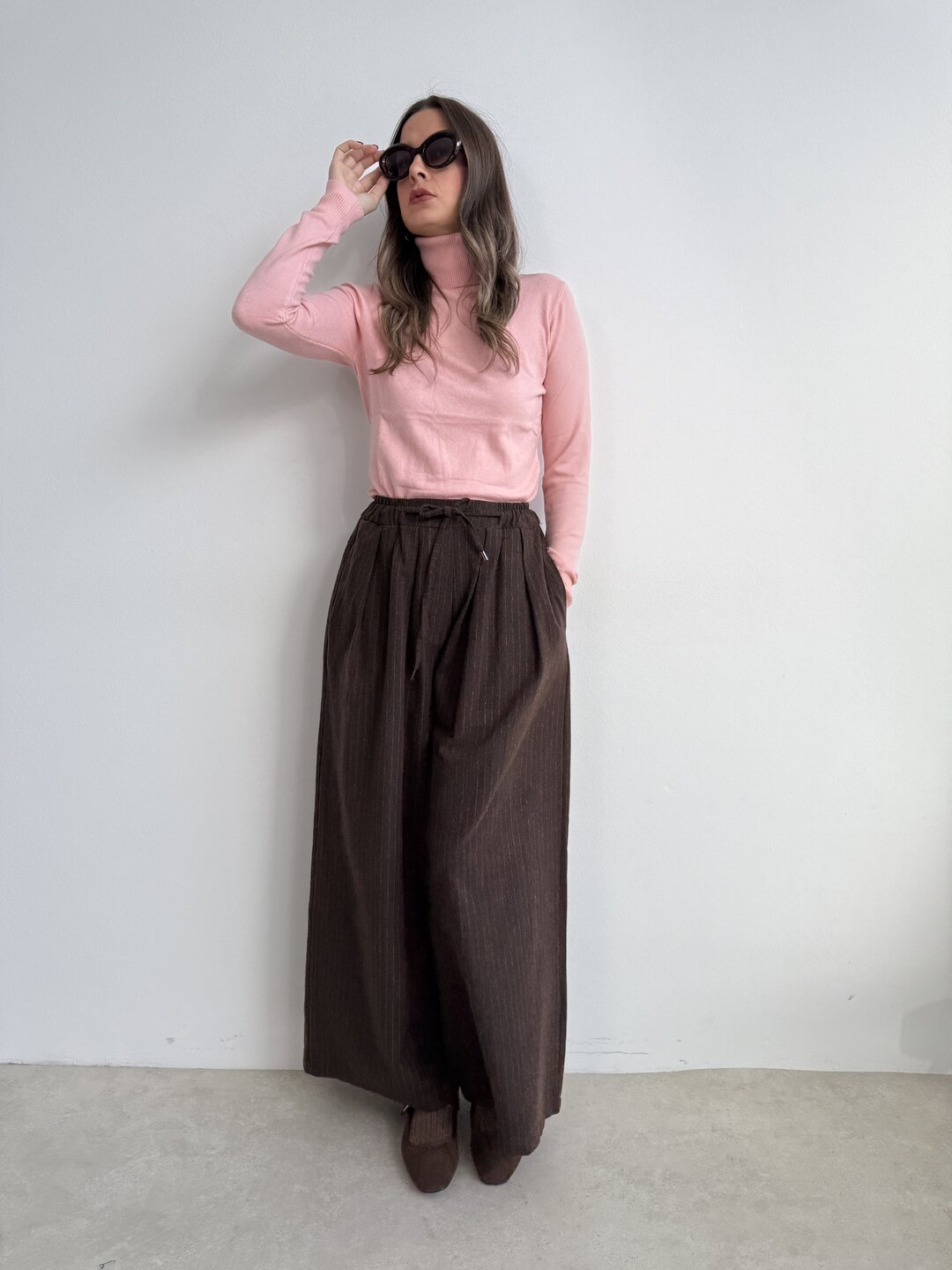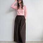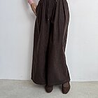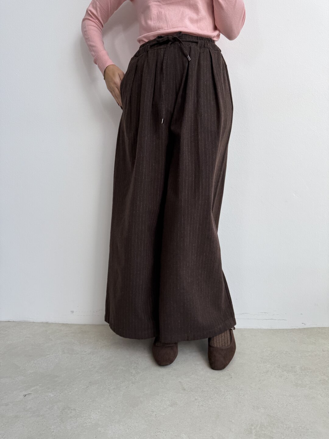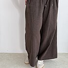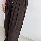 Modello ad ovetto con coulisse in vita. Tasche laterali e gamba ampia con riprese sul fondo.
